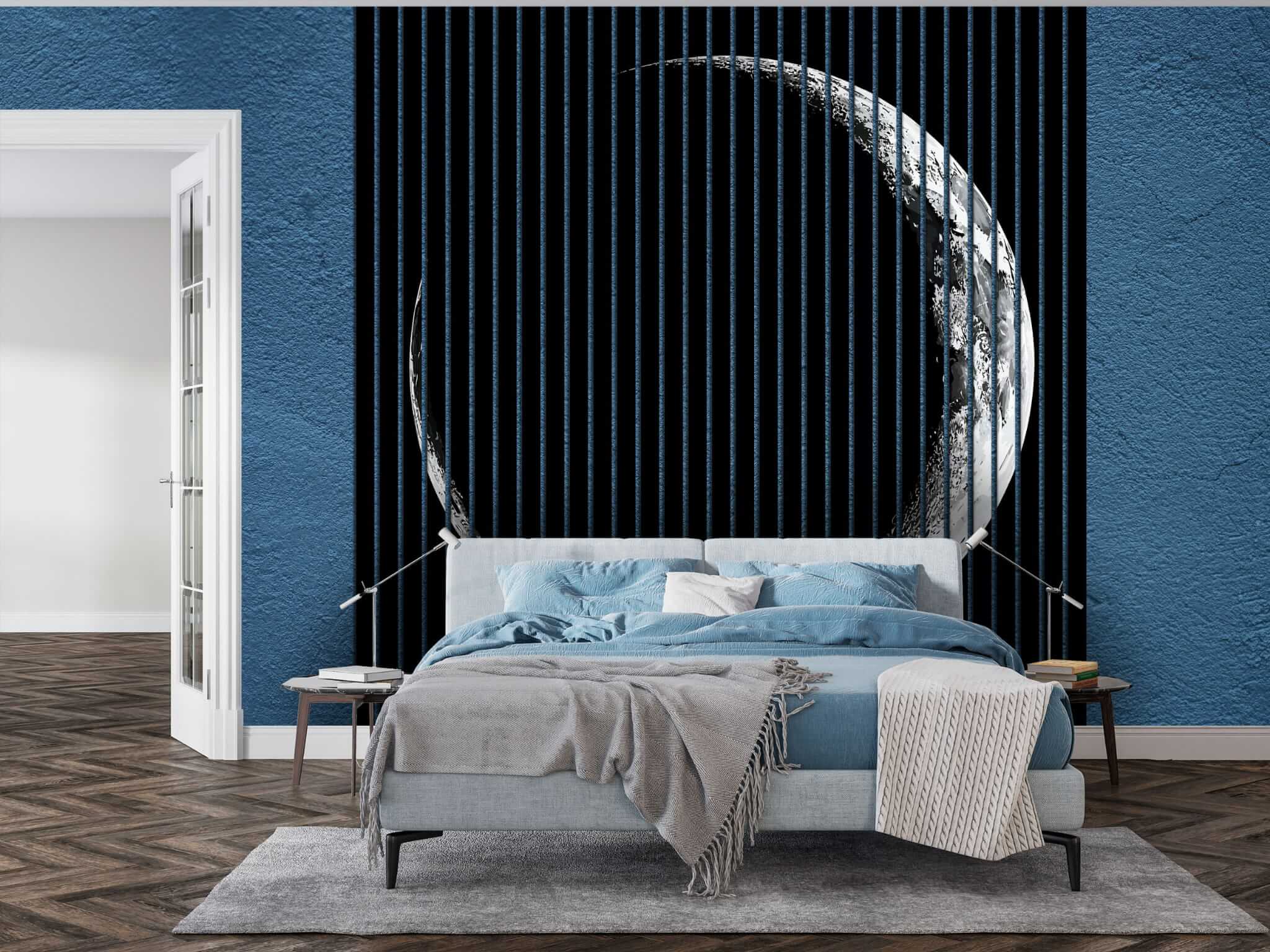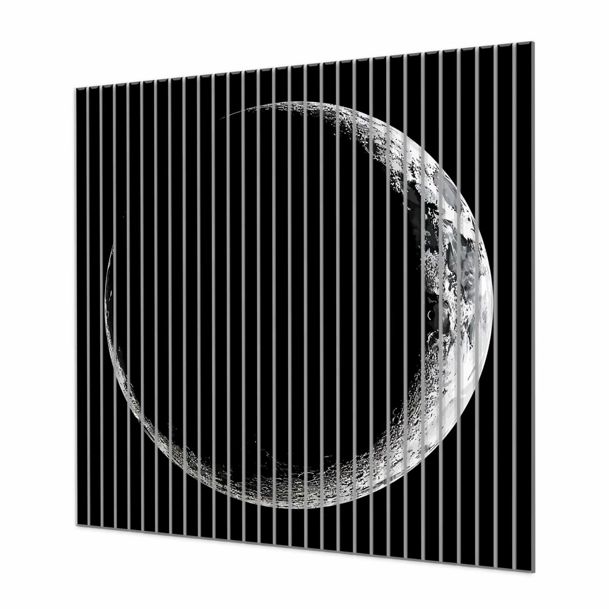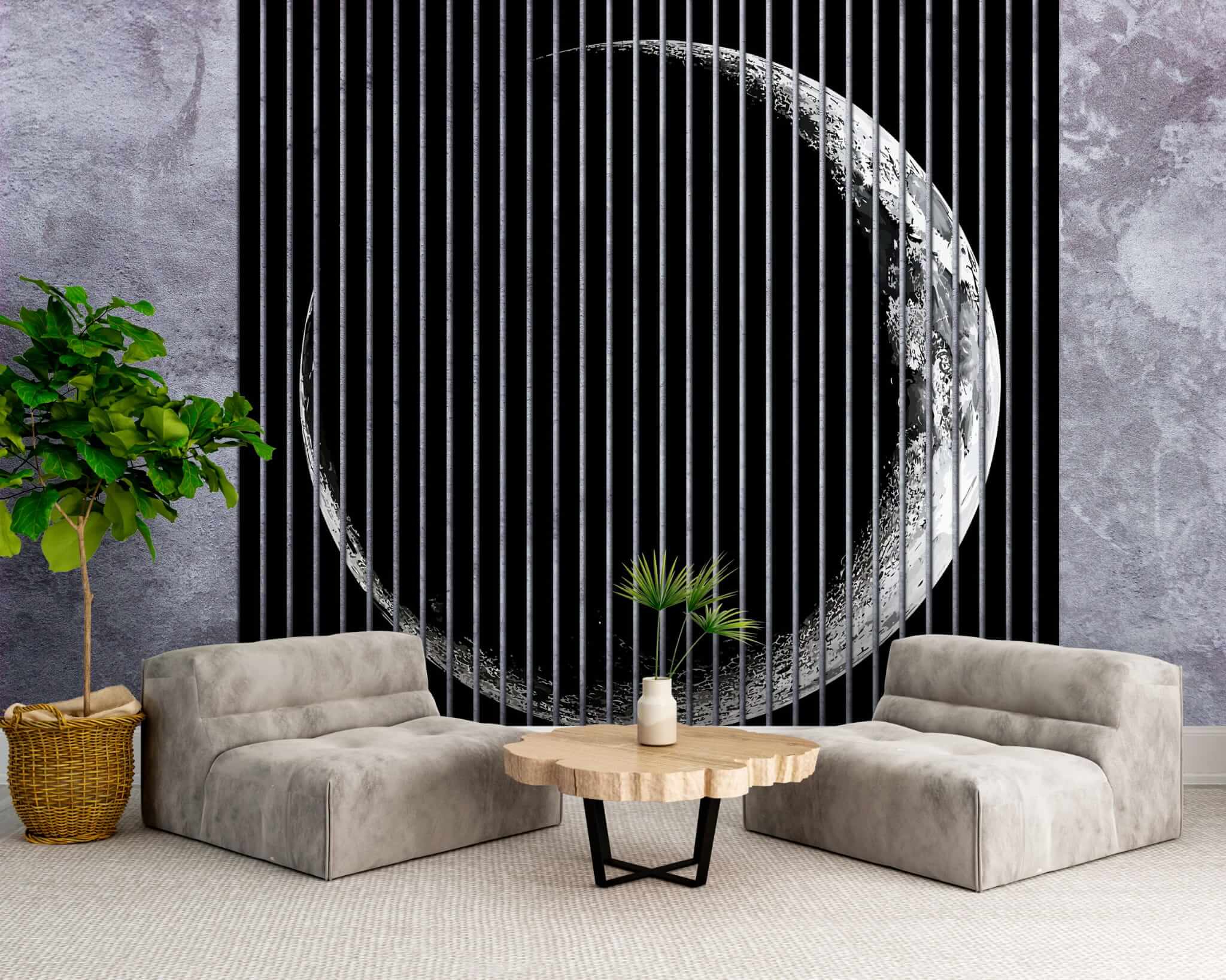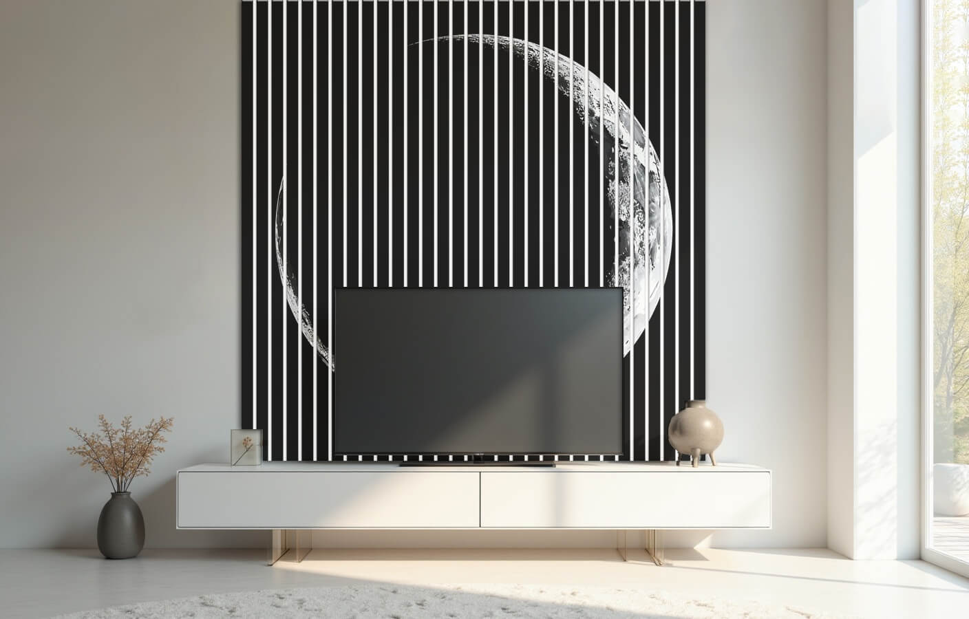 „Obraz księżyca na tle nieba” to wyjątkowy element, który wprowadza do wnętrza atmosferę spokoju, tajemniczości i elegancji. Pionowe lamele dzielą obraz przedstawiający księżyc na tle czarnego nieba, co tworzy efekt głębi i przestronności. Jasne białe linie lameli subtelnie podkreślają detale księżyca, jednocześnie nadając całości nowoczesny i artystyczny charakter.