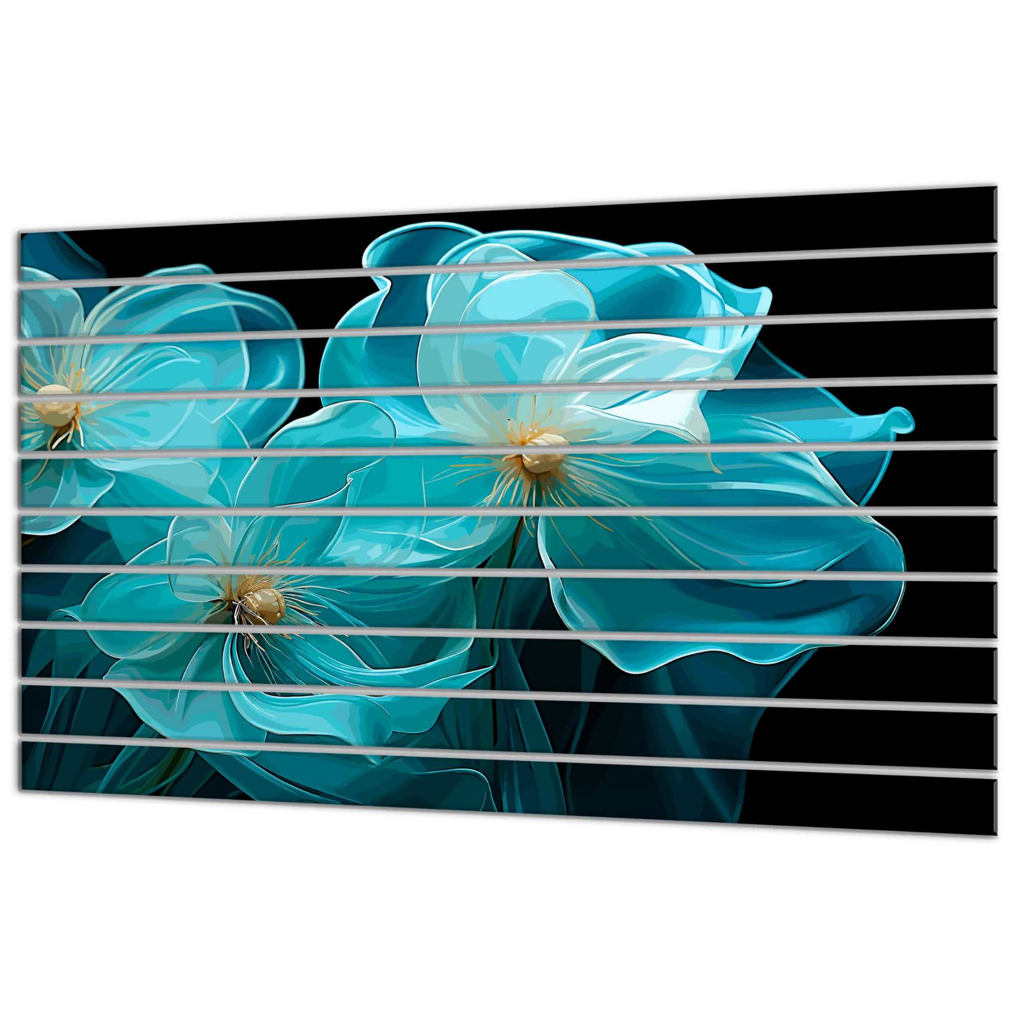 „Niebieskie kwiaty” to stylowy element dekoracyjny, który doda wyrazistego akcentu każdemu wnętrzu. Obraz przedstawia ogromne niebieskie kwiaty na ciemnym tle, podkreślając elegancję i delikatność kompozycji. Pocięte w pionowe pasy niebieskie lamele tworzą ciekawy efekt, który pozwala na postrzeganie obrazu z różnych perspektyw, nadając wnętrzu nowoczesny wygląd.