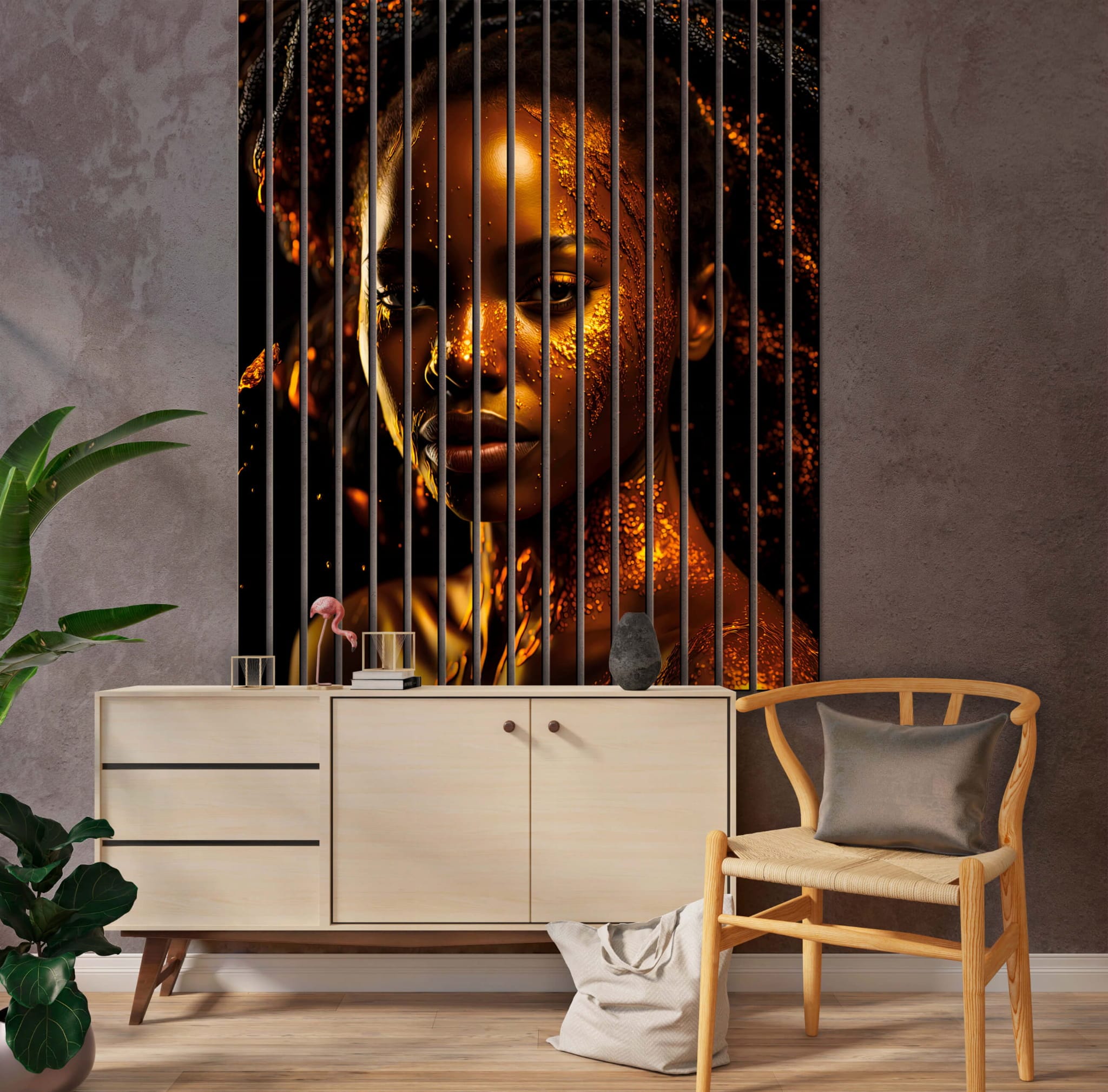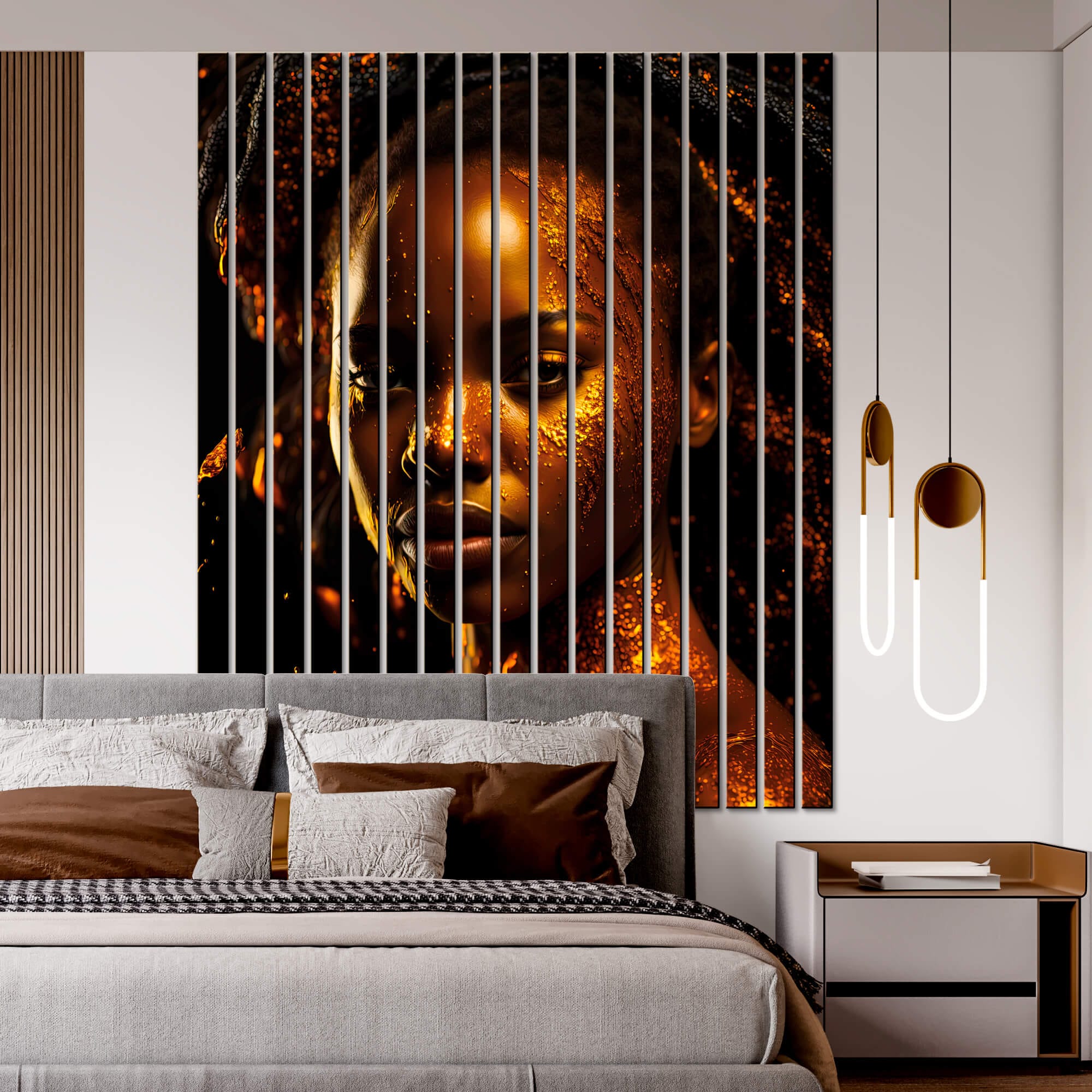 z motywem „Złotej magii Afryki”. Panele przedstawiają unikalne, złote akcenty inspirowane afrykańskimi wzorami i motywami, które tworzą egzotyczną i tajemniczą atmosferę. Złote detale na tle ciemniejszych odcieni wprowadzają do wnętrza element luksusu i wyjątkowej magii Afryki. Idealne do przestrzeni z afrykańskimi lub etnicznymi akcentami.