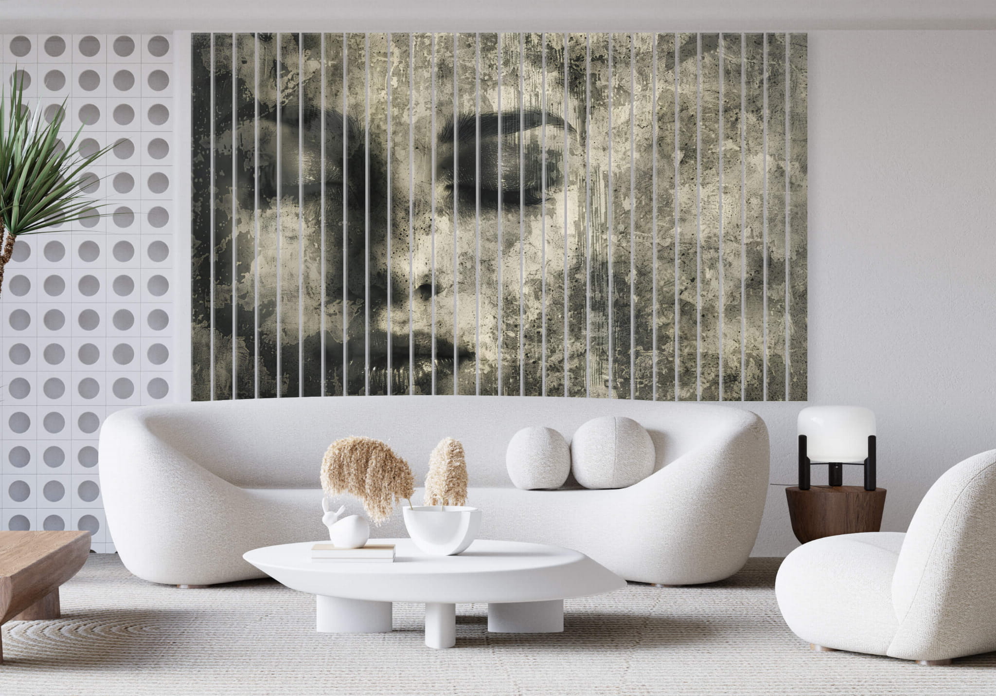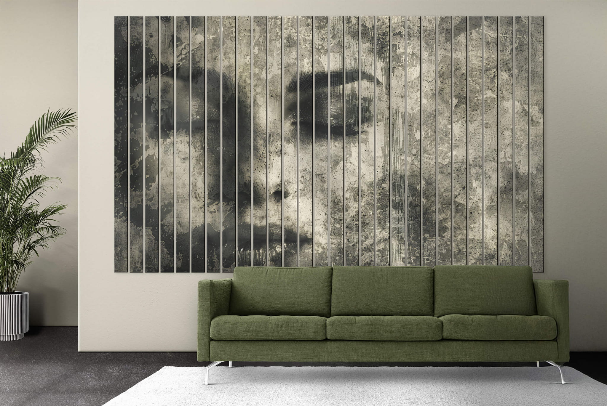 Dom • Katalog • LAMELE ŚCIENNE • LAMELE ŚCIENNE SZKLANE • Grafitowe lamele ścienne szklane z nadrukiem – Kamienna dusza portret kobiety