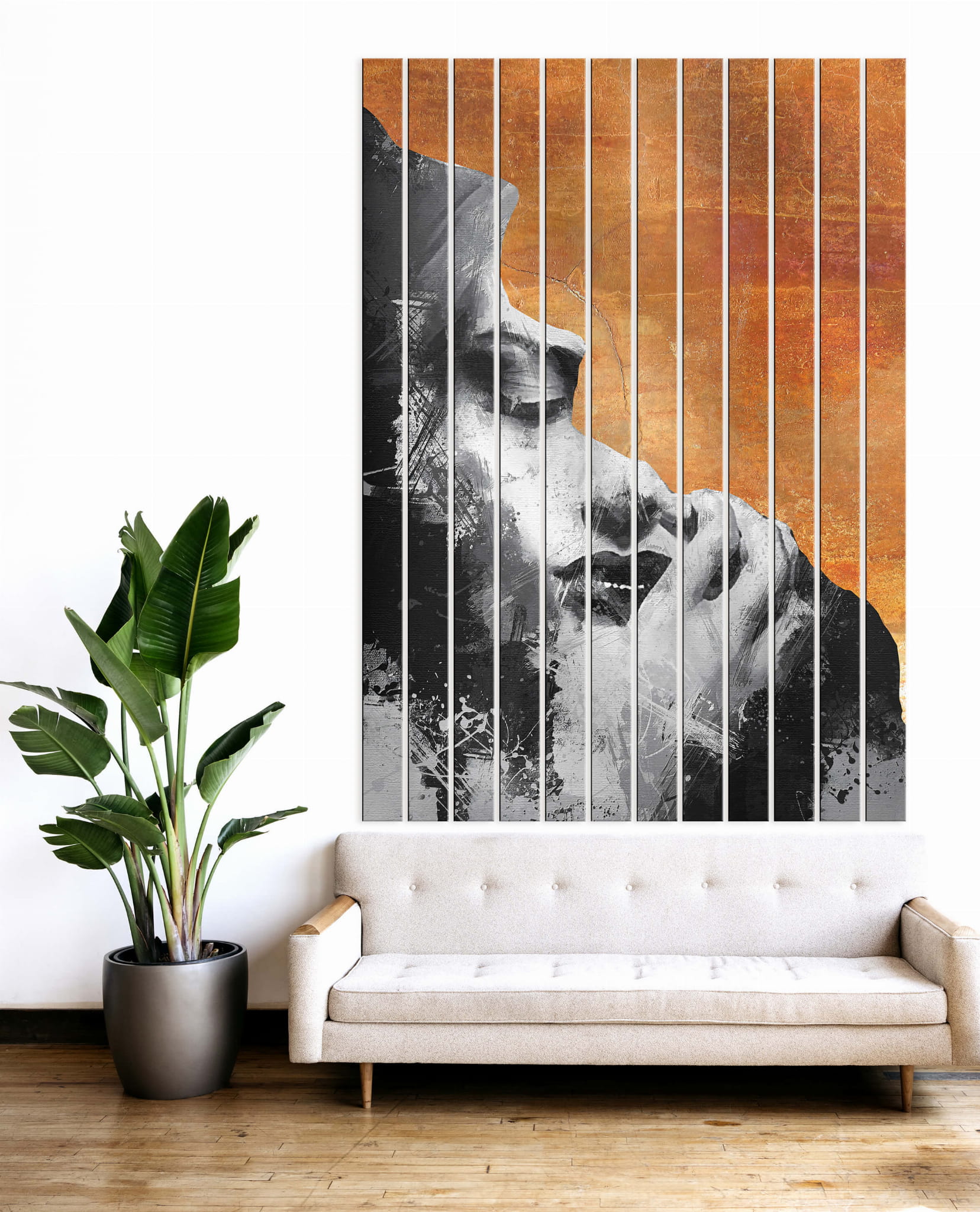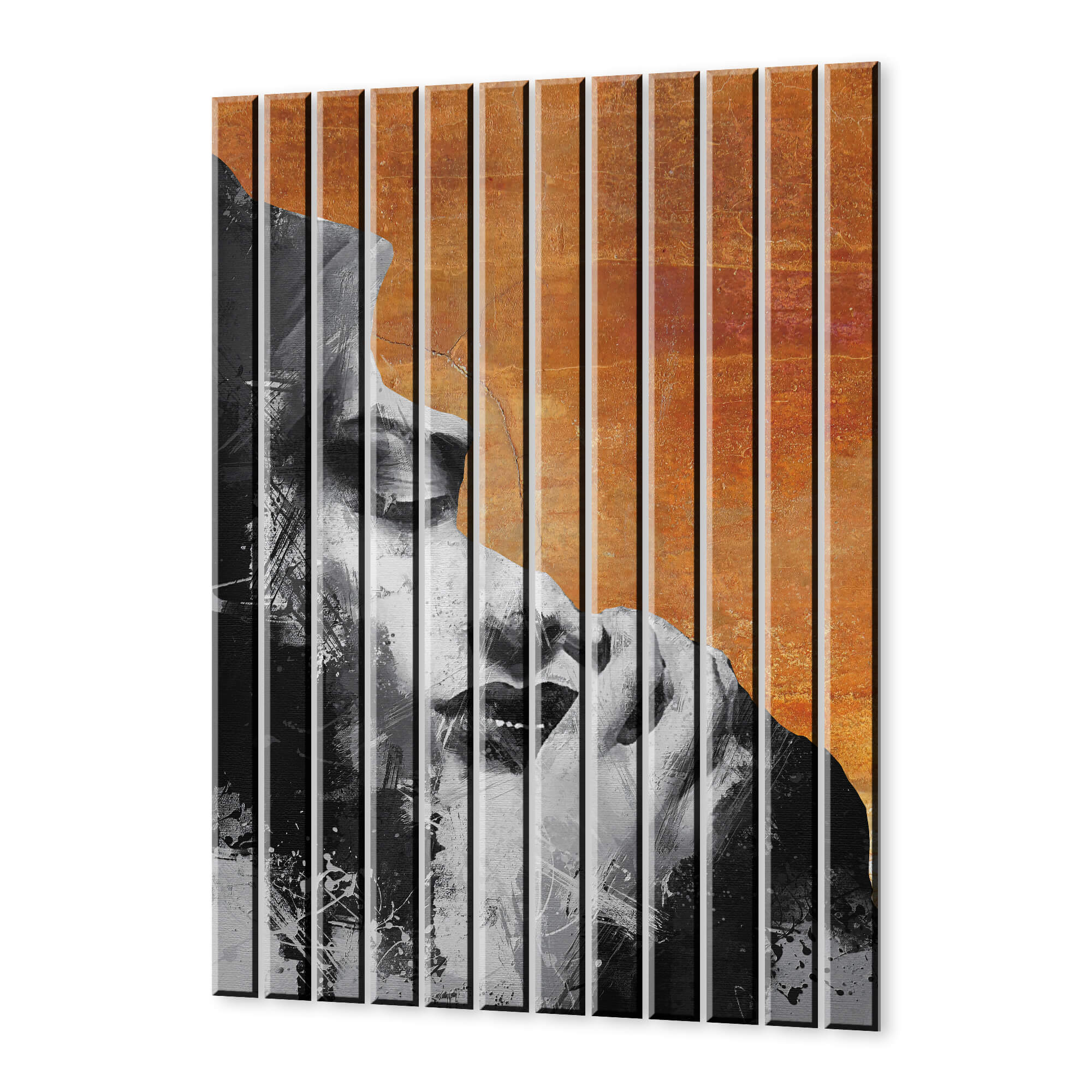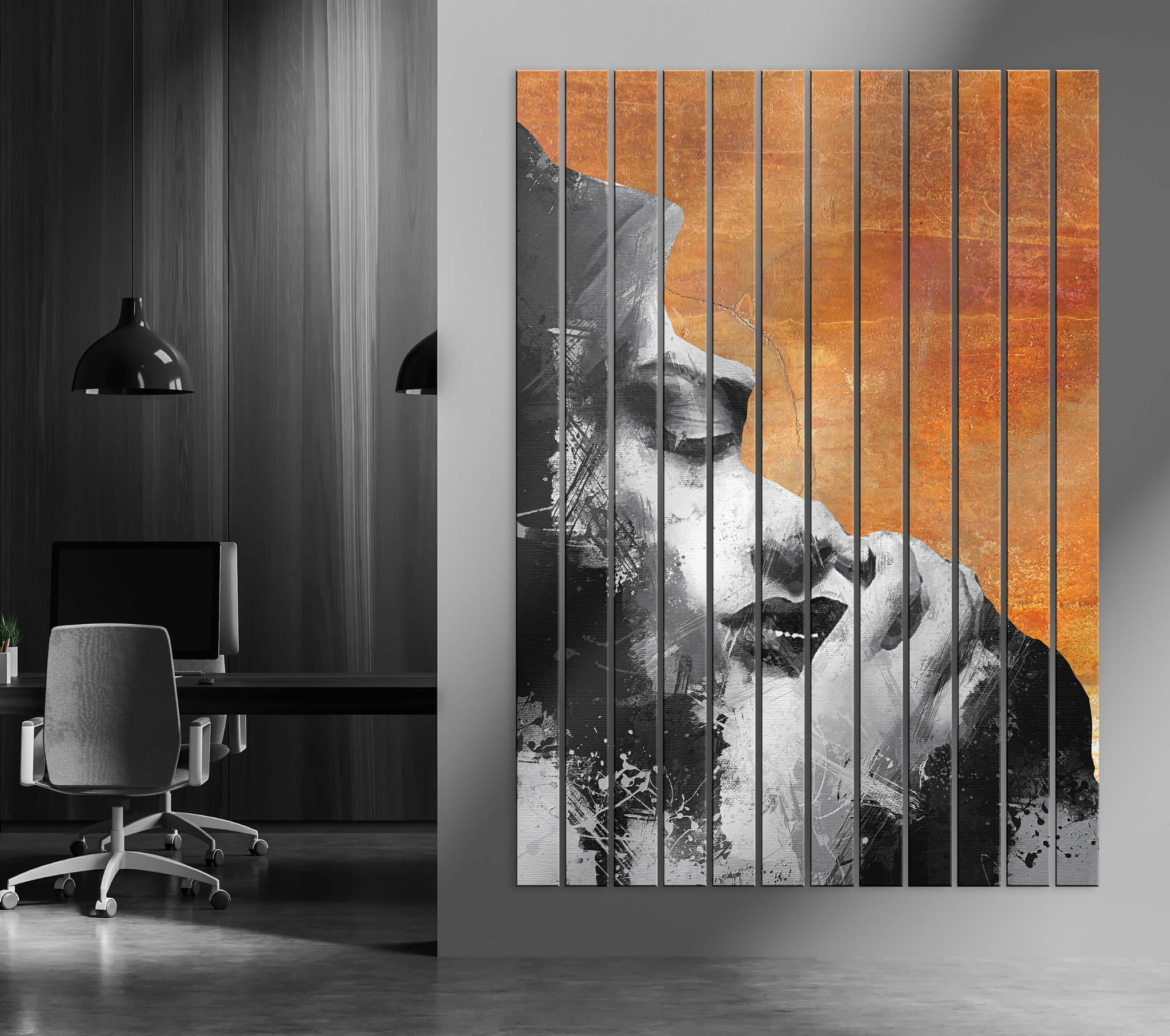 Dom • Katalog • LAMELE ŚCIENNE • LAMELE ŚCIENNE SZKLANE • Lamele dekoracyjne szklane – Portret kobiety kontrast czerni i pomarańczowego