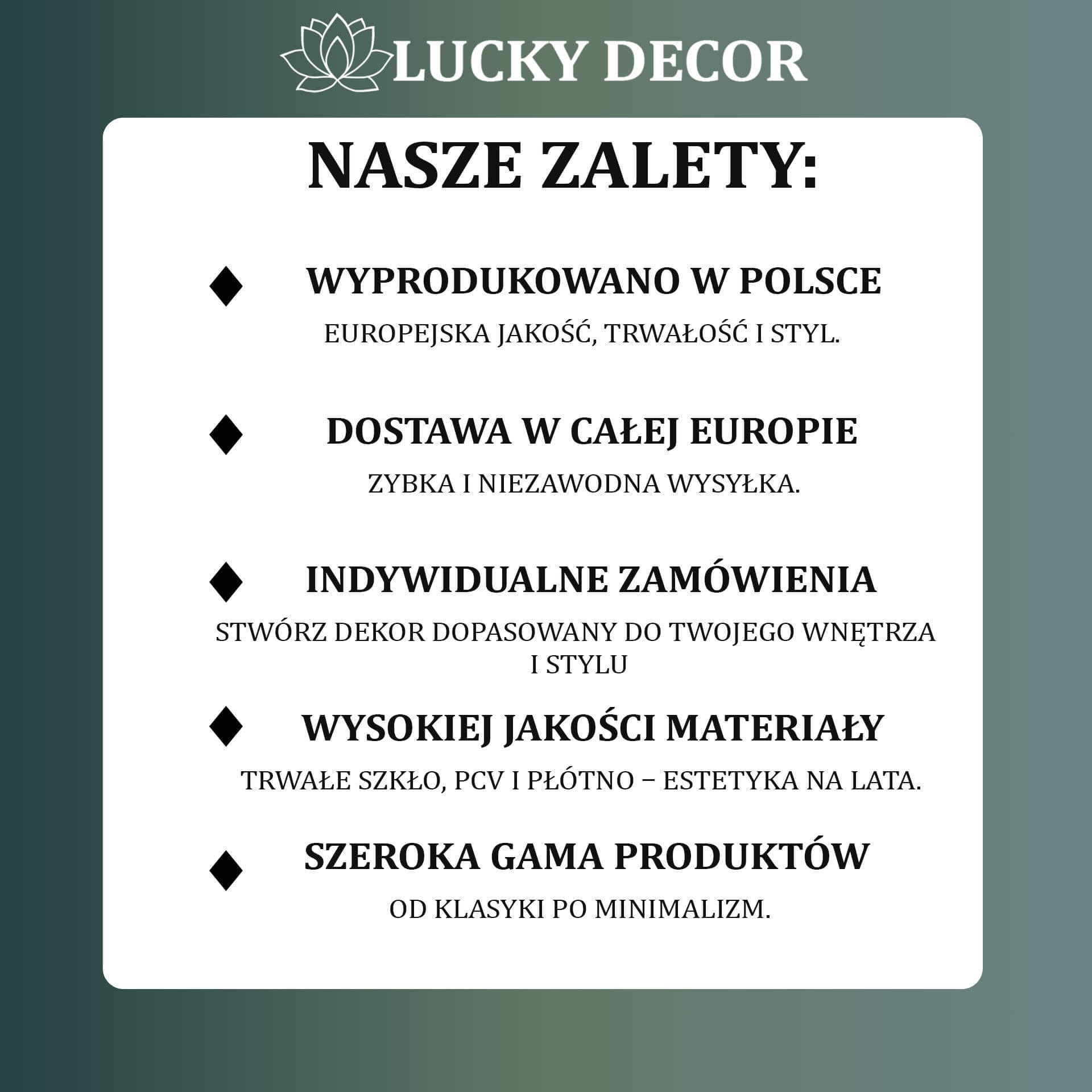 Tak, oferujemy możliwość personalizacji. Możesz zamówić lamele z własnym wzorem lub grafiką. Wystarczy napisać do nas na adres luckydekor.pl@gmail.com lub zadzwonić pod numer +48 576 744 428.