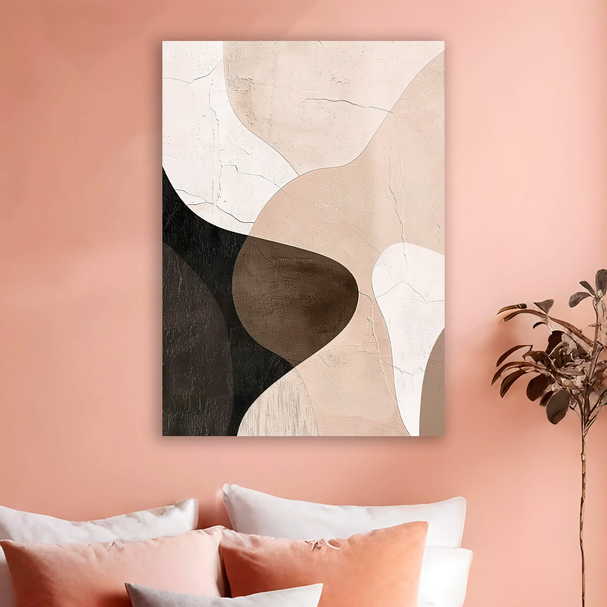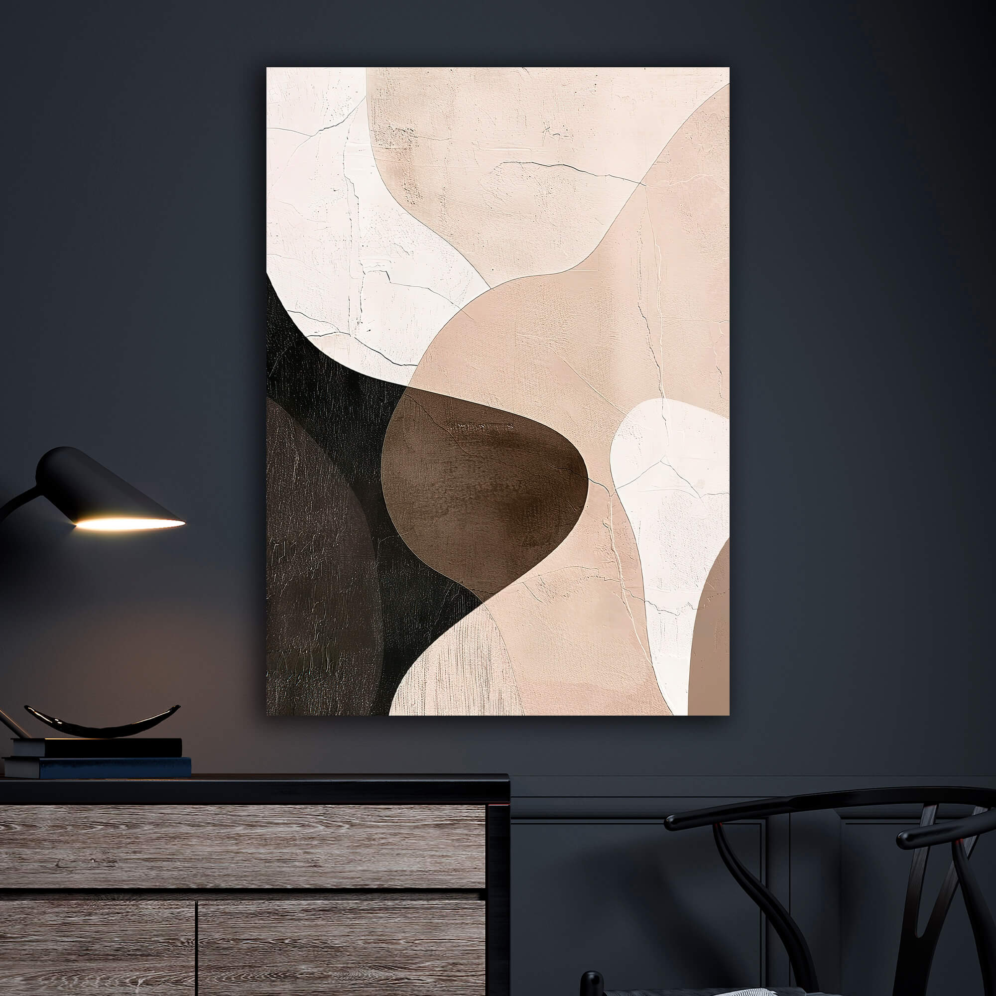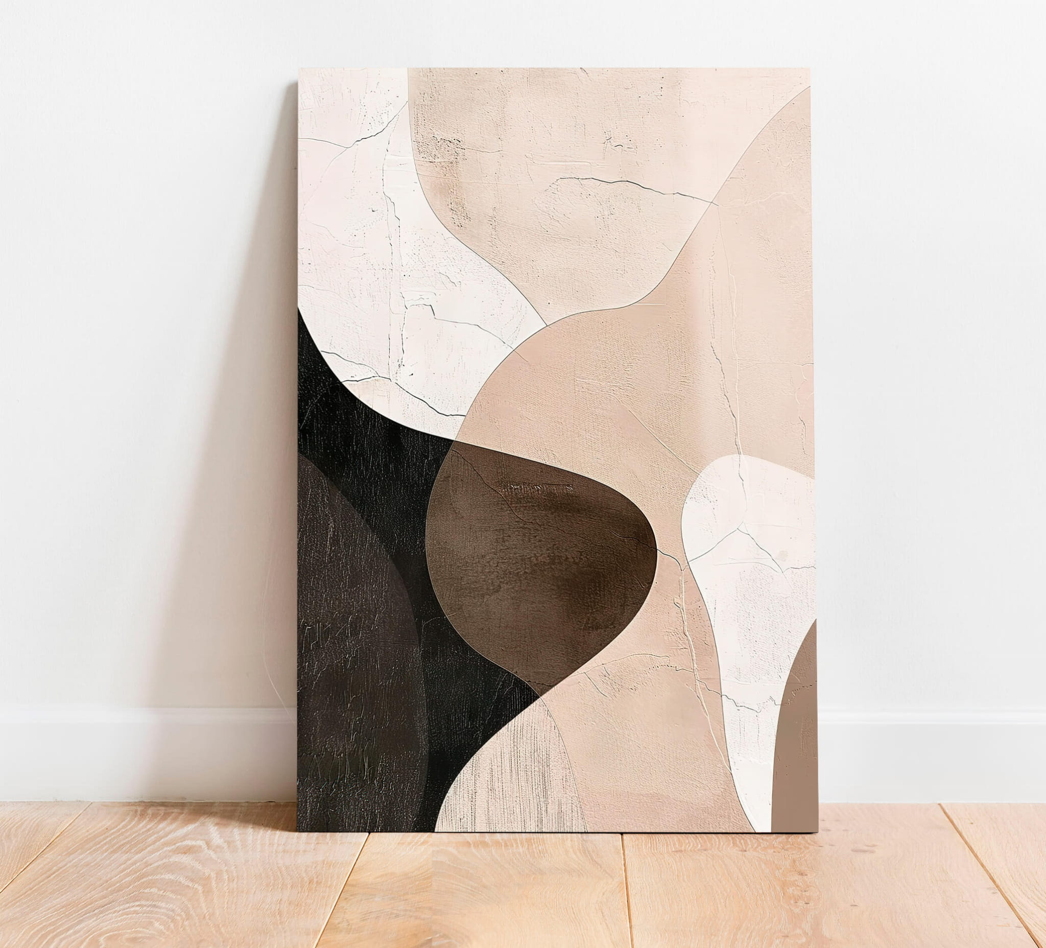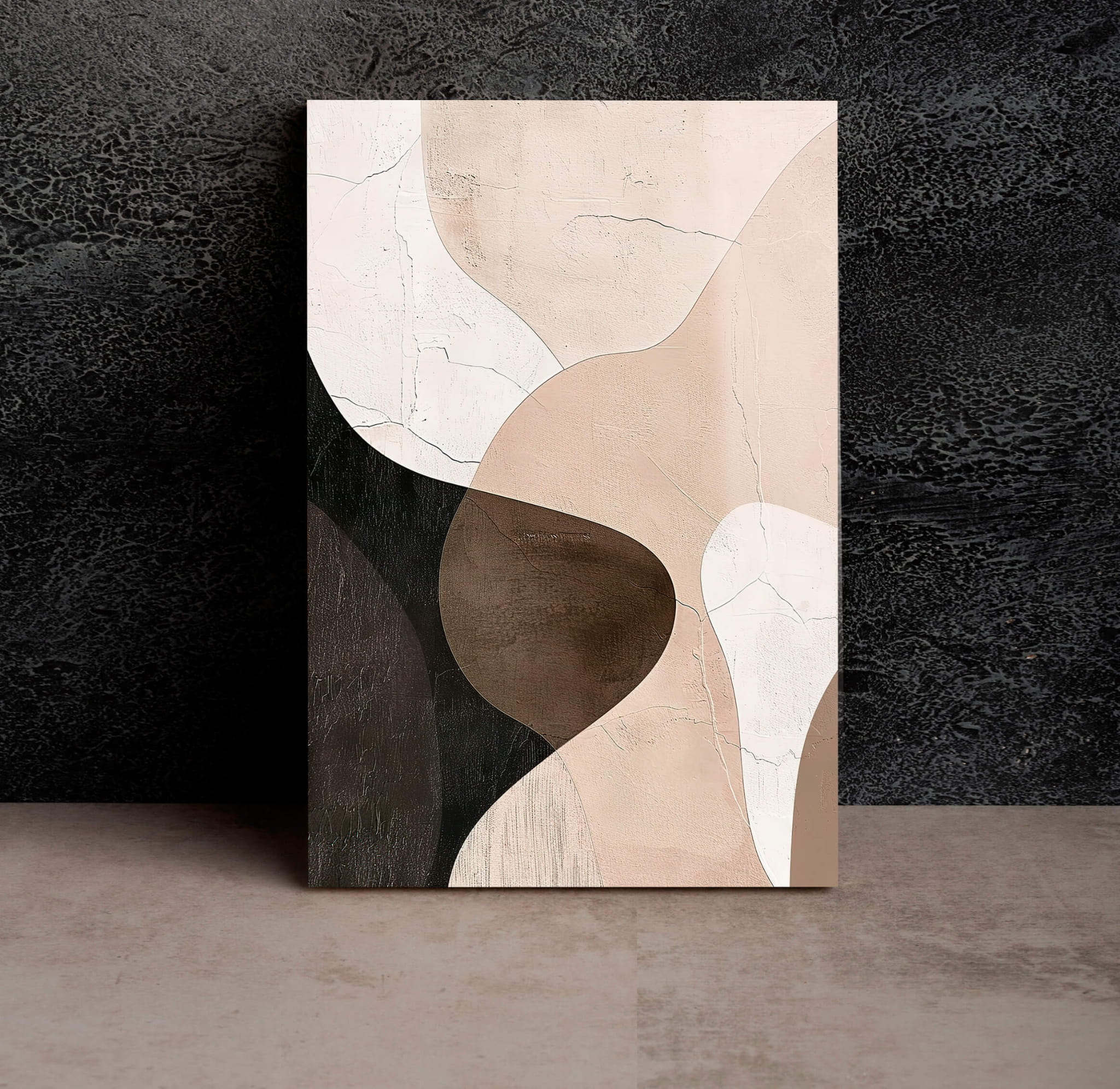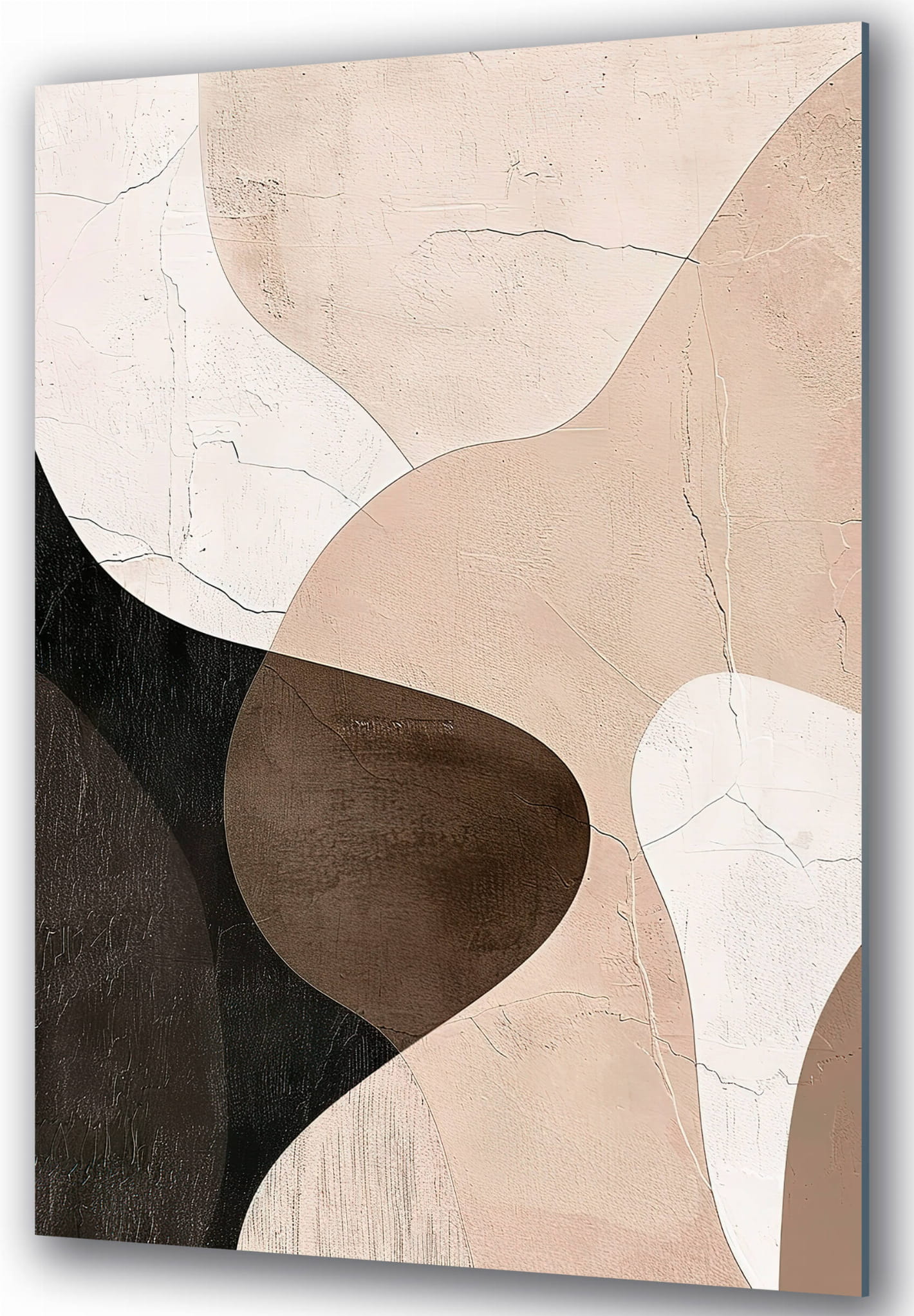 „Abstrakcja w Pastelowych Kolorach”. Ten obraz na szkle odzwierciedla estetykę minimalizmu poprzez miękkie krzywizny kształtów i harmonię naturalnych kolorów. Szklane obrazy, odcienie beżu, bieli i ciemnego brązu tworzą wykwintną kompozycję, która podkreśla spokój i elegancję.