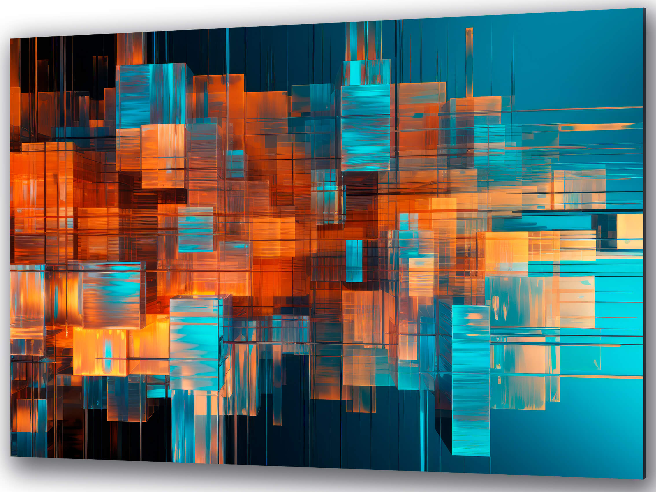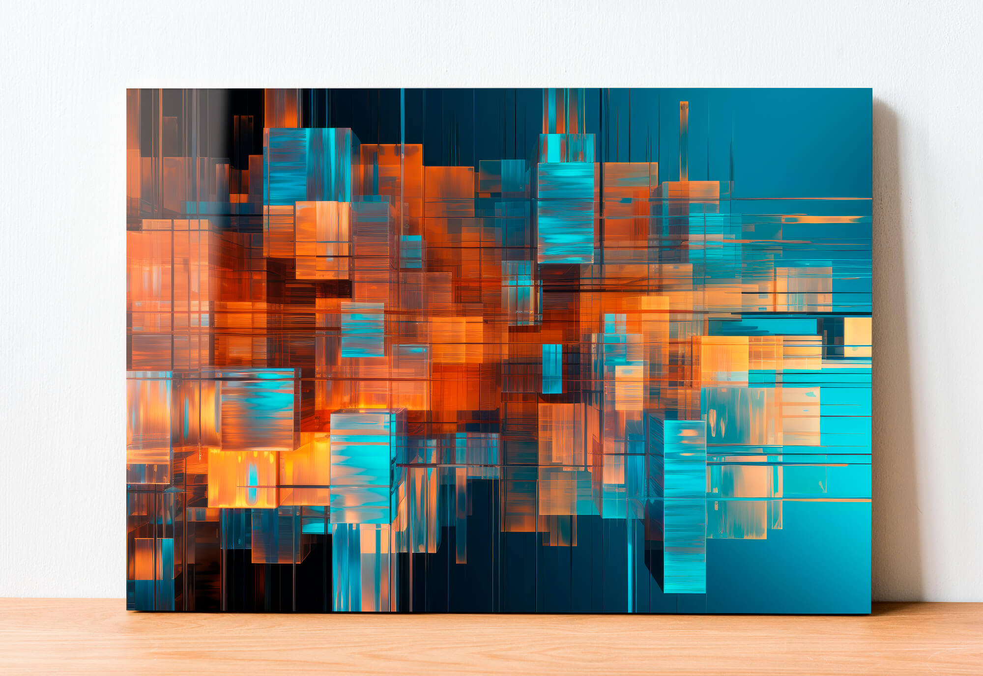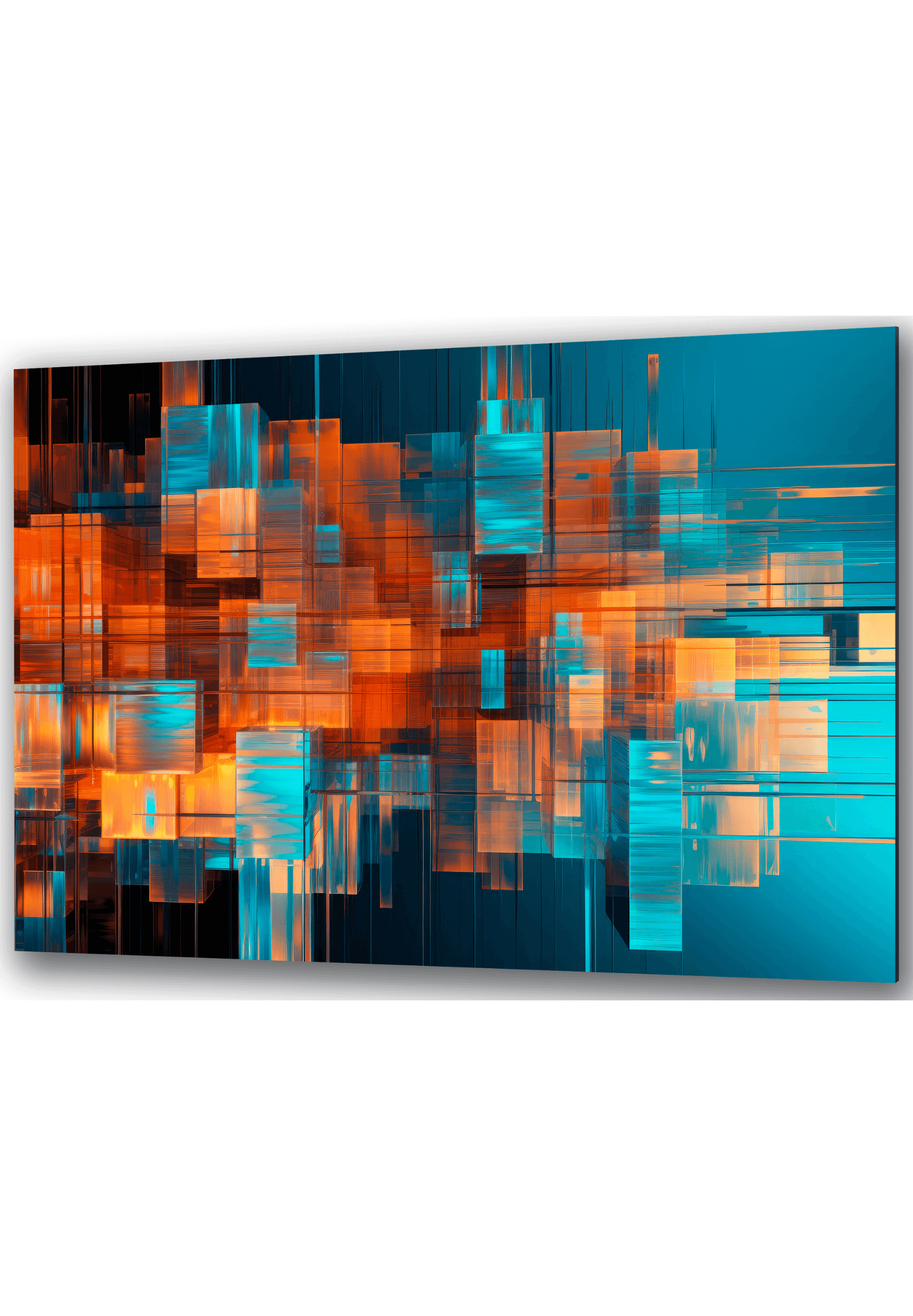 „Abstrakcyjna gra kolorów i form” to współczesne dzieło sztuki abstrakcyjnej, które urzeka dynamiką i głębią. Połączenie bogatych odcieni pomarańczy i zimnego błękitu tworzy wrażenie gry światła i cienia, dodając kompozycji objętości i perspektywy.