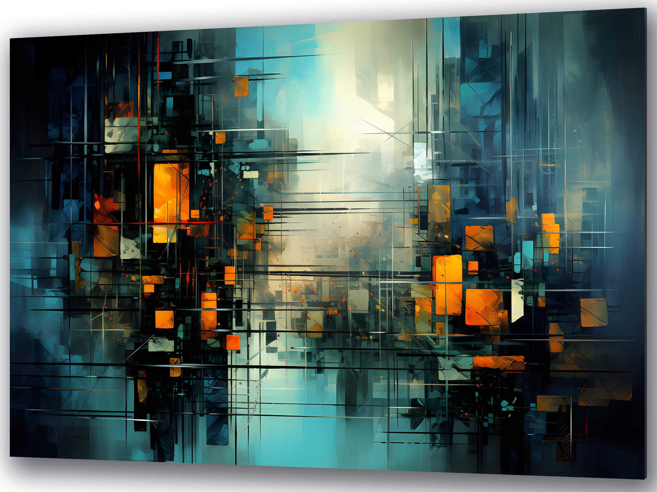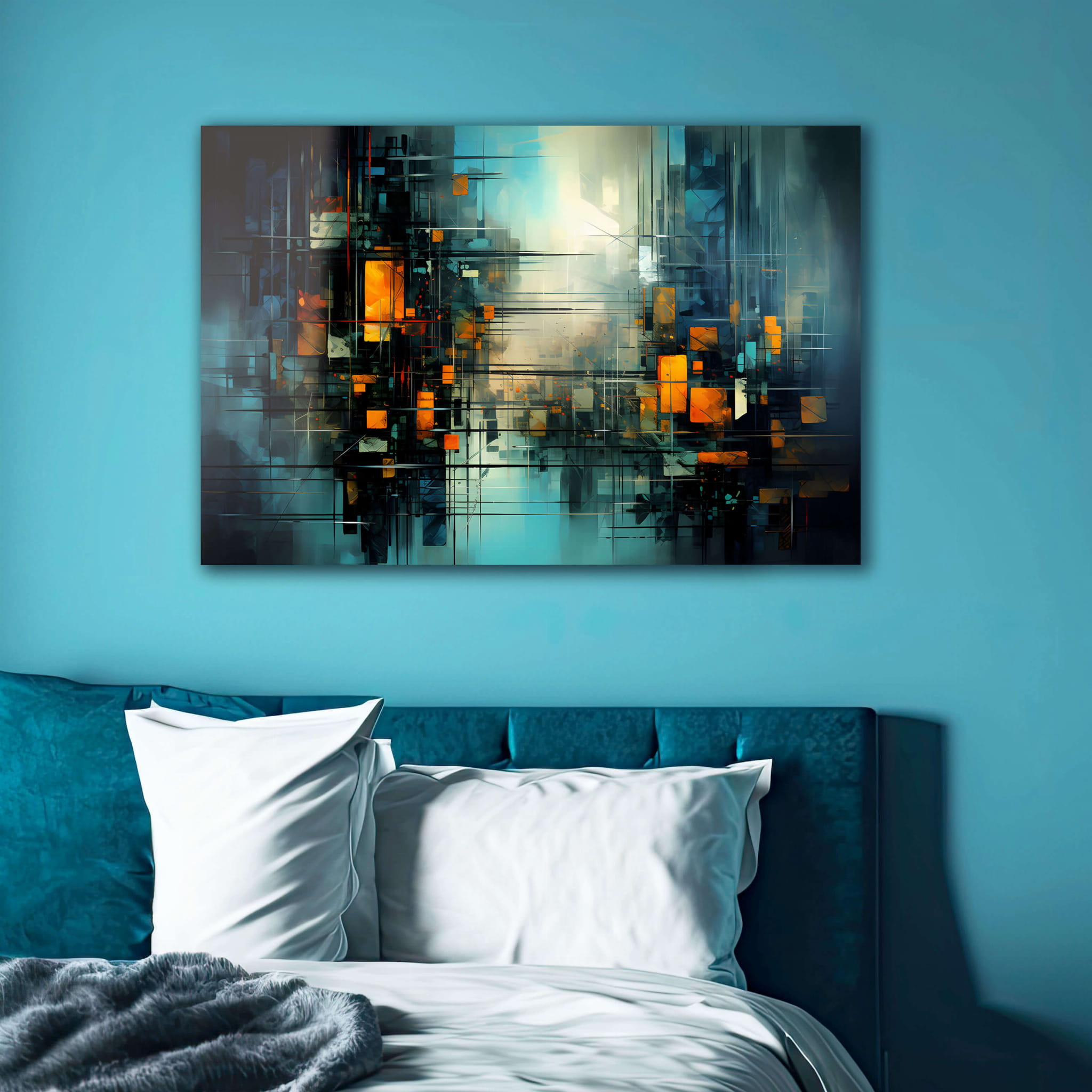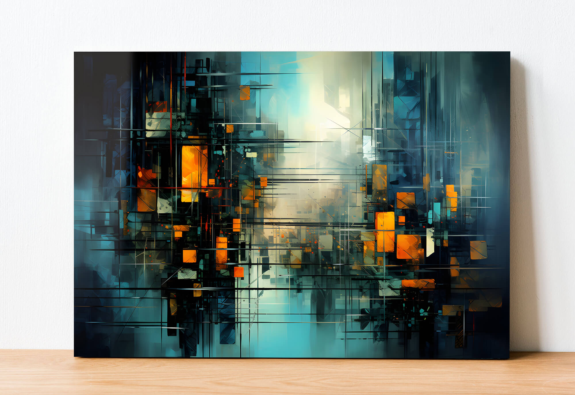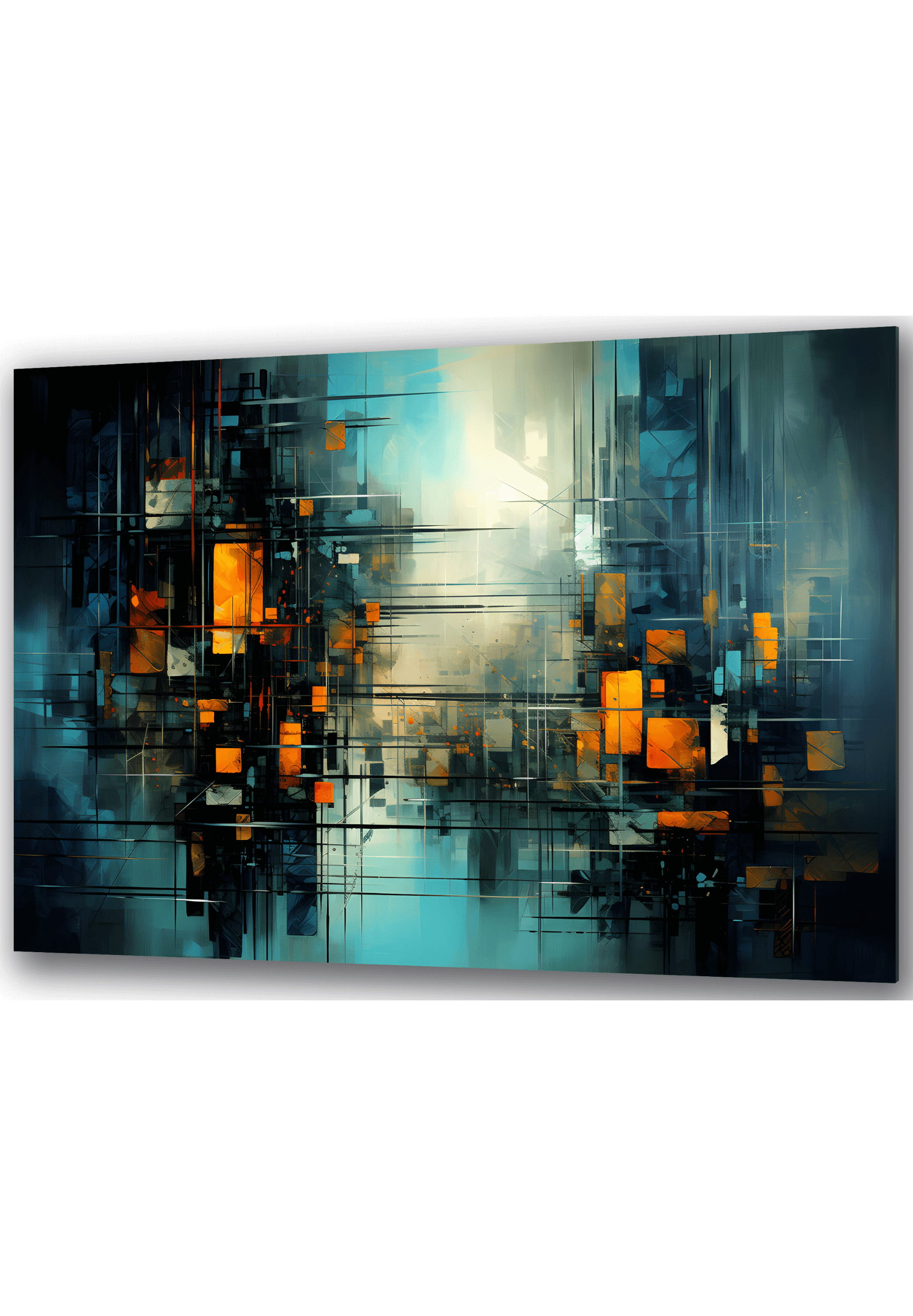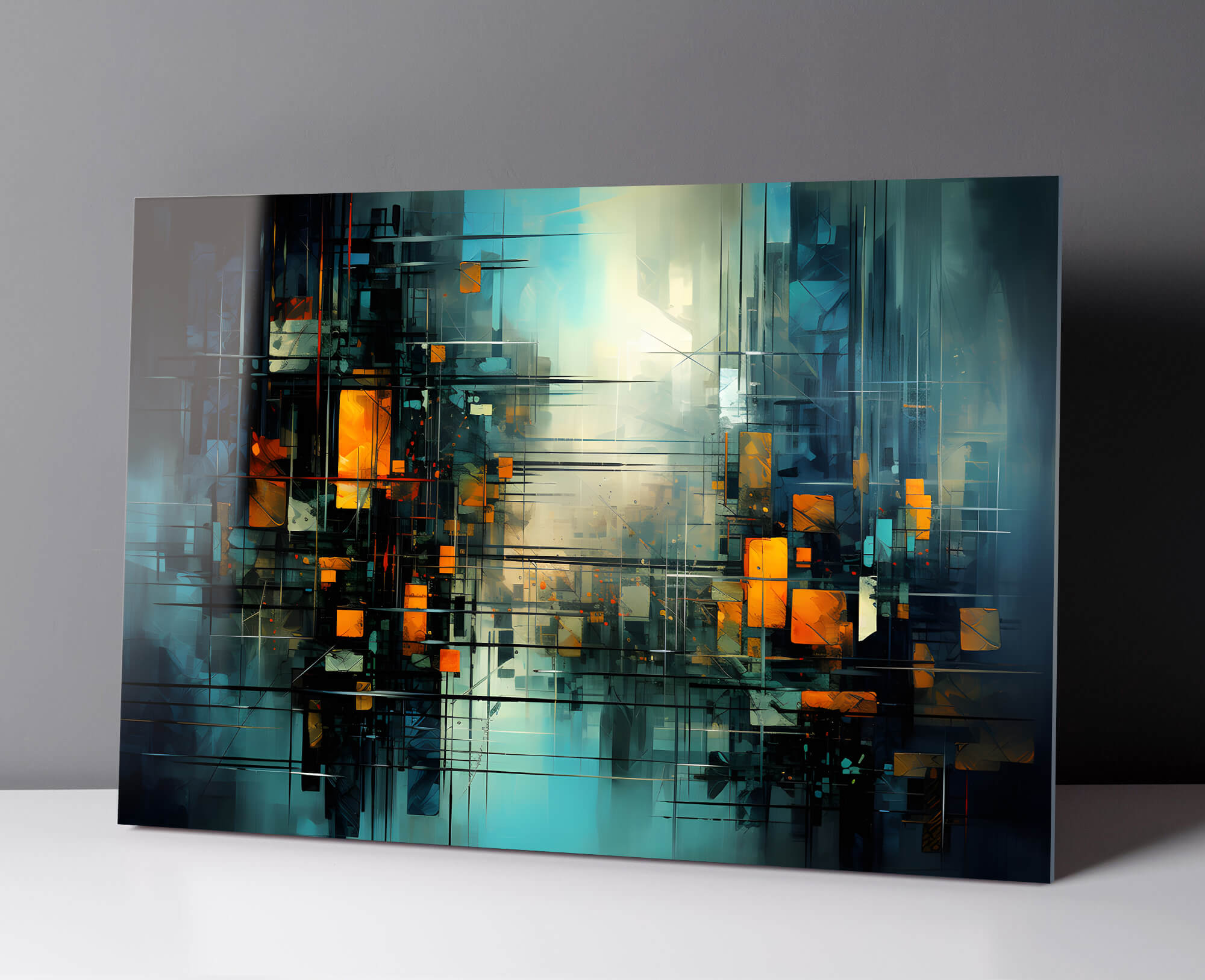 „Geometryczna Przestrzeń”. Ten obraz na szkle oddaje dynamikę i atmosferę nowoczesnej metropolii. Abstrakcyjna kompozycja z geometrycznymi kształtami i liniami tworzy wrażenie niekończącej się przestrzeni miejskiej, która żyje własnym rytmem. Głębokie odcienie błękitu i turkusu harmonijnie łączą się z ciepłymi akcentami pomarańczy, symbolizując światło i życie wśród struktur architektonicznych.