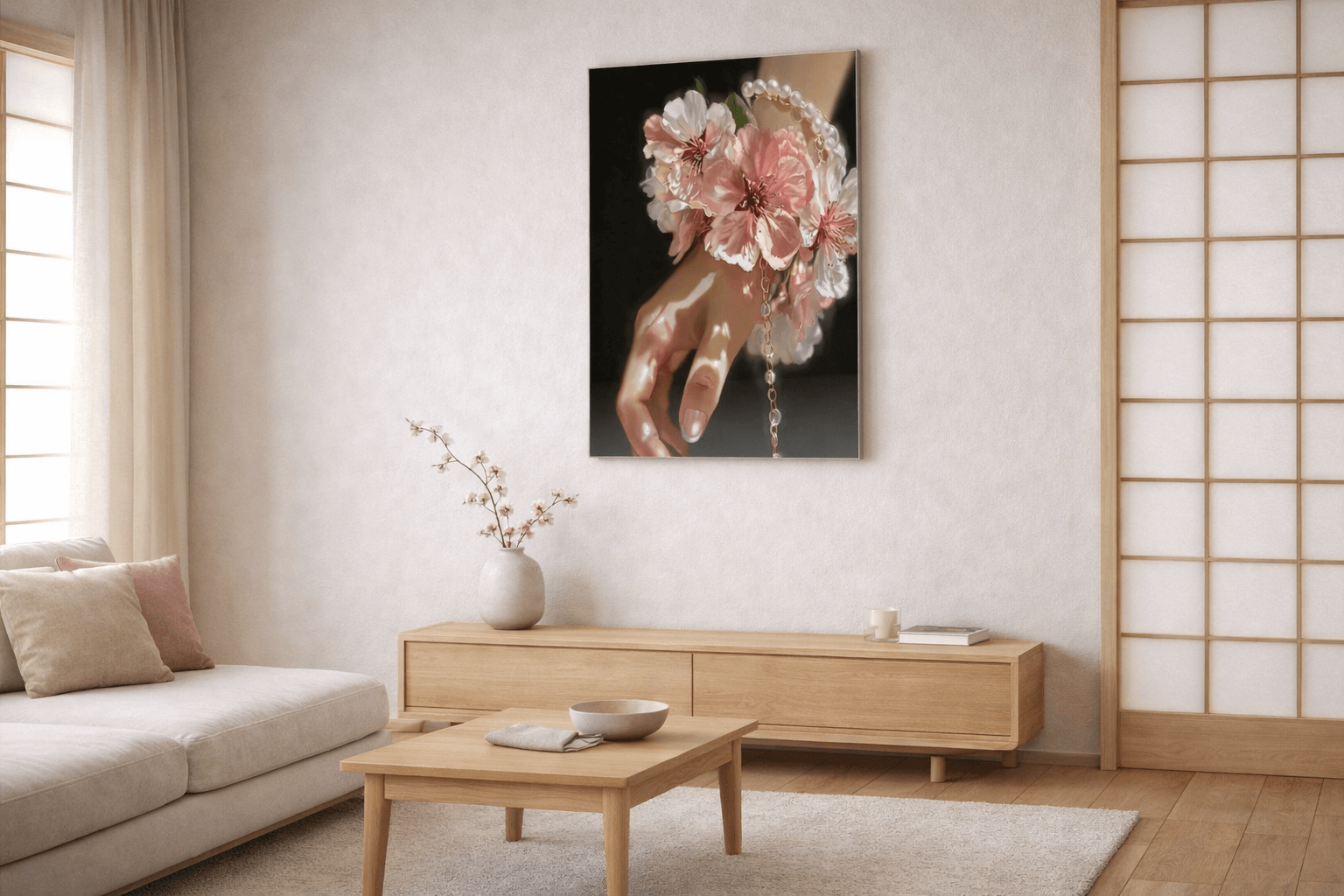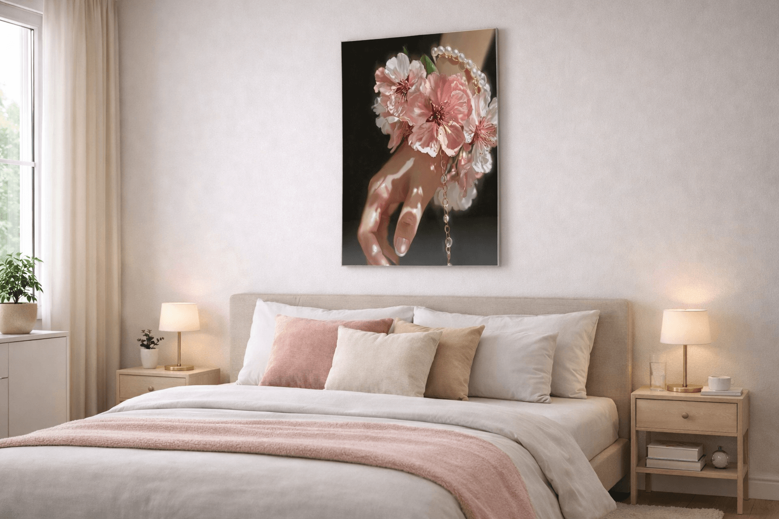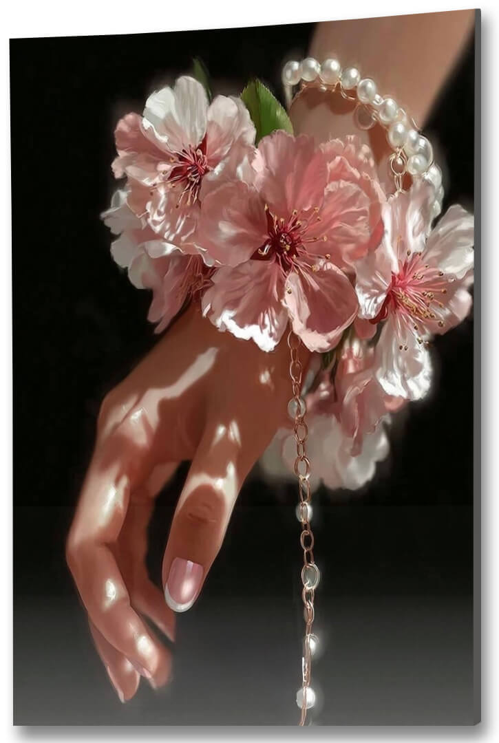 Obraz na szkle „Kwiaty na nadgarstku” to subtelna i elegancka kompozycja, w której delikatne kwiaty oplatają nadgarstek niczym biżuteria. Motyw ten symbolizuje kobiecość, lekkość i harmonię natury z pięknem detalu. Miękkie przejścia barw, pudrowe odcienie różu oraz połyskujące akcenty nadają dziełu zmysłowego, a zarazem wyrafinowanego charakteru. Nastrojowe światło podkreśla finezję formy, tworząc obraz pełen spokoju i elegancji. To dekoracja, która doskonale dopełni wnętrze salonu, sypialni lub gabinetu, wprowadzając atmosferę delikatności i artystycznego stylu.
