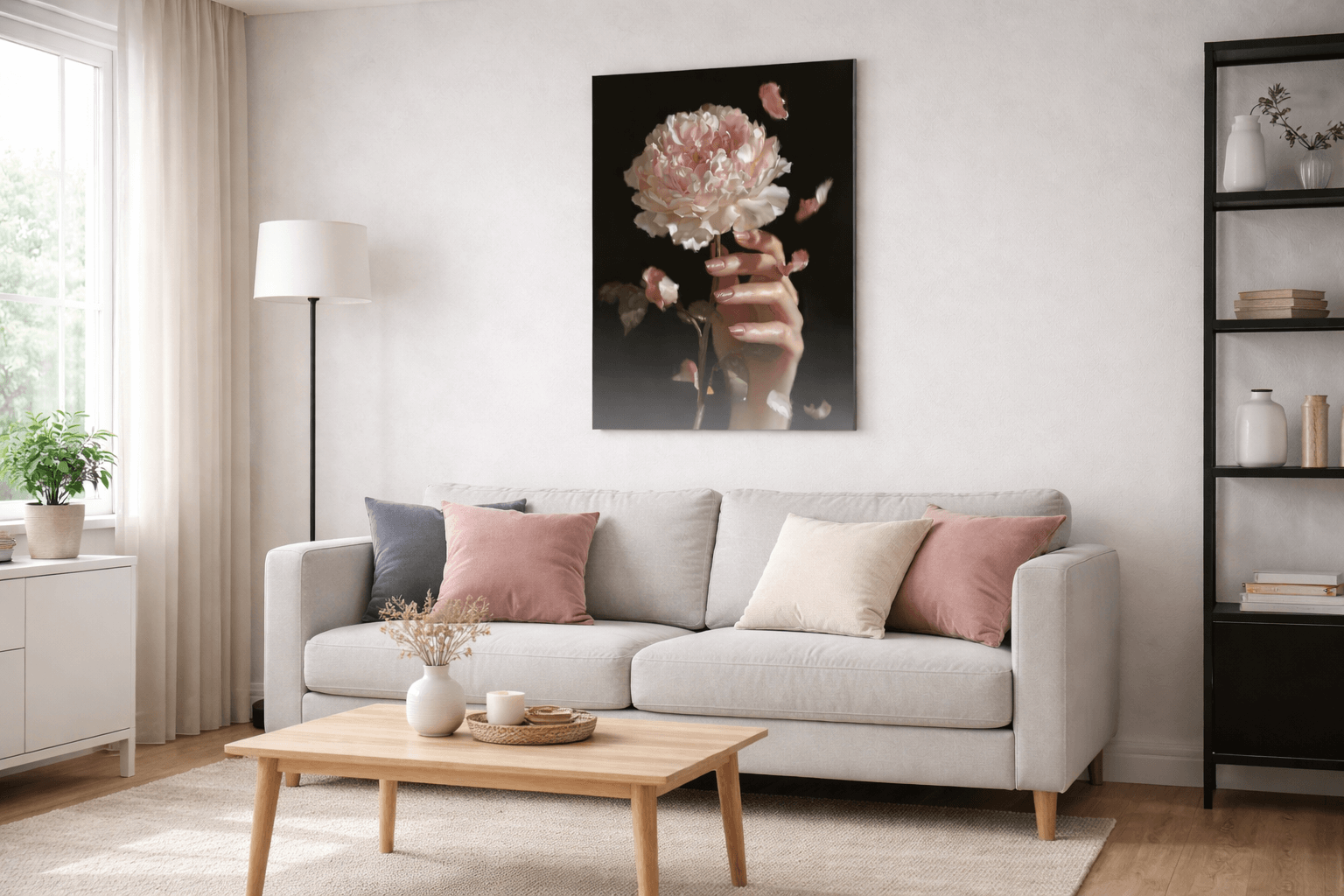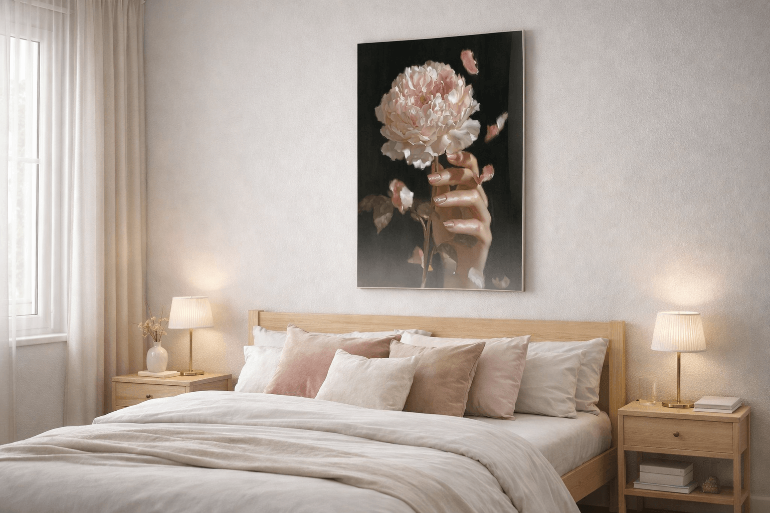 Obraz na szkle „Piwonia w dłoni” to subtelna i zmysłowa kompozycja, ukazująca delikatną piwonię trzymaną w dłoni. Motyw kwiatu symbolizuje piękno, harmonię i kruchość chwili, a miękkie przejścia barw oraz aksamitne odcienie różu nadają dziełu romantyczny, elegancki charakter. Nastrojowe światło i starannie dopracowane detale tworzą atmosferę spokoju i intymności, czyniąc obraz wyjątkowym akcentem dekoracyjnym. Doskonale sprawdzi się w salonie, sypialni lub gabinecie, wprowadzając do wnętrza ciepło, subtelną elegancję i artystyczną wrażliwość.