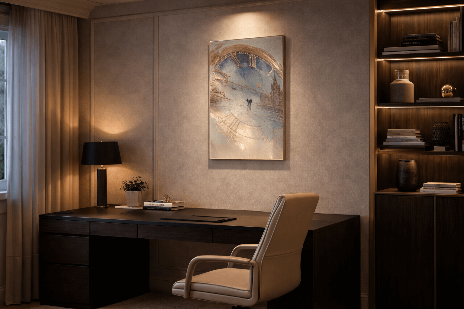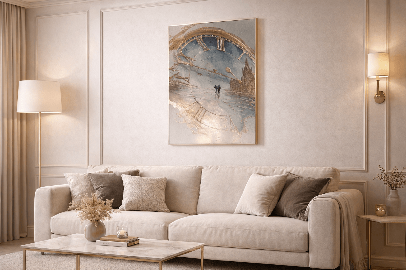 Obraz na szkle „Poza czasem” to elegancka, nastrojowa kompozycja, która łączy motyw zegara ze złotymi akcentami i delikatnym, miejskim pejzażem. Subtelne przejścia kolorów oraz połyskujące detale przywołują skojarzenia z chwilą zatrzymaną w pamięci – spokojną, symboliczną i pełną znaczenia. To dekoracja, która świetnie pasuje do salonu, sypialni lub gabinetu, dodając wnętrzu klasy i artystycznego charakteru.
