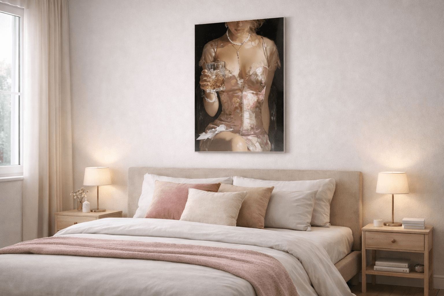 Obraz na szkle „Różowy blask” to zmysłowa i elegancka kompozycja, emanująca kobiecą subtelnością oraz luksusowym nastrojem. Delikatne odcienie różu, połysk tkanin i refleksy światła tworzą harmonijną całość, podkreślając atmosferę intymności i wyrafinowania. Motyw chwili zatrzymanej w półmroku symbolizuje przyjemność, spokój i celebrację piękna codziennych momentów. Subtelne detale oraz miękkie przejścia barw nadają dziełu artystycznej głębi. To dekoracja idealna do salonu, sypialni lub eleganckiego gabinetu, wprowadzająca do wnętrza ciepło, klasę i ponadczasowy styl.