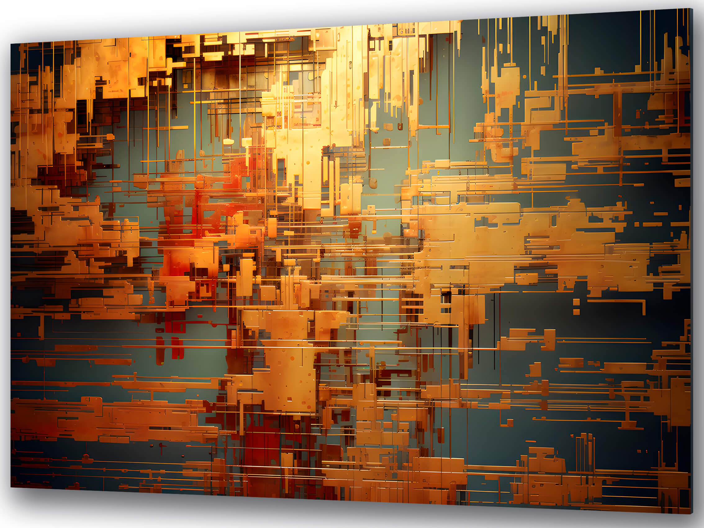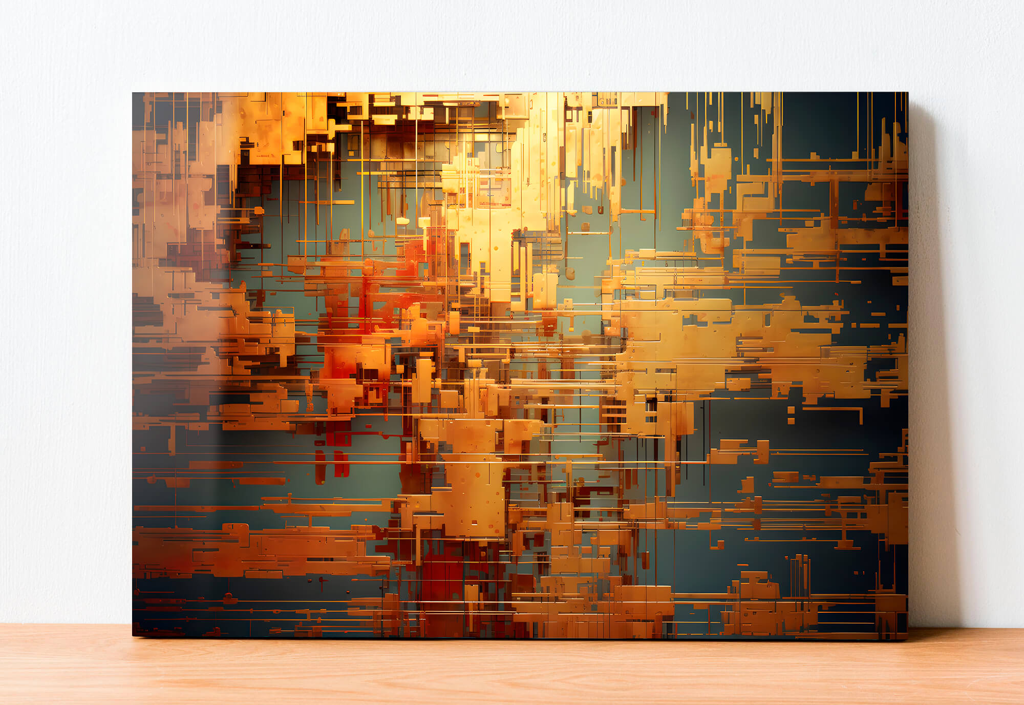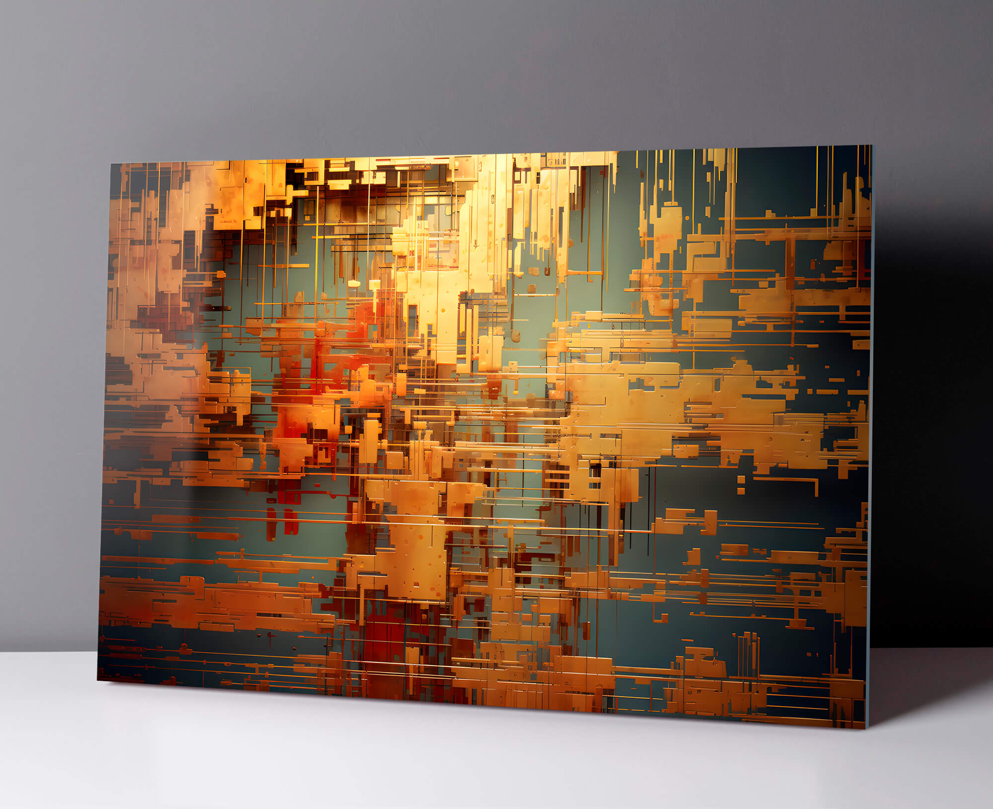 „Złota Abstrakcja” łączy w sobie nowoczesną estetykę i industrialny styl. Abstrakcyjna kompozycja złotych linii i geometrycznych kształtów tworzy wrażenie cyfrowego kodu, który symbolizuje życie i ruch metropolii. Bogate złote akcenty kontrastują z głębokimi odcieniami zieleni i pomarańczy, dodając pracy objętości i głębi.