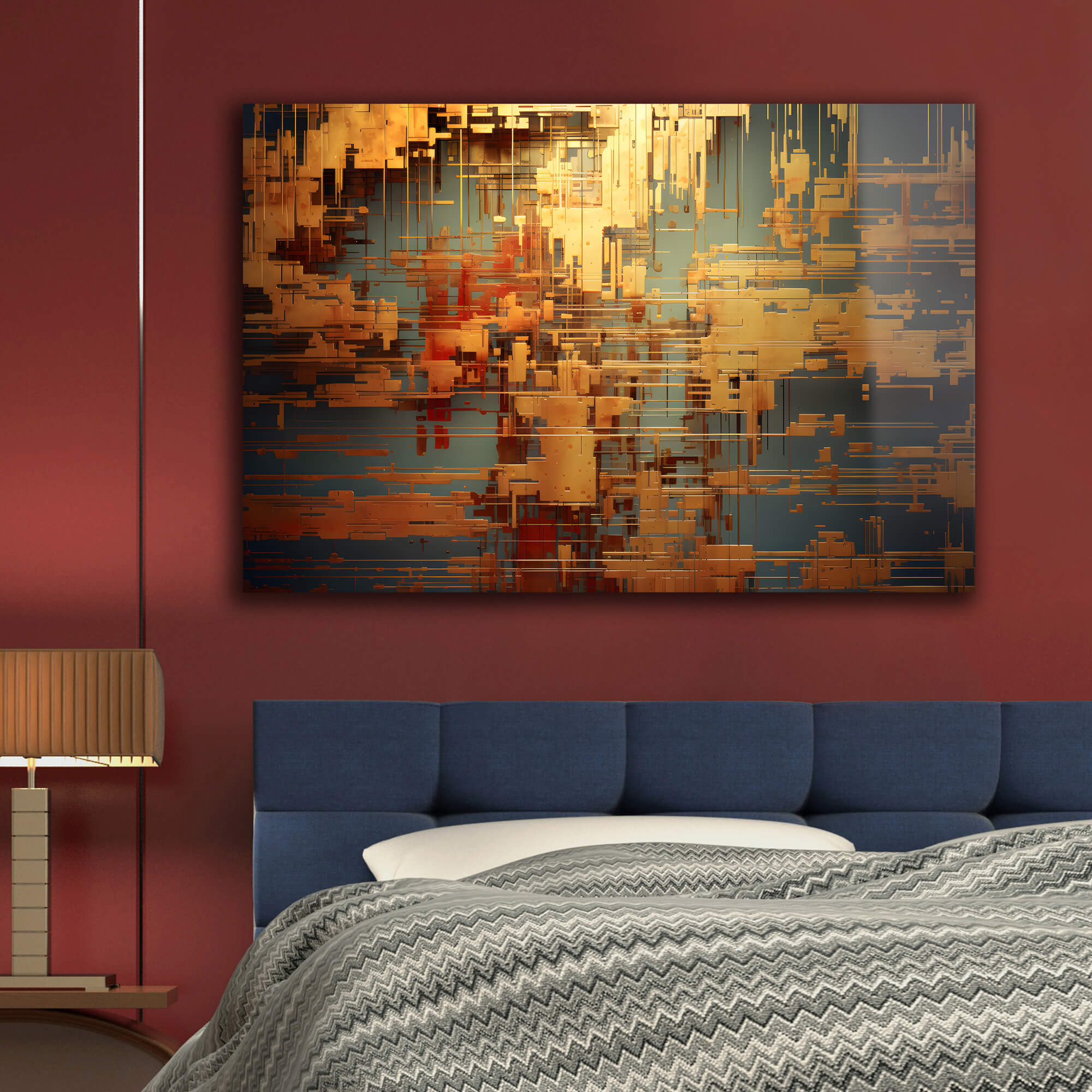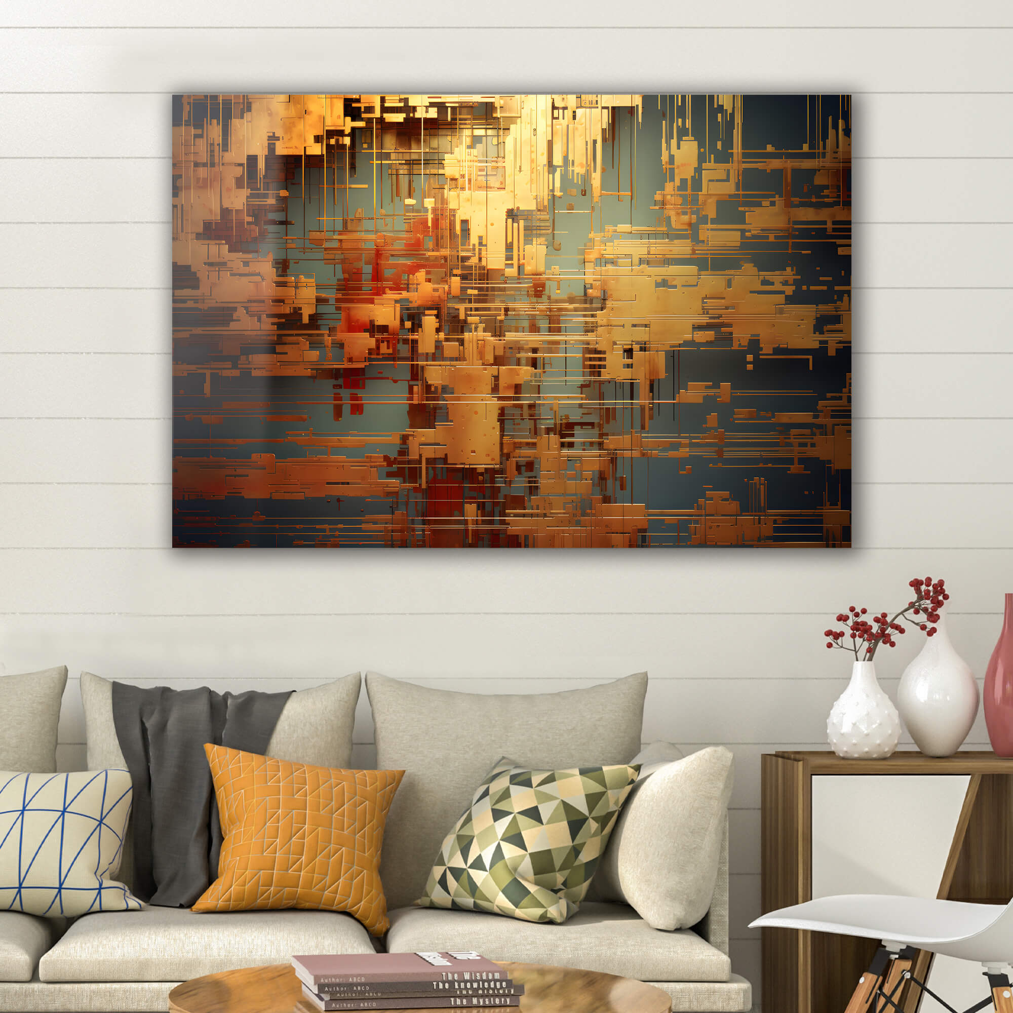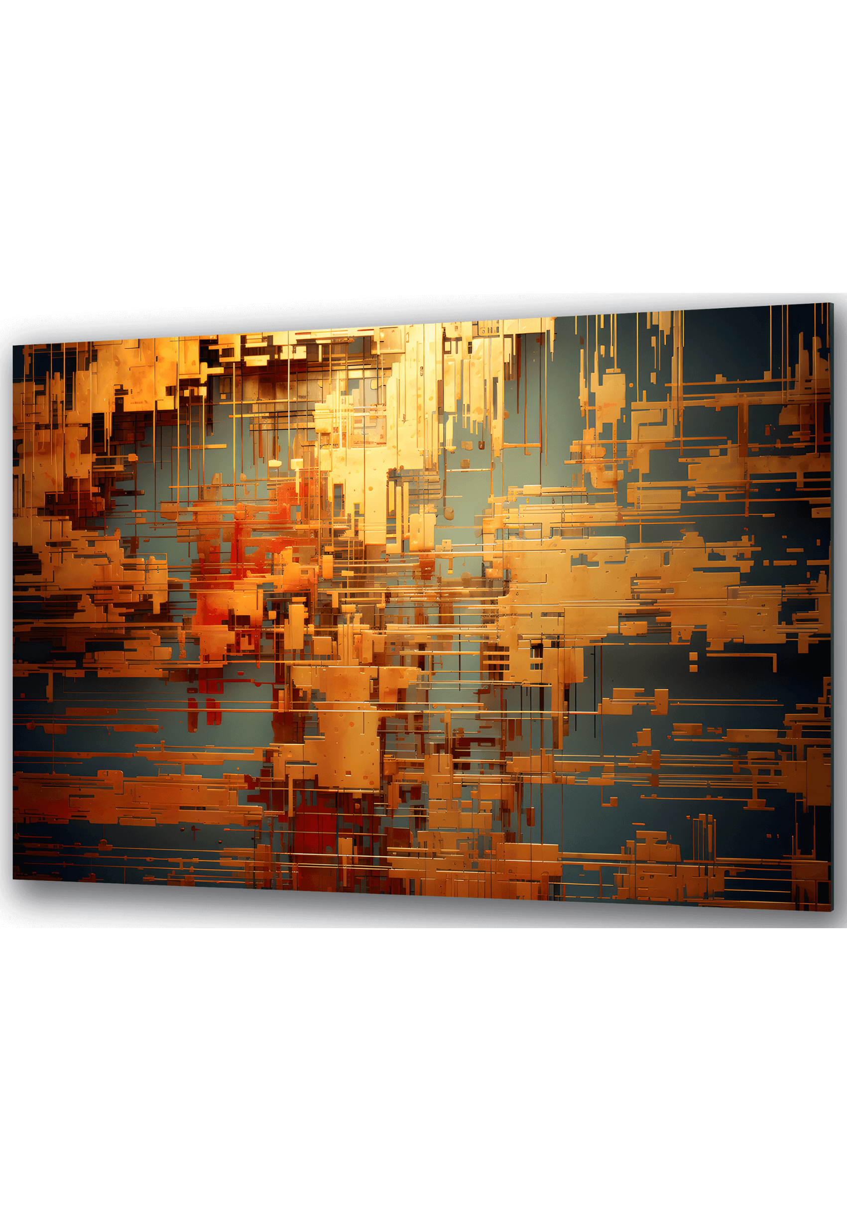 „Złota Abstrakcja” łączy w sobie nowoczesną estetykę i industrialny styl. Abstrakcyjna kompozycja złotych linii i geometrycznych kształtów tworzy wrażenie cyfrowego kodu, który symbolizuje życie i ruch metropolii. Bogate złote akcenty kontrastują z głębokimi odcieniami zieleni i pomarańczy, dodając pracy objętości i głębi.