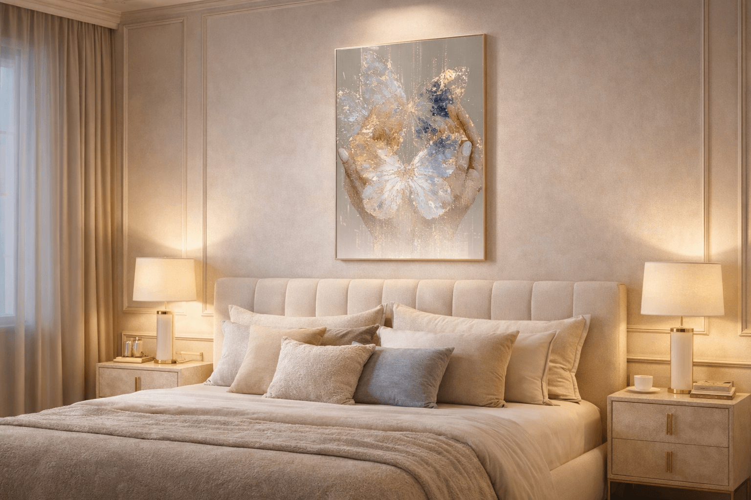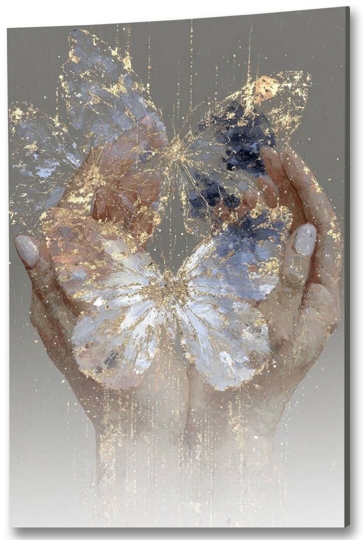 Obraz na szkle „Złota delikatność” to subtelna, poetycka kompozycja, w której motyw motyla unoszącego się nad dłońmi symbolizuje kruchość, piękno i ulotność chwili. Złote akcenty nadają całości szlachetnego blasku, a delikatne przejścia barw tworzą wrażenie lekkości i harmonii. To dzieło emanuje spokojem i elegancją, zachęcając do chwili refleksji i wyciszenia. Idealnie sprawdzi się jako wyjątkowa dekoracja salonu, sypialni lub przestrzeni relaksu, dodając wnętrzu artystycznej wrażliwości i ciepła.