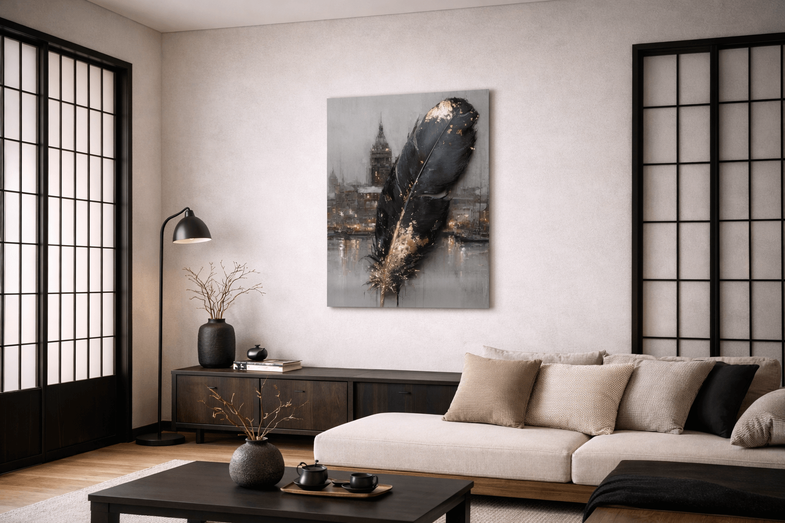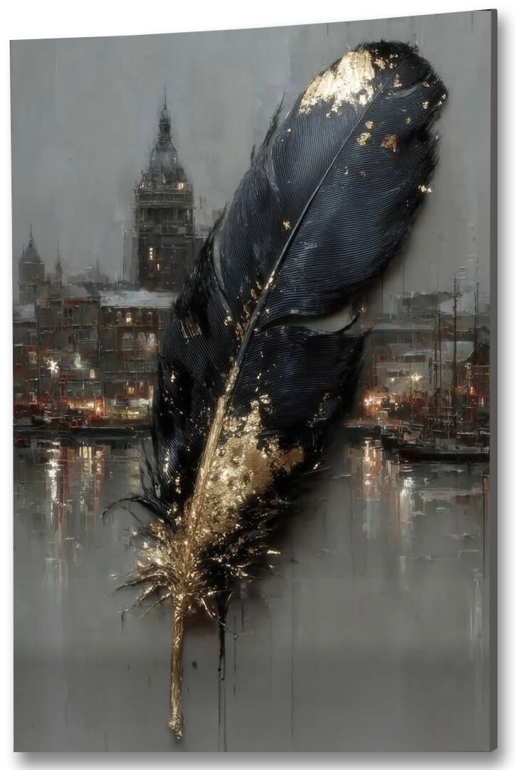 Obraz na szkle „Złote pióro miasta” to nastrojowa, artystyczna kompozycja łącząca motyw pióra z miejskim pejzażem spowitym w subtelnym świetle. Ciemne, głębokie tony kontrastują tu z połyskującymi, złotymi akcentami, tworząc wrażenie elegancji i tajemnicy. Symboliczne pióro unoszące się nad miastem przywołuje skojarzenia z myślą, twórczością i ulotnością chwili zapisanej w pamięci. Miękkie przejścia barw oraz refleksy światła nadają dziełu wyjątkowej głębi i ponadczasowego charakteru. To dekoracja idealna do salonu, sypialni lub gabinetu, która wprowadza do wnętrza klasę, spokój i artystyczną wyrafinowanie.