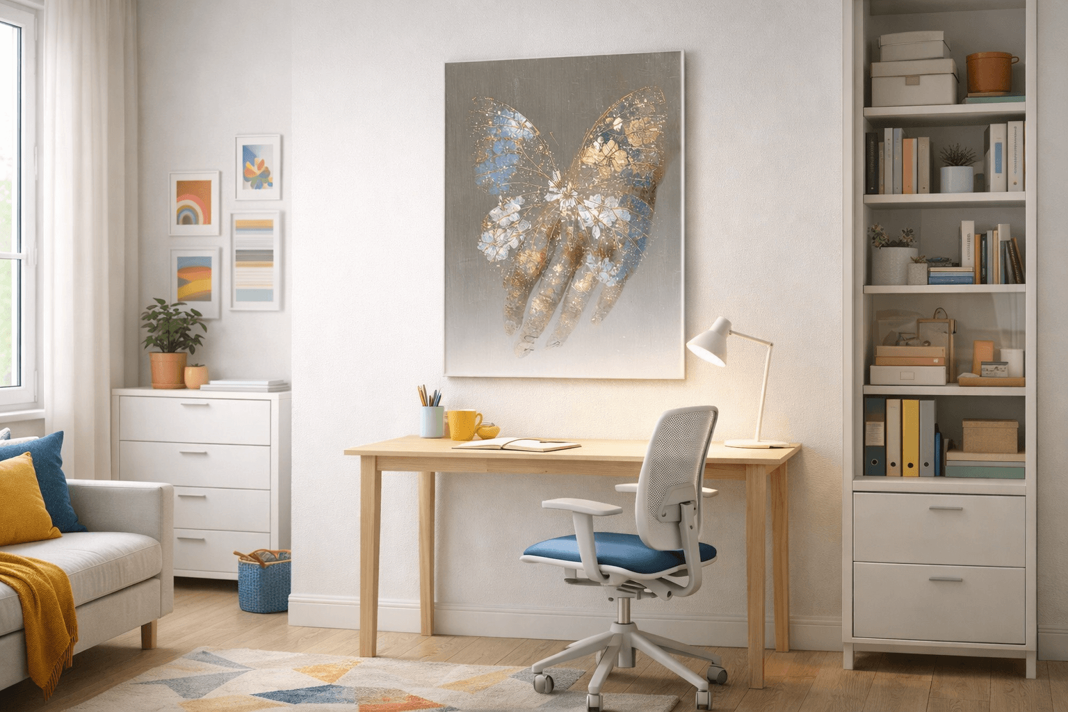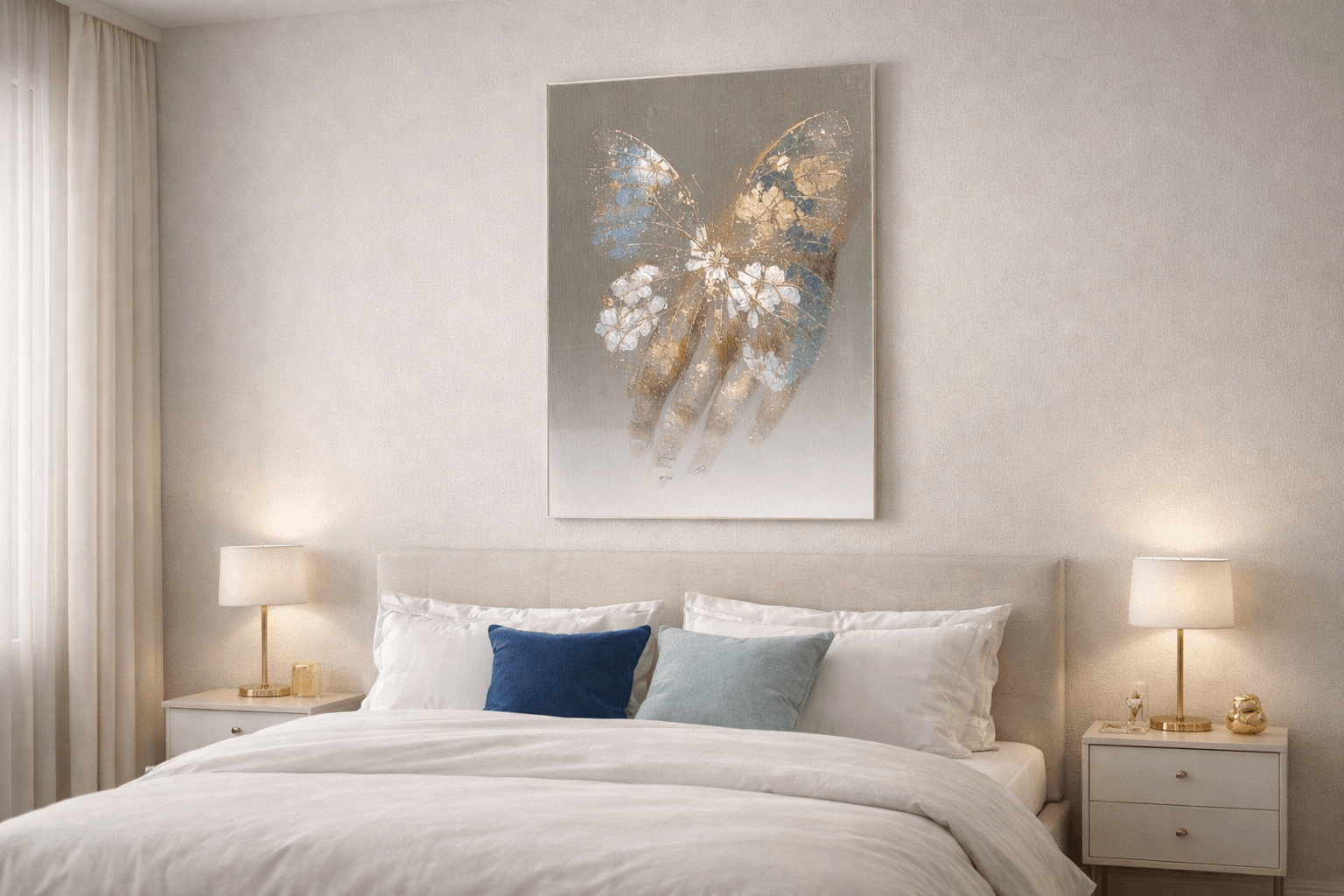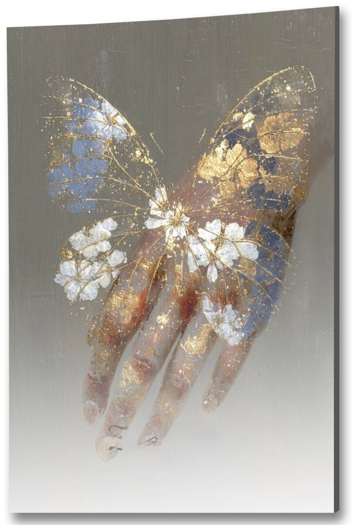 Obraz na szkle „Złote skrzydło na dłoni” to elegancka i pełna symboliki kompozycja, przedstawiająca motyla o złoconych skrzydłach spoczywającego na dłoni. Motyw ten nawiązuje do wolności, nadziei i delikatnej siły ukrytej w kruchości. Połączenie stonowanych barw z połyskującymi, złotymi akcentami nadaje dziełu wyjątkowej głębi i szlachetnego charakteru. Subtelne przejścia kolorów tworzą nastrojową, harmonijną całość, która przyciąga wzrok i wprowadza do wnętrza atmosferę spokoju oraz wyrafinowanej estetyki. Obraz doskonale sprawdzi się w salonie, sypialni lub gabinecie, dodając przestrzeni artystycznej elegancji.