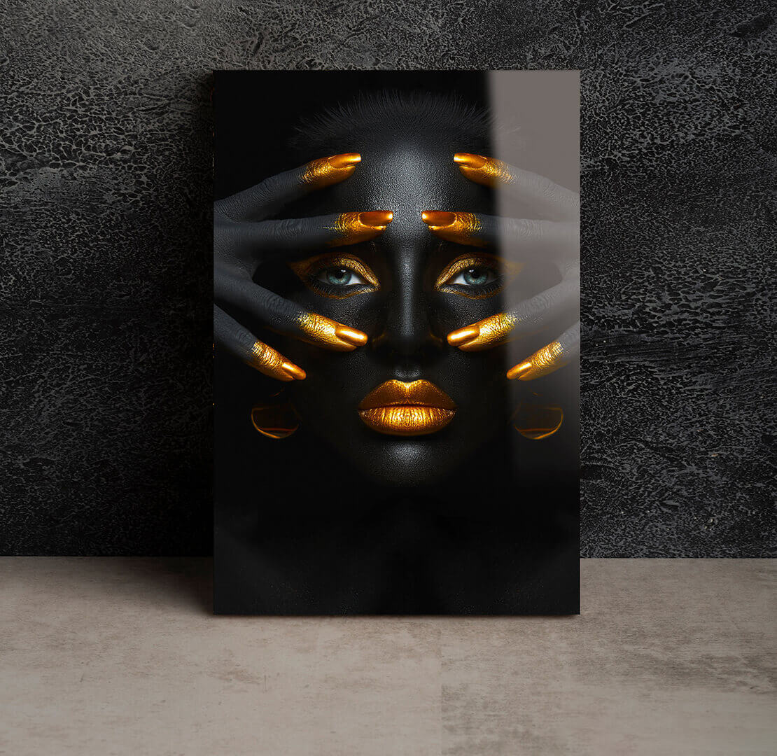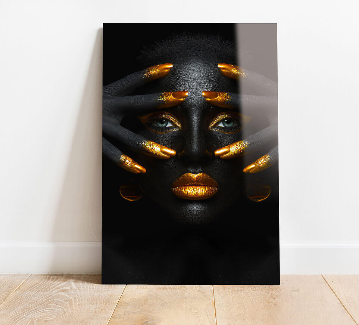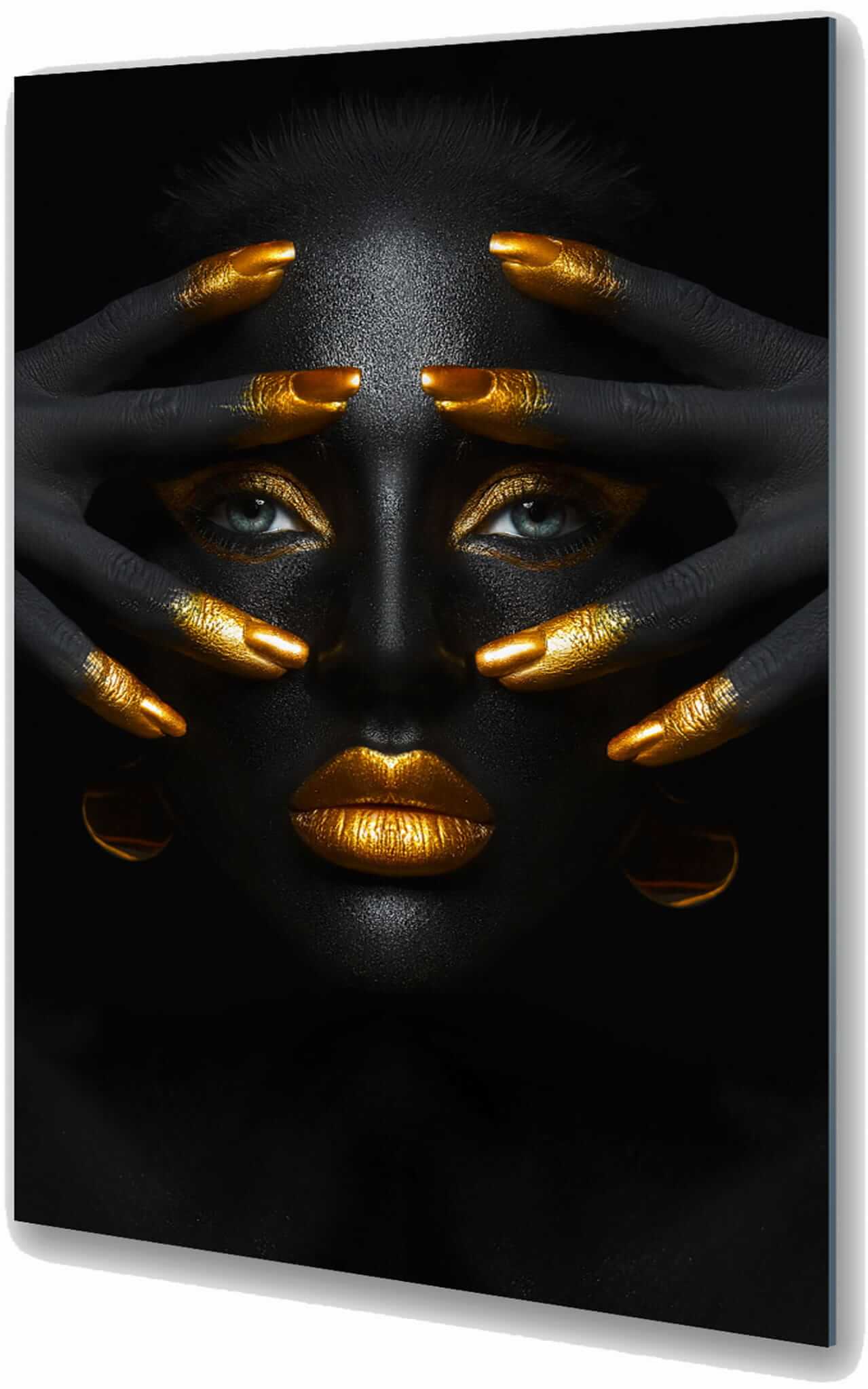 „Afryka w złocie i czerni” zachwyca kontrastowym wzornictwem i symbolizuje elegancję, luksus i tajemniczość. Wizerunek kobiecej twarzy obramowanej dłońmi ze złotymi akcentami tworzy niezwykle stylową i wyrafinowaną kompozycję. Czarne tło podkreśla blask złota, dodając obrazowi głębi i dramatyzmu. Szczegółowość złotych ust, oczu i palców tworzy efekt realizmu i dynamiki, pozostawiając jednocześnie miejsce dla wyobraźni. Lekki połysk szkła dodaje dodatkowej elegancji i pozwala grze światła ujawnić wszystkie odcienie obrazu.