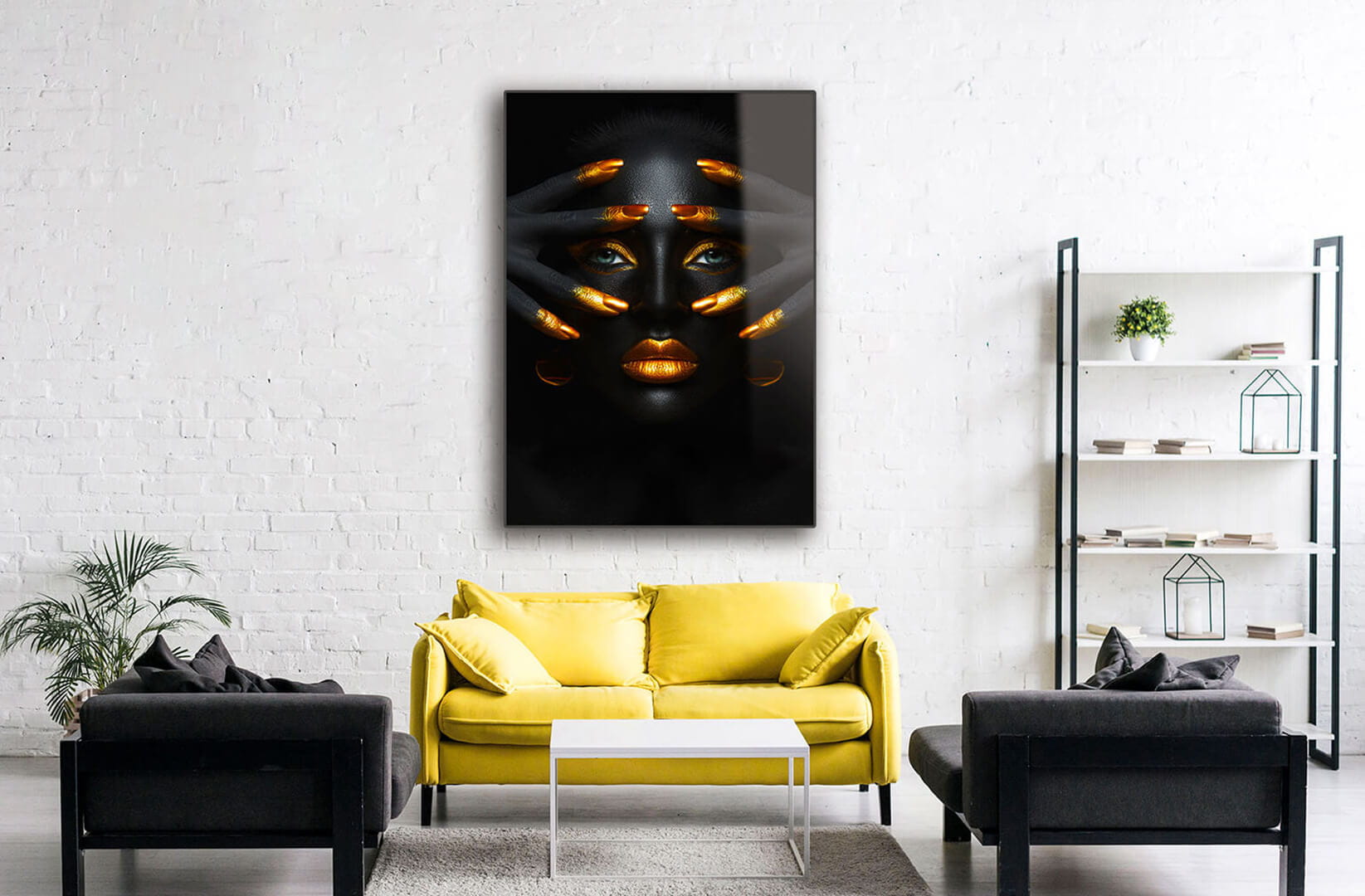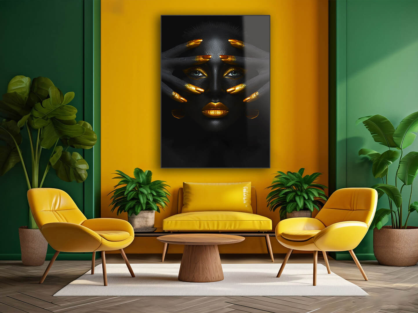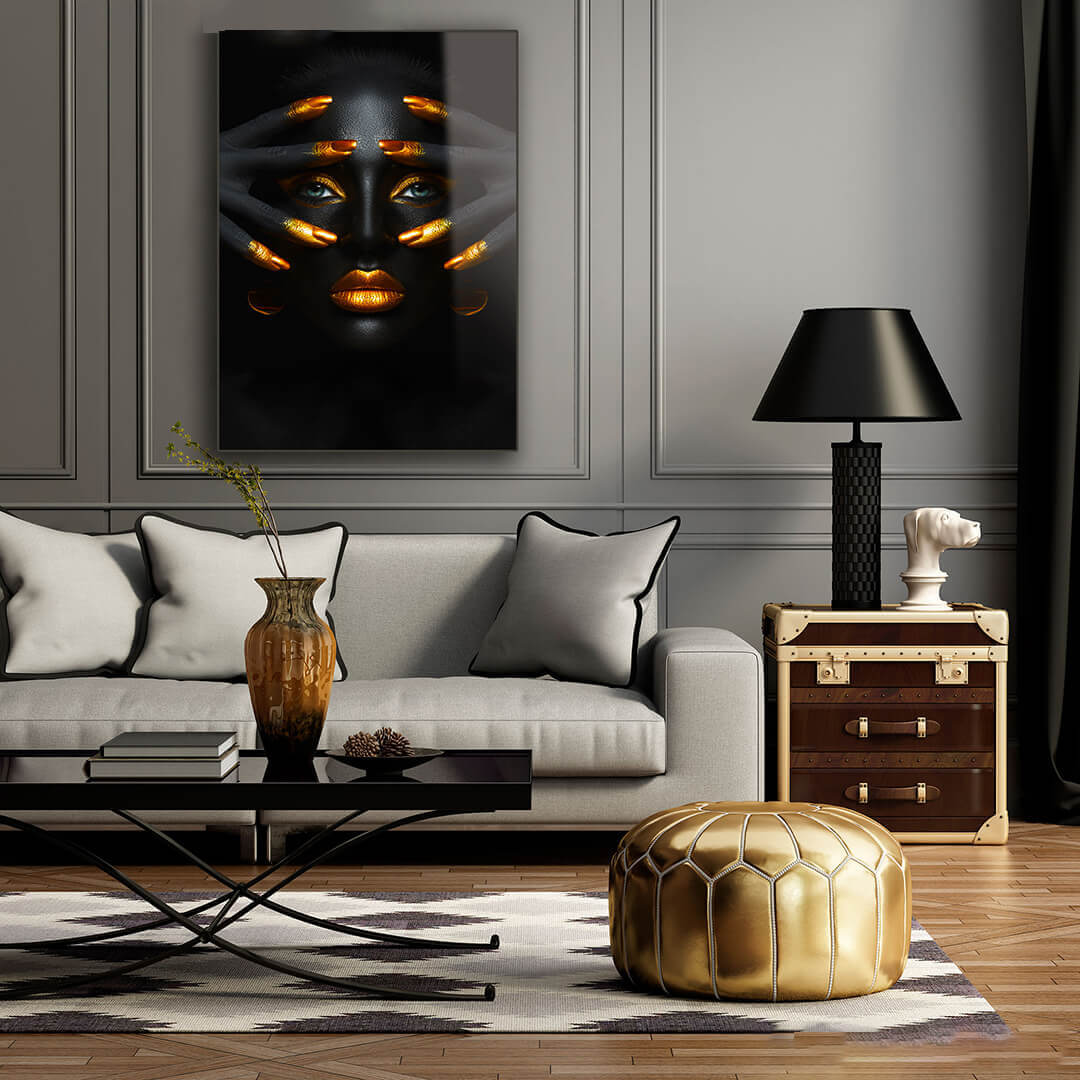 „Afryka w złocie i czerni” zachwyca kontrastowym wzornictwem i symbolizuje elegancję, luksus i tajemniczość. Wizerunek kobiecej twarzy obramowanej dłońmi ze złotymi akcentami tworzy niezwykle stylową i wyrafinowaną kompozycję. Czarne tło podkreśla blask złota, dodając obrazowi głębi i dramatyzmu. Szczegółowość złotych ust, oczu i palców tworzy efekt realizmu i dynamiki, pozostawiając jednocześnie miejsce dla wyobraźni. Lekki połysk szkła dodaje dodatkowej elegancji i pozwala grze światła ujawnić wszystkie odcienie obrazu.