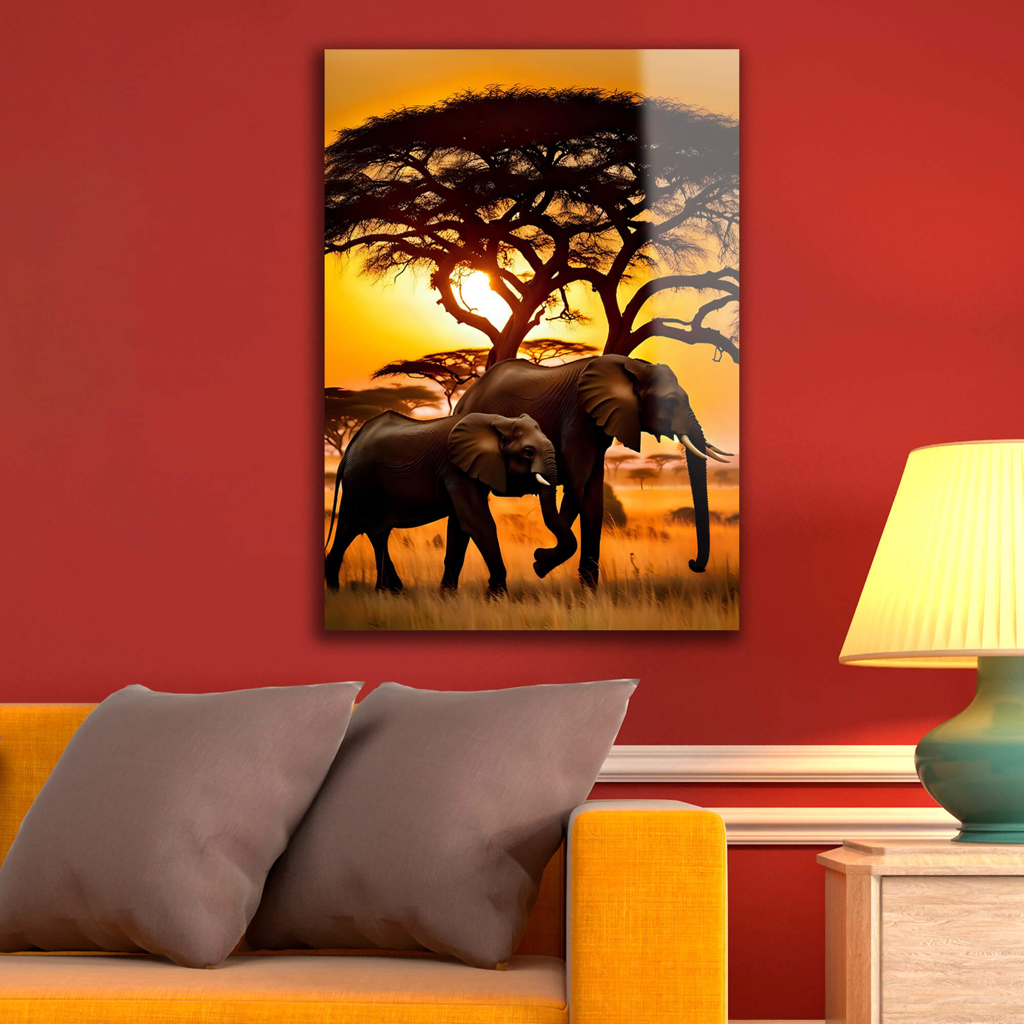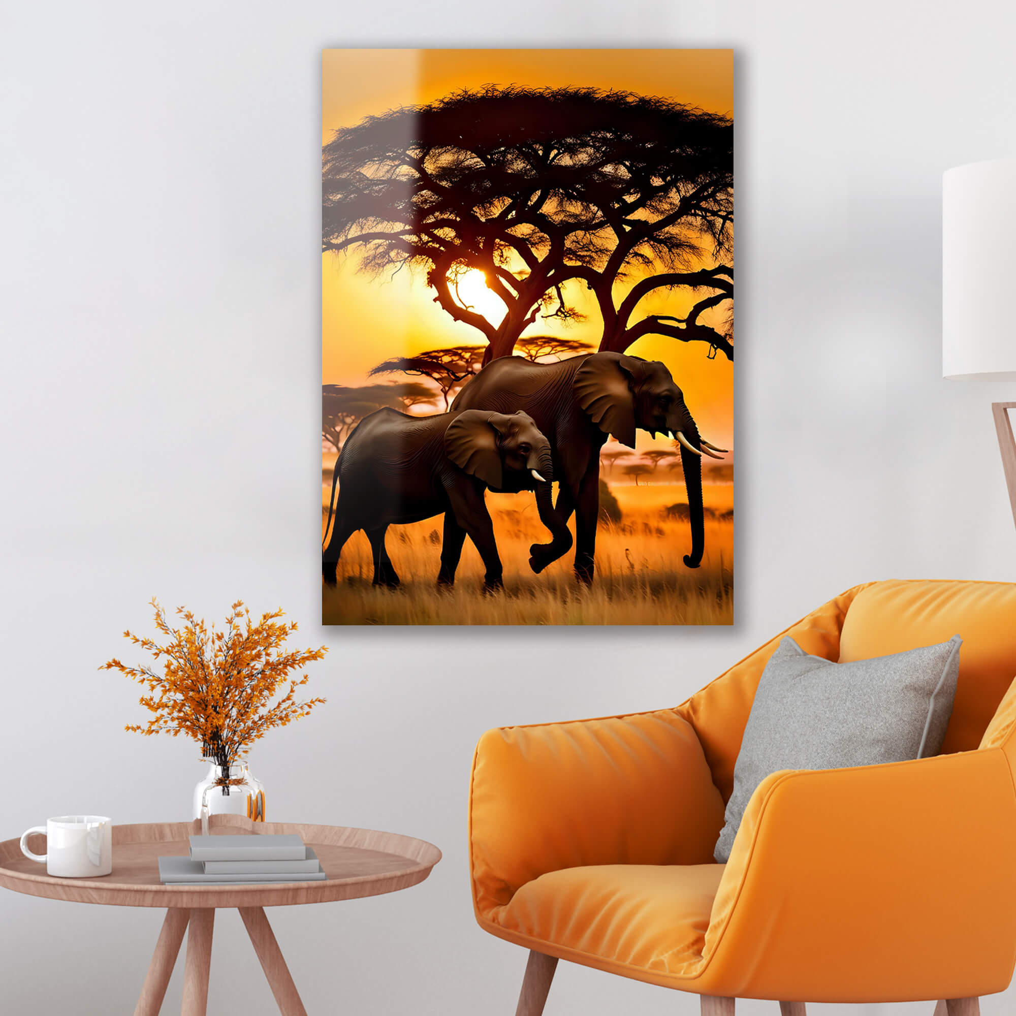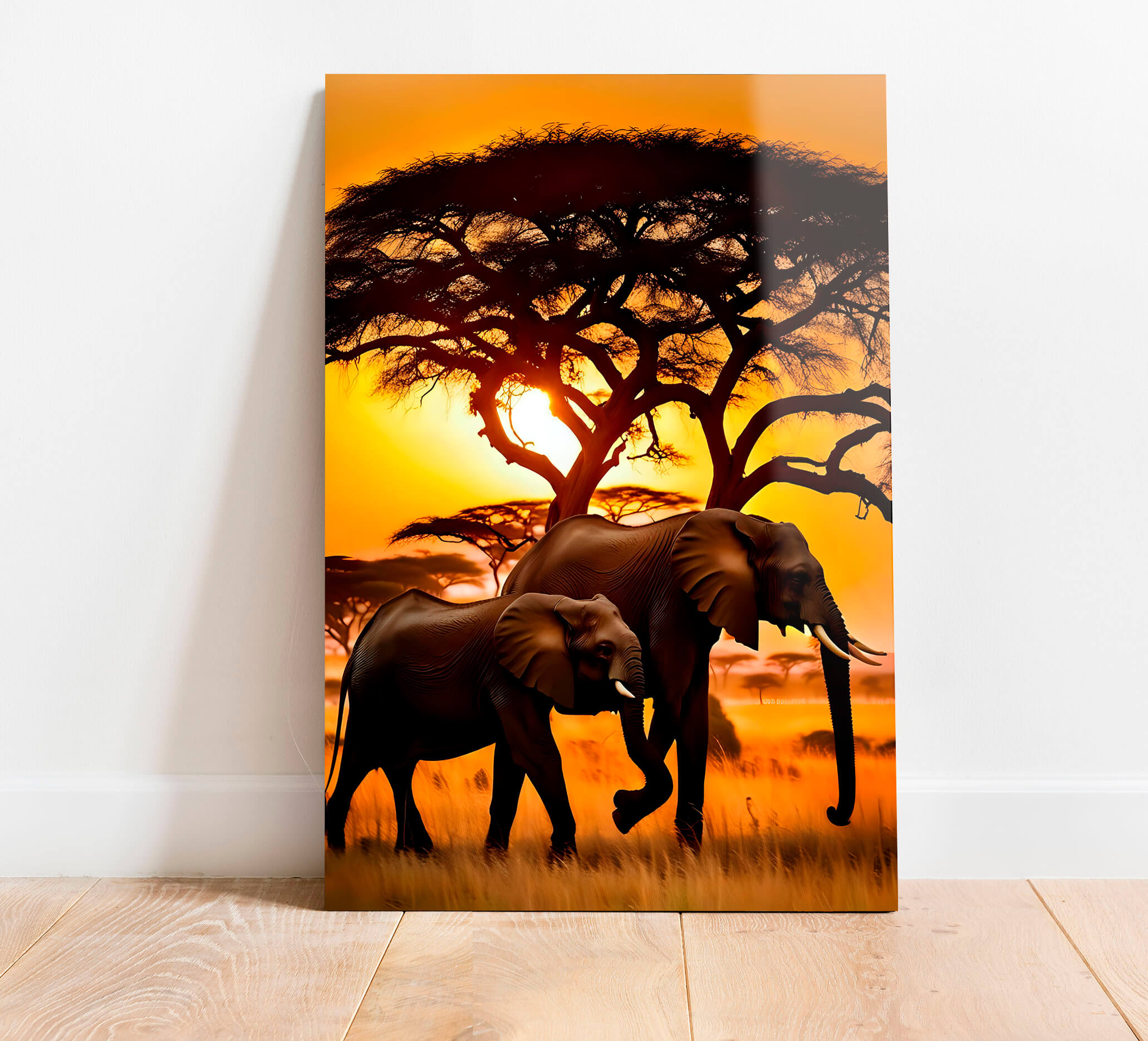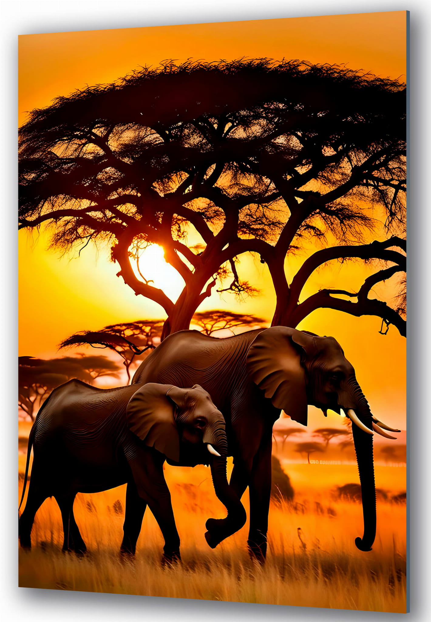 „Słonie w Afryce o zachodzie słońca”. Ten elegancki obraz na szkle przedstawia dwa majestatyczne słonie spacerujące po afrykańskiej sawannie na tle żywego zachodu słońca. Bogate pomarańczowe i żółte odcienie podkreślają piękno natury, tworząc ciepłą i przytulną atmosferę. Sylwetki drzew oraz otaczająca przestrzeń dodają kompozycji głębi i harmonii, oddając niezwykły klimat afrykańskiego krajobrazu.