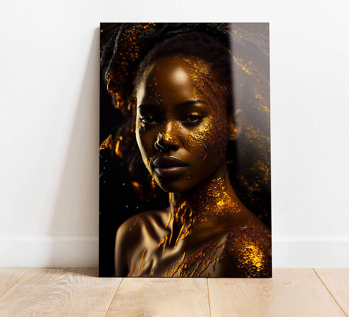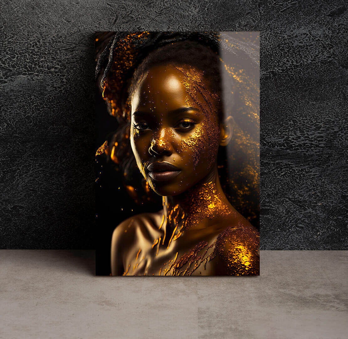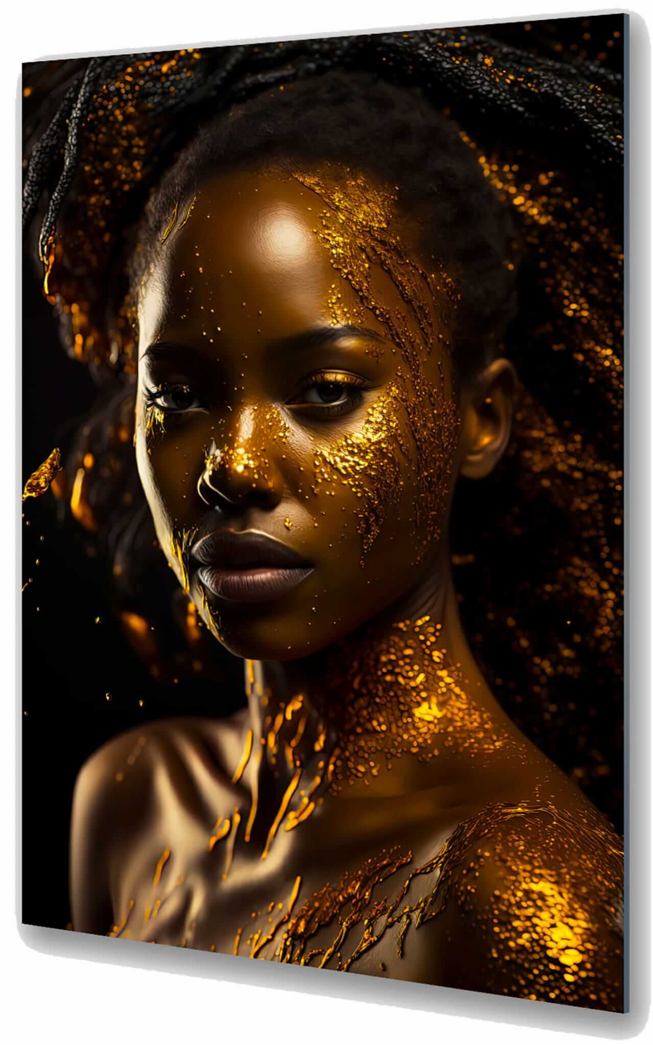 „Złota magia Afryki”. Ten obraz na szkle zachwyca elegancją i symbolizuje wielkość i kobiecość. Wizerunek afrykańskiej kobiety ozdobiony złotymi elementami tworzy niepowtarzalną atmosferę luksusu i harmonii. Jej wyraziste spojrzenie i promienna skóra w złotych odcieniach oddają siłę, pewność siebie i piękno. Kontrast między ciemnym tłem a jasnymi złotymi detalami dodaje obrazowi głębi i dramatyzmu. Lekki połysk szkła wzmacnia efekt przestronności i wyrafinowania, czyniąc ten obraz idealnym do nowoczesnego wnętrza.