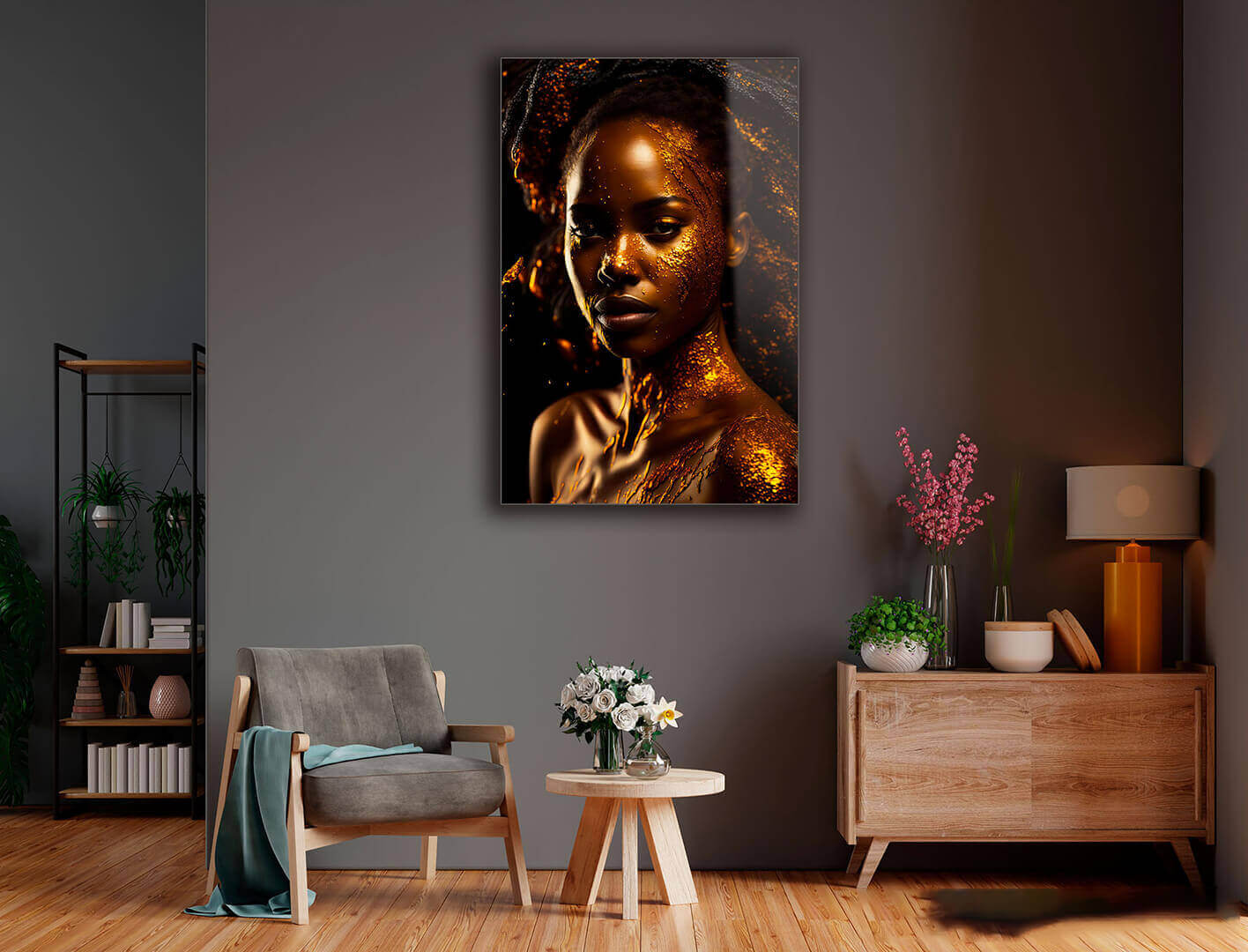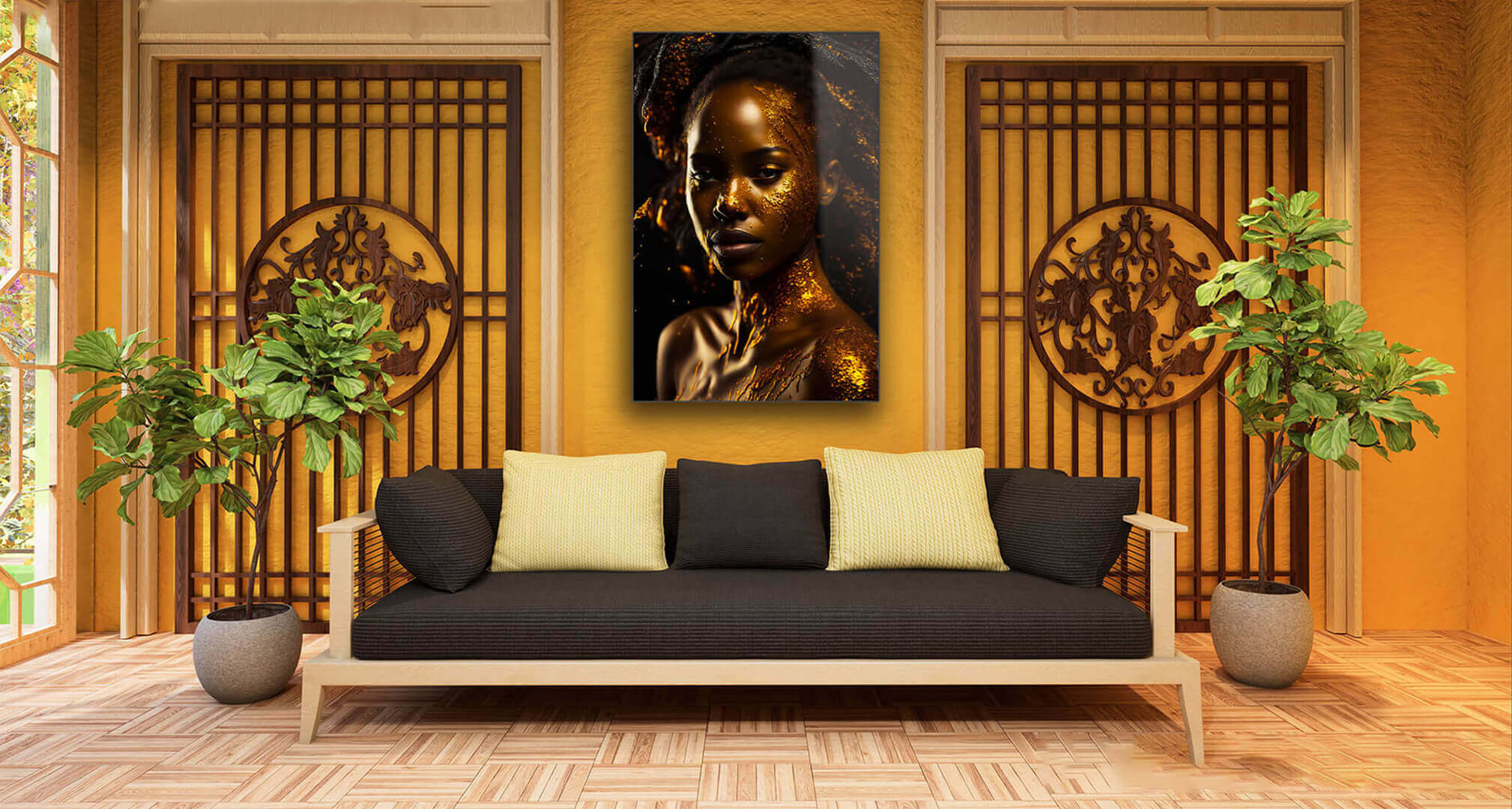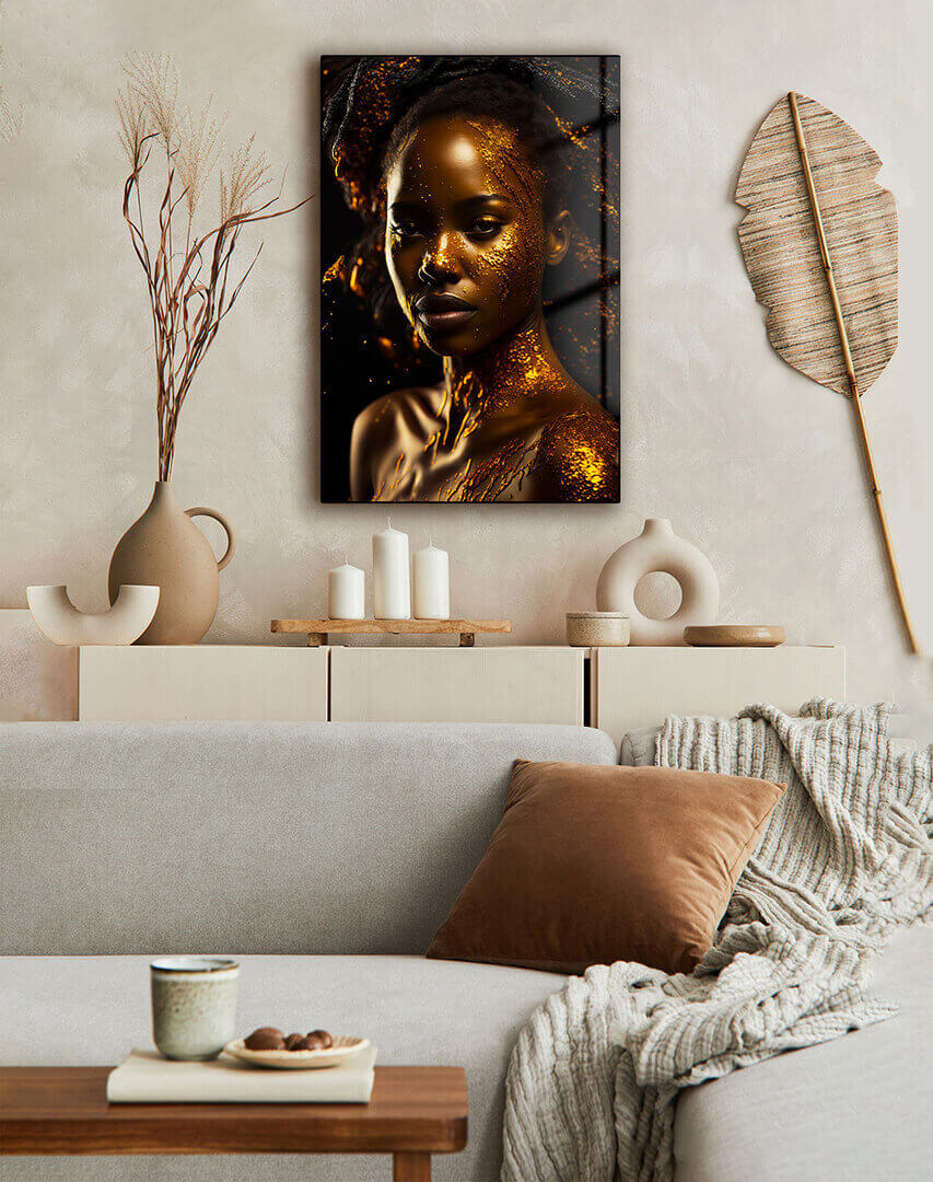 „Złota magia Afryki”. Ten obraz na szkle zachwyca elegancją i symbolizuje wielkość i kobiecość. Wizerunek afrykańskiej kobiety ozdobiony złotymi elementami tworzy niepowtarzalną atmosferę luksusu i harmonii. Jej wyraziste spojrzenie i promienna skóra w złotych odcieniach oddają siłę, pewność siebie i piękno. Kontrast między ciemnym tłem a jasnymi złotymi detalami dodaje obrazowi głębi i dramatyzmu. Lekki połysk szkła wzmacnia efekt przestronności i wyrafinowania, czyniąc ten obraz idealnym do nowoczesnego wnętrza.