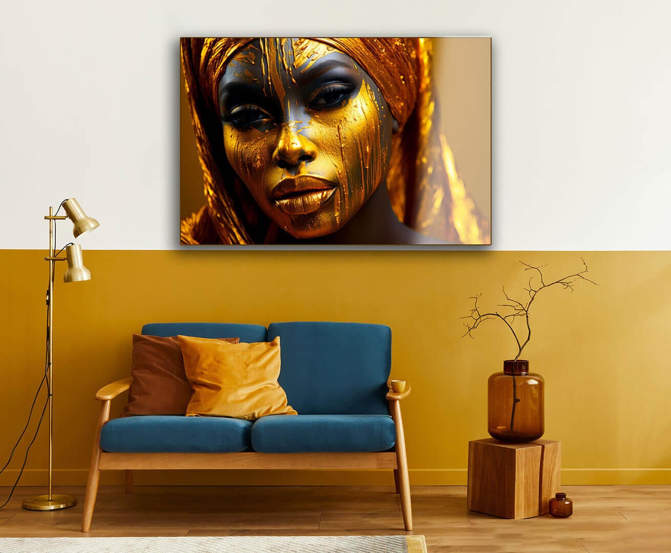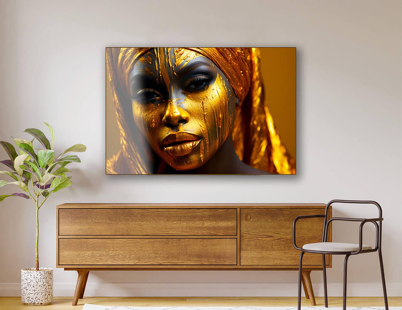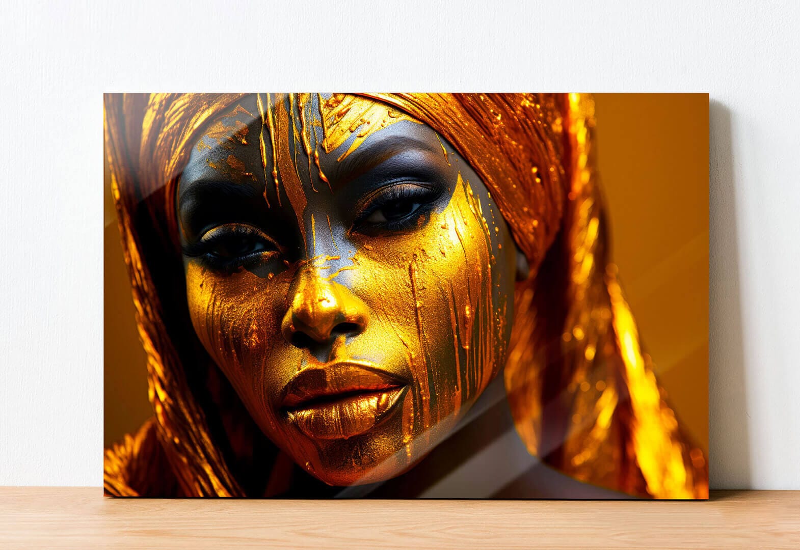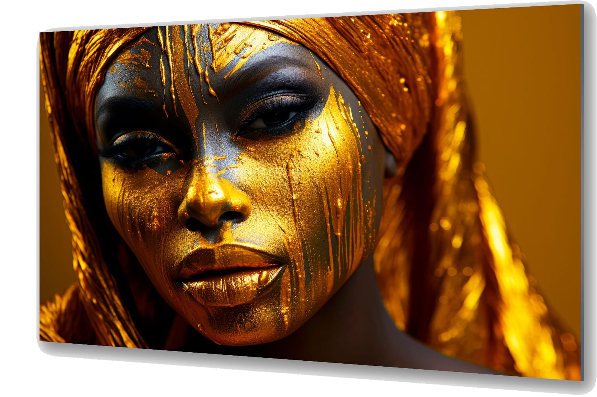 „Złote oblicze” urzeka luksusowym designem i symbolizuje elegancję i siłę. Wizerunek afrykańskiej kobiety, której skóra zdaje się być pokryta złotymi kroplami, odzwierciedla majestat i tajemniczość. Głębokie spojrzenie bohaterki, podkreślone bogatymi złotymi i ciemnymi odcieniami, tworzy efekt wdzięku i magii. Obraz na szkle, wypełniony ciepłymi złotymi odcieniami, doskonale łączy się z kontrastującymi detalami, dodając kompozycji głębi i wyrafinowania. Lekki połysk szkła potęguje wrażenie przestrzeni i luksusu, czyniąc ten szklany obraz idealnym wyborem do nowoczesnego wnętrza.