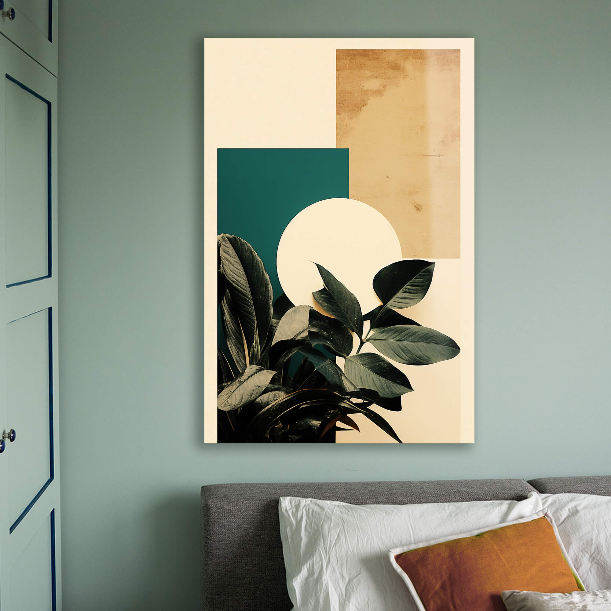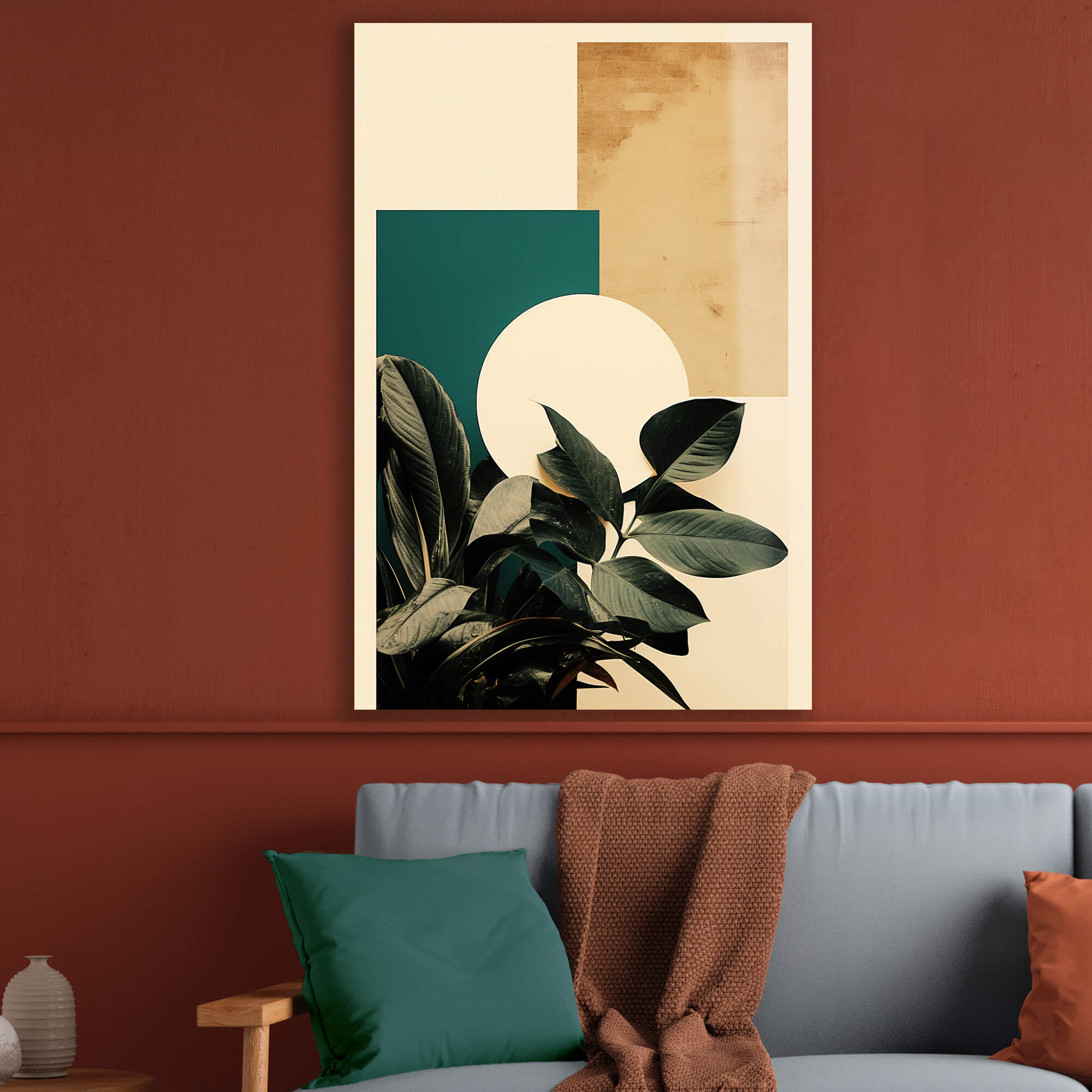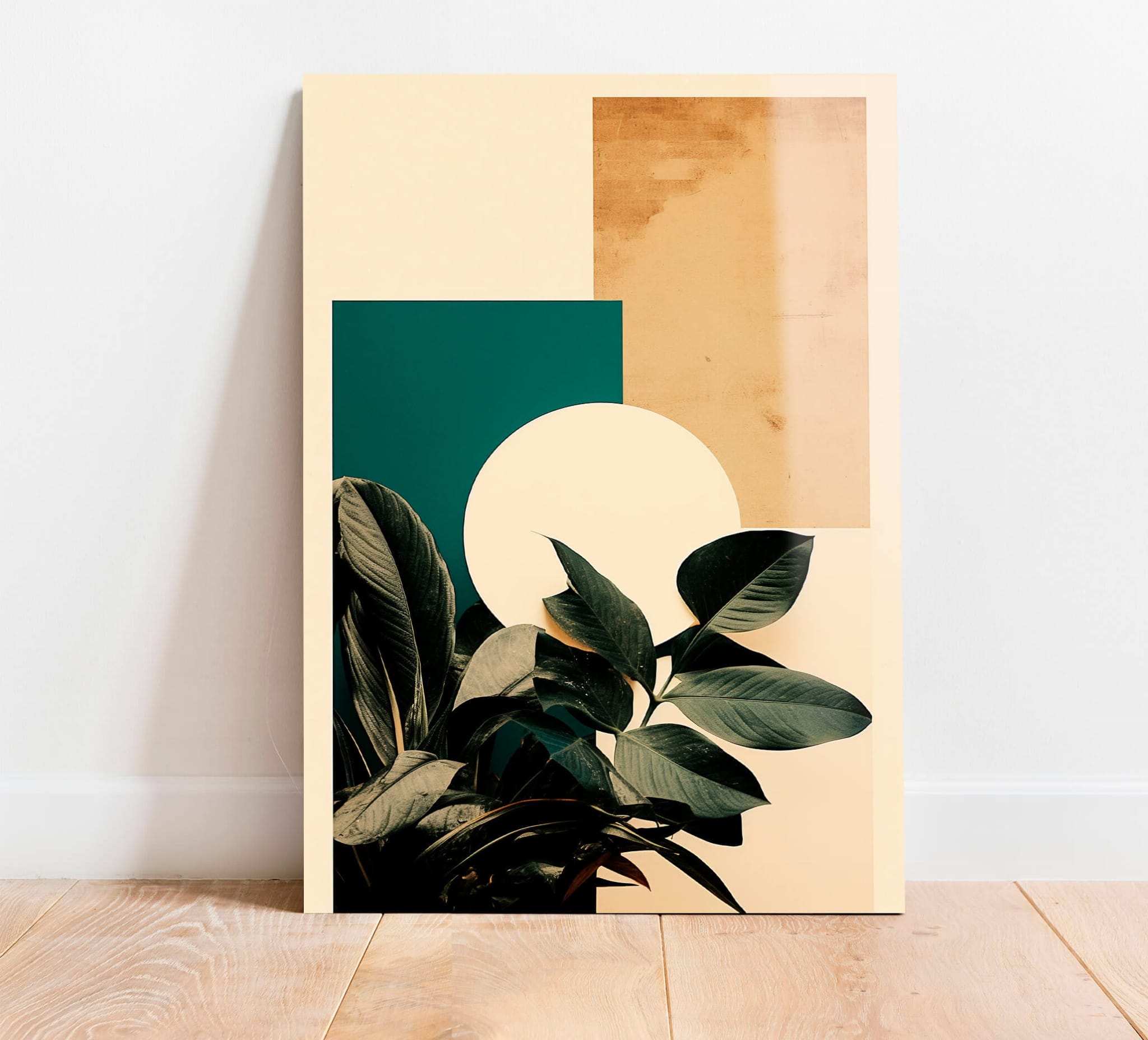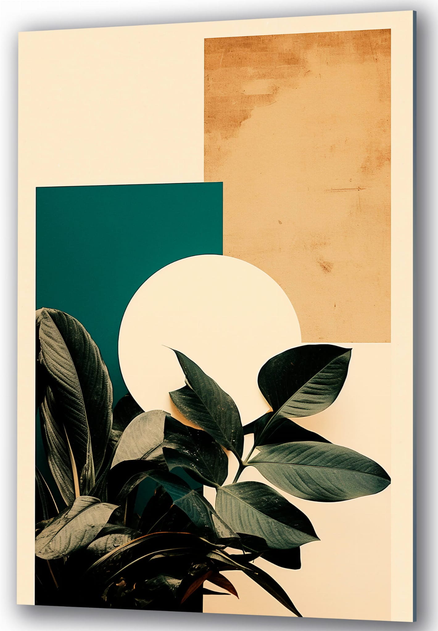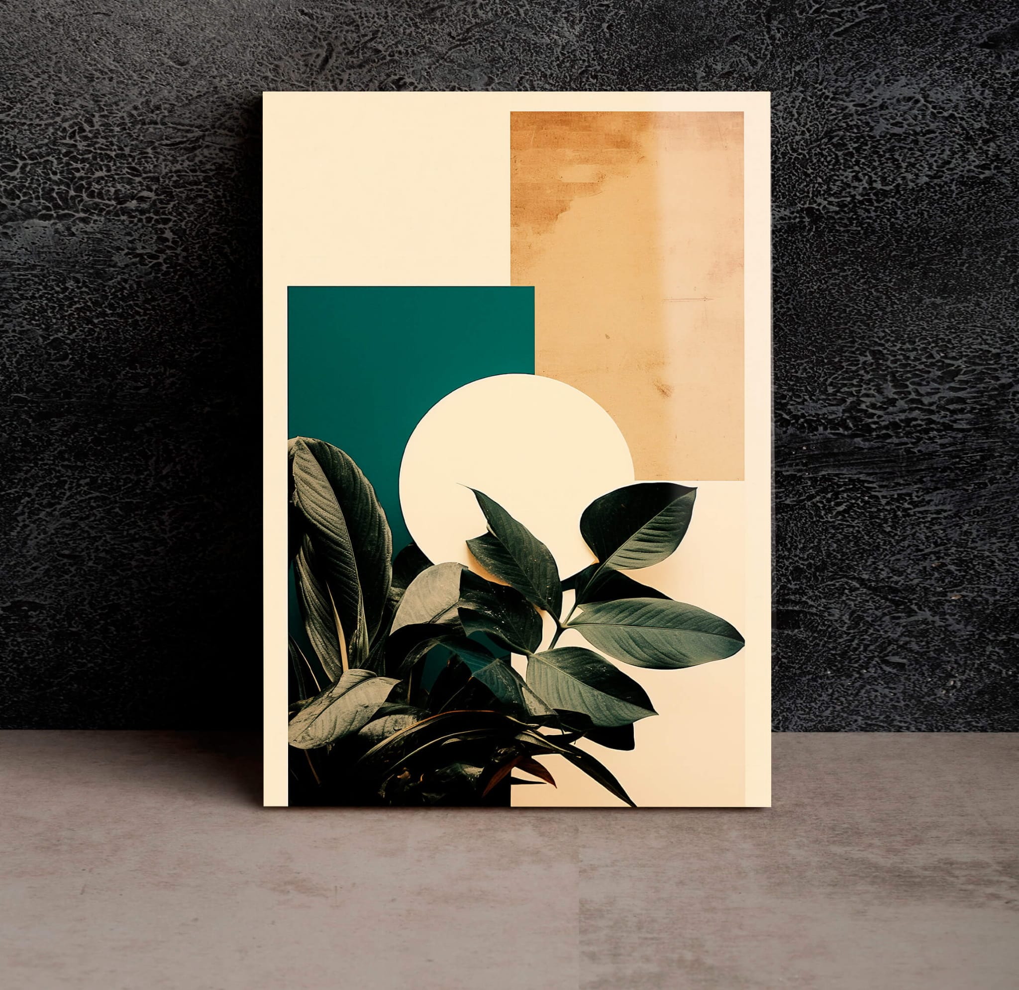 „Geometria i rośliny” łączy w sobie elementy minimalizmu i naturalnego piękna. Sylwetka rośliny na tle geometrycznych kształtów dodaje kompozycji lekkości i elegancji. Odcienie zieleni, kremu i beżu są harmonijnie połączone, podkreślając naturalne piękno rośliny i tworząc poczucie spokoju i równowagi.