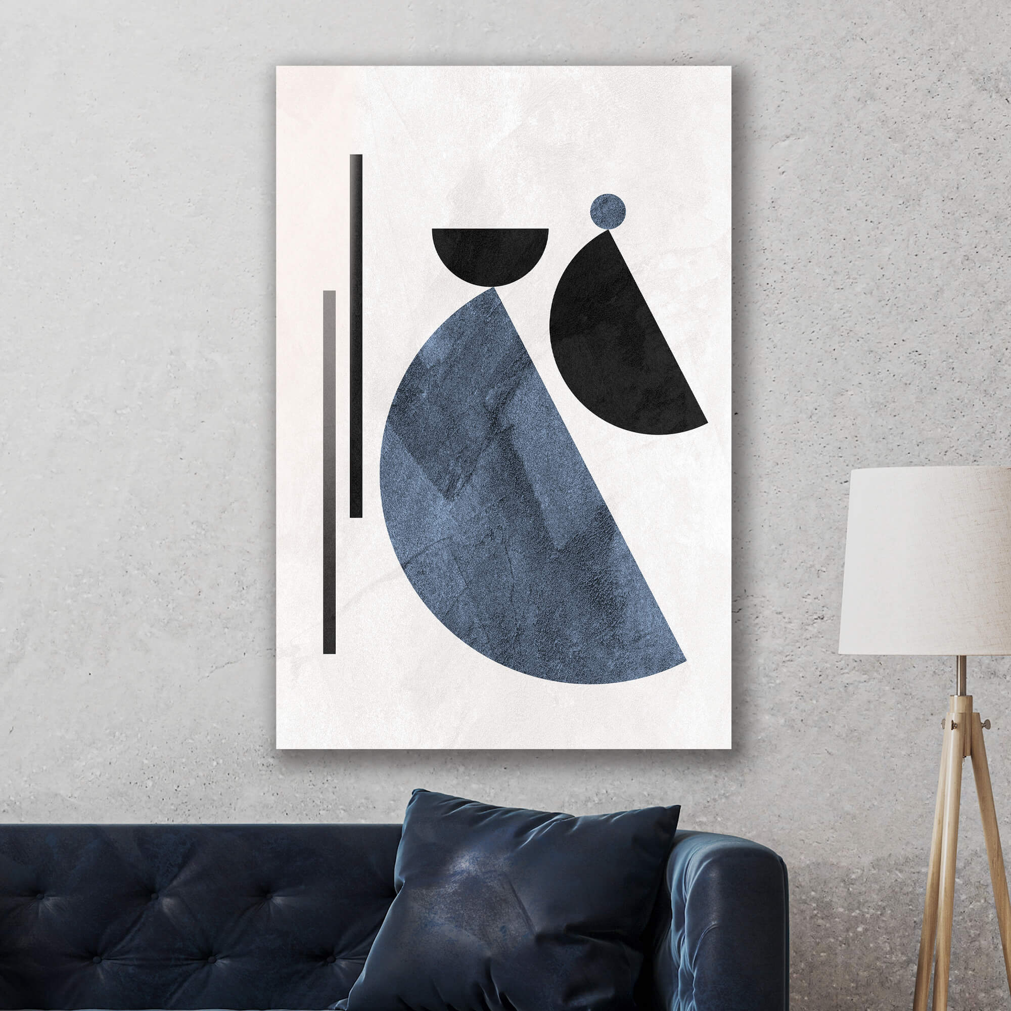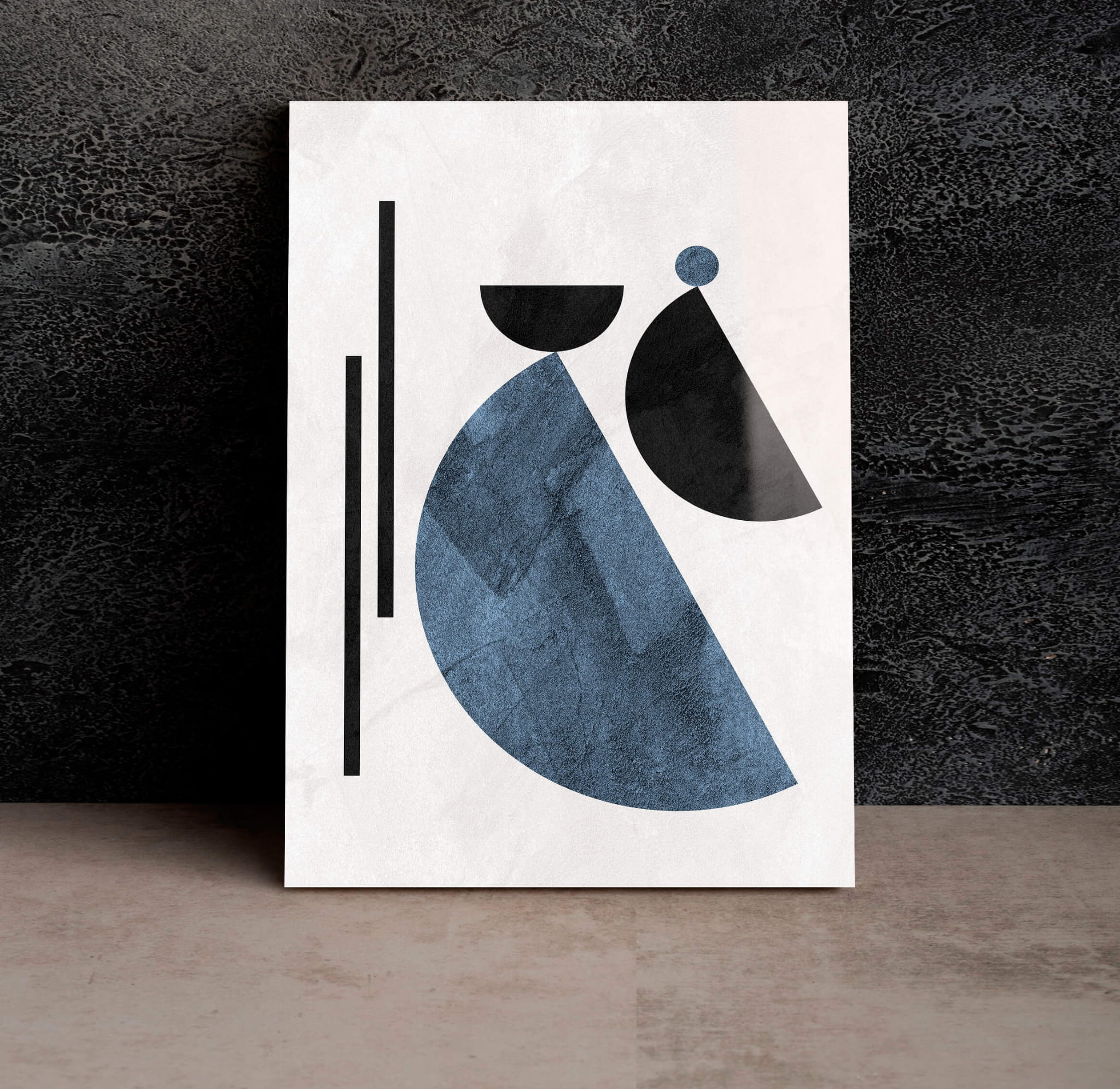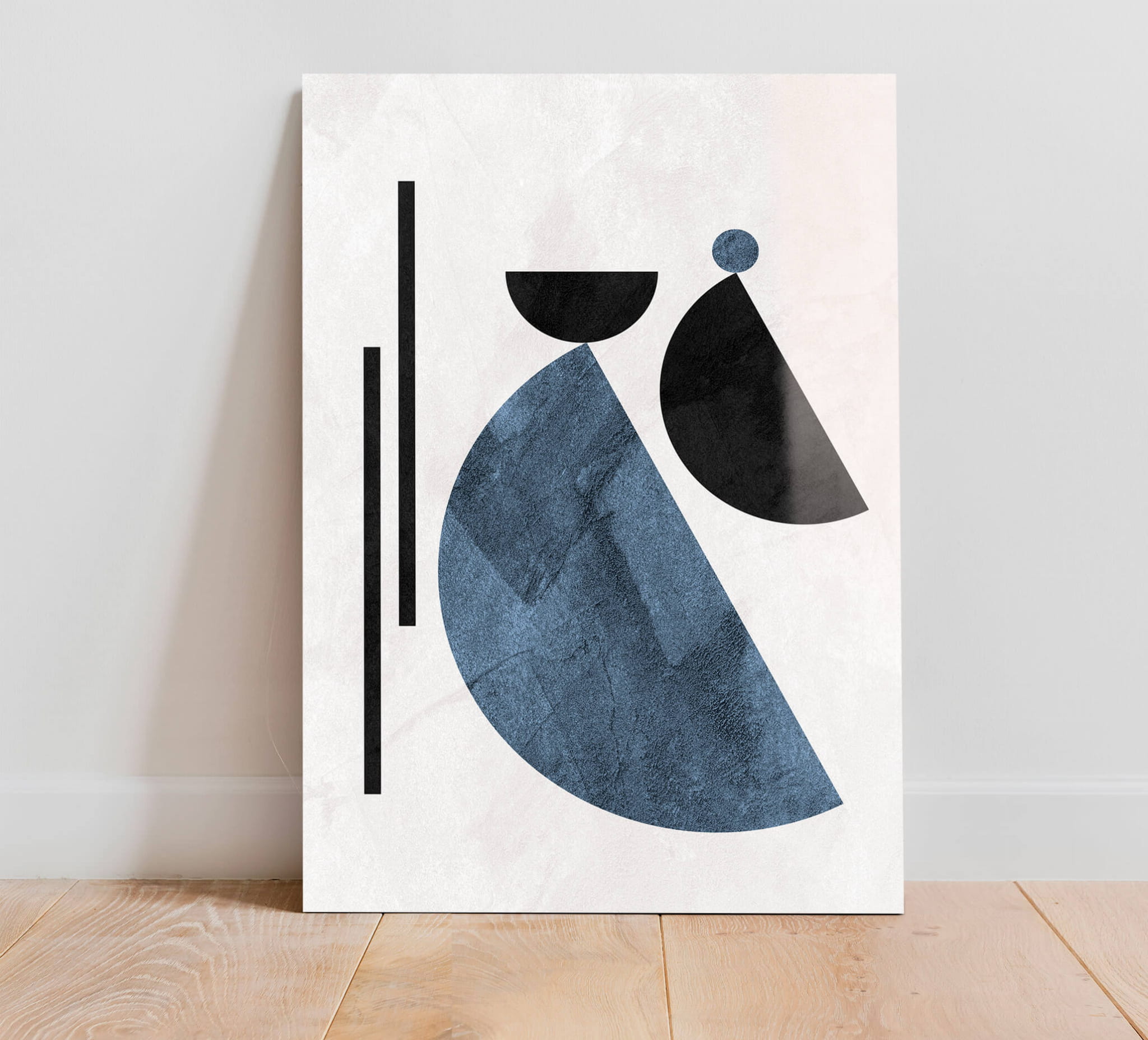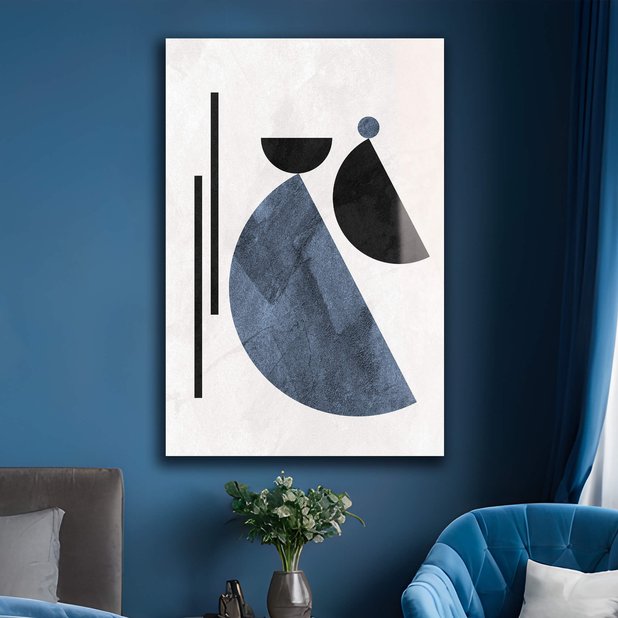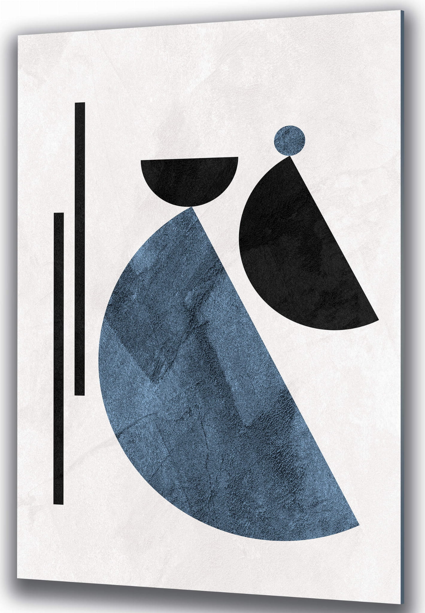 „Geometryczne wzory w stylu Boho” przedstawia nowoczesną abstrakcję z elementami geometrycznych kształtów. Czarne i niebieskie elementy umieszczone na białym tle tworzą harmonijny kontrast. Zaokrąglone kształty łączą się z pionowymi liniami, podkreślając prostotę i elegancję kompozycji.