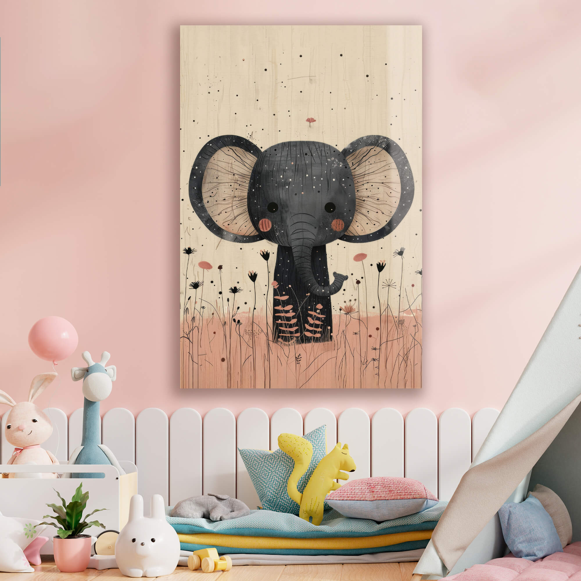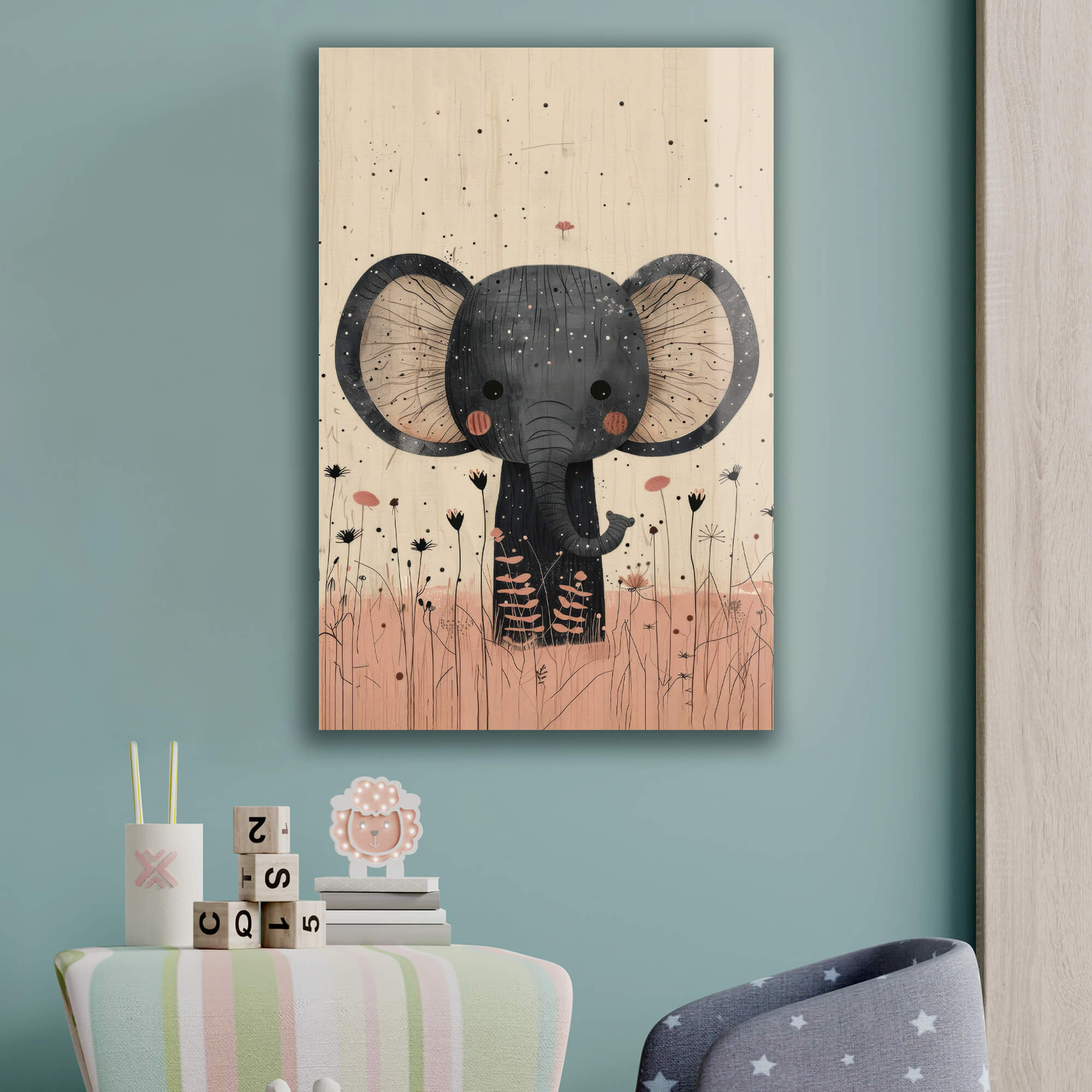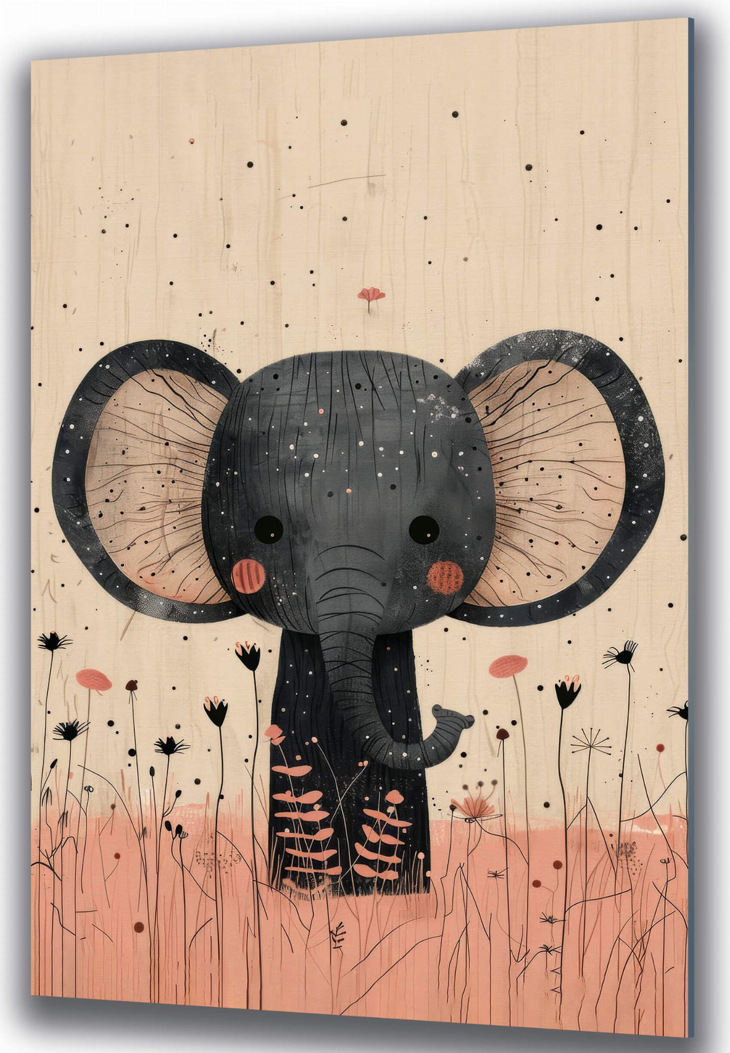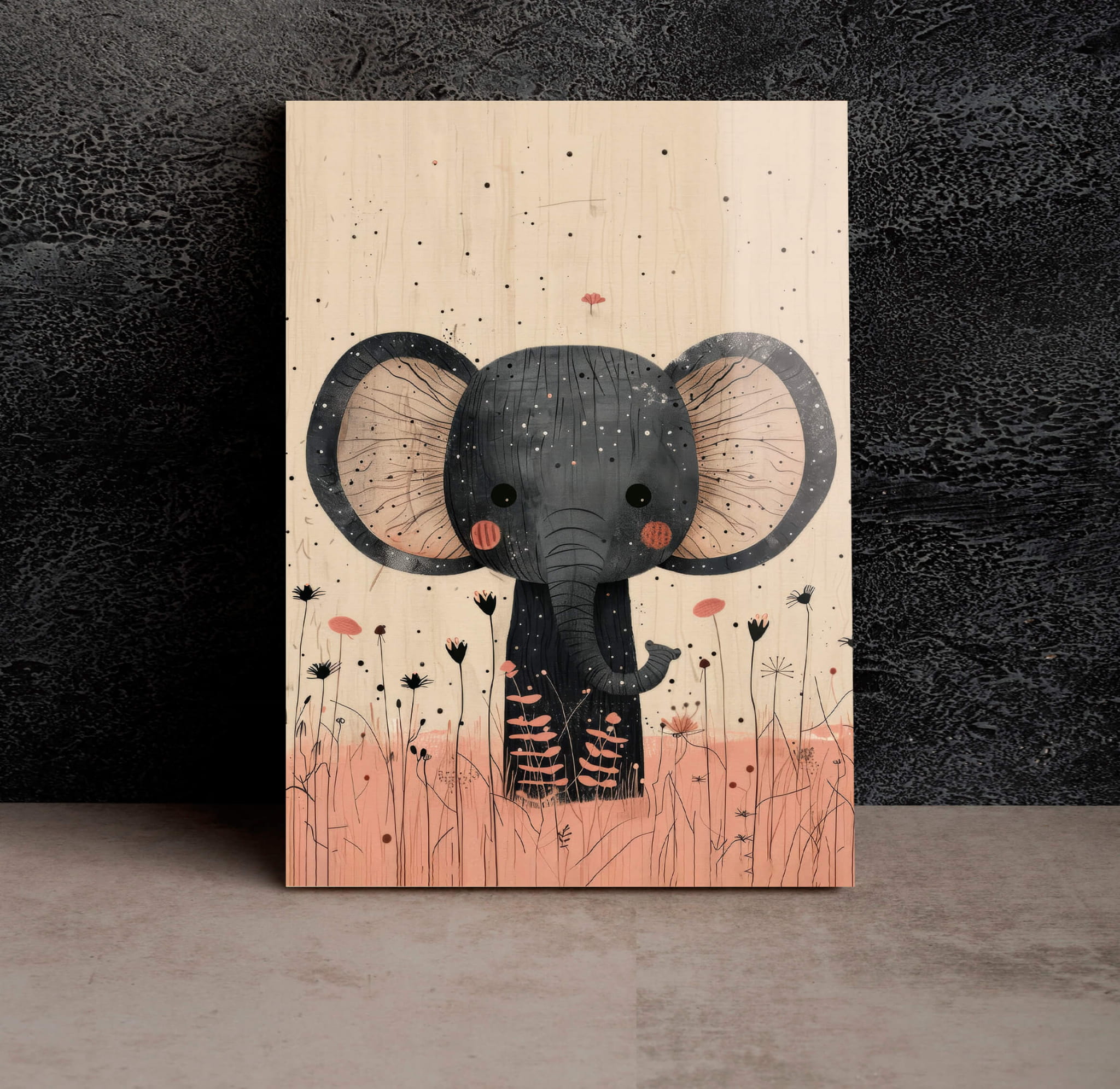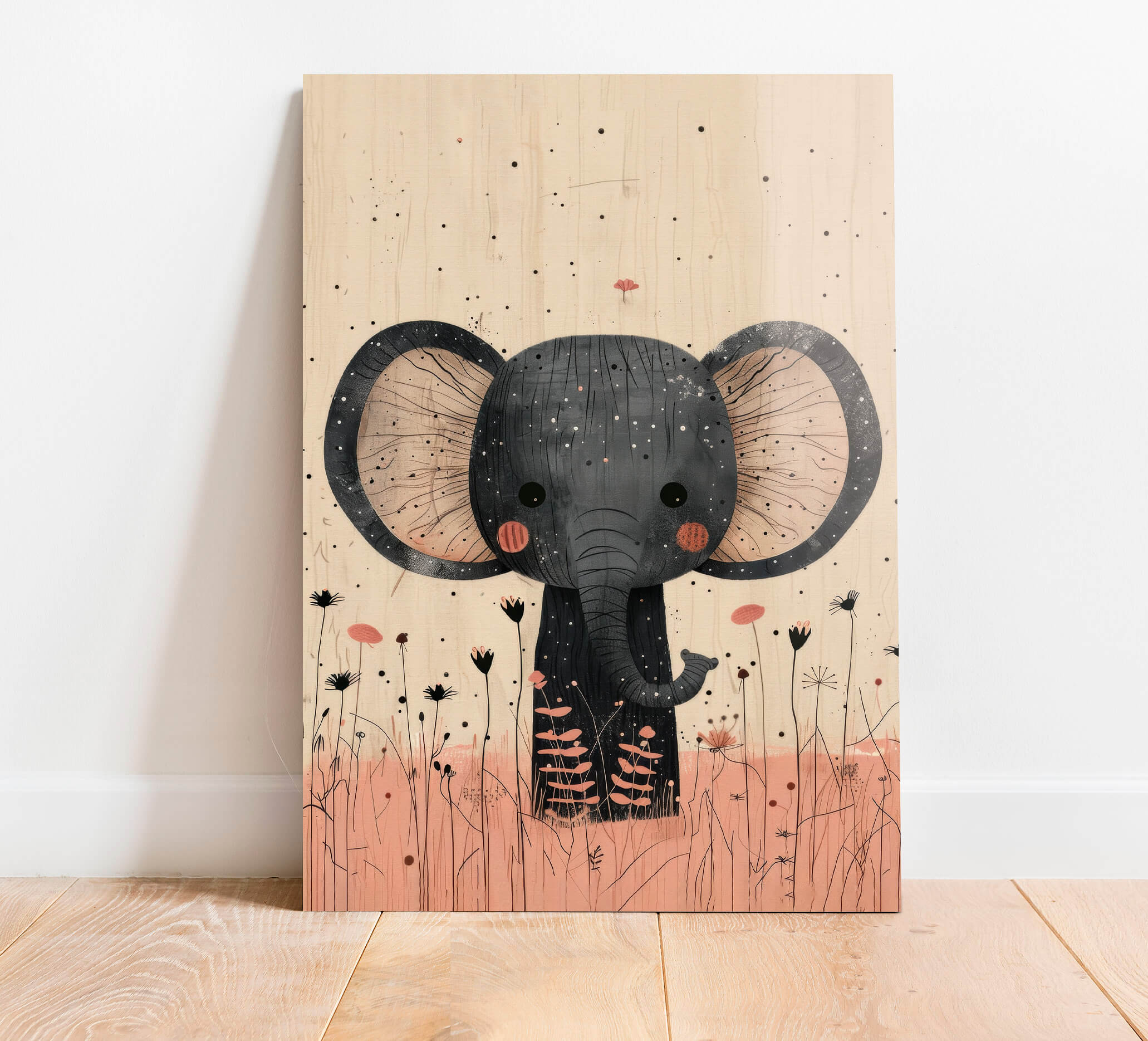 „Ilustracja słonia boho” przedstawia uroczego słonika otoczonego kwiatami i trawami w pastelowych odcieniach. Jego duże uszy i wielkie oczy nadają mu przyjazny wygląd, a długa trąba na tle kwitnącej łąki dodaje obrazowi uroku i lekkości. Małe kwiaty rosnące wokół słonia dodają naturalnego uroku, a delikatne kolory podkreślają spokojną i harmonijną atmosferę.