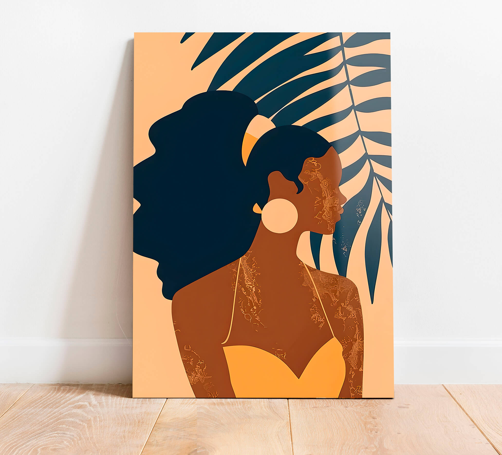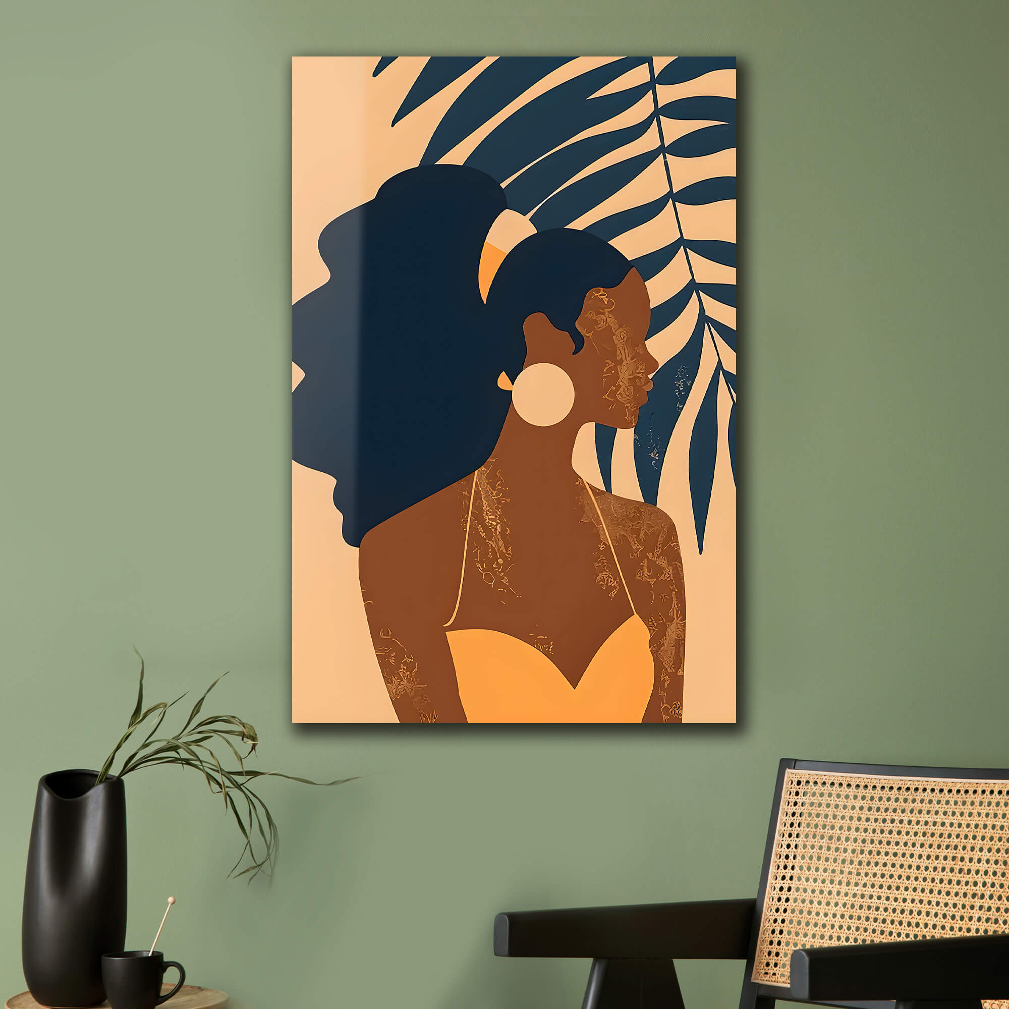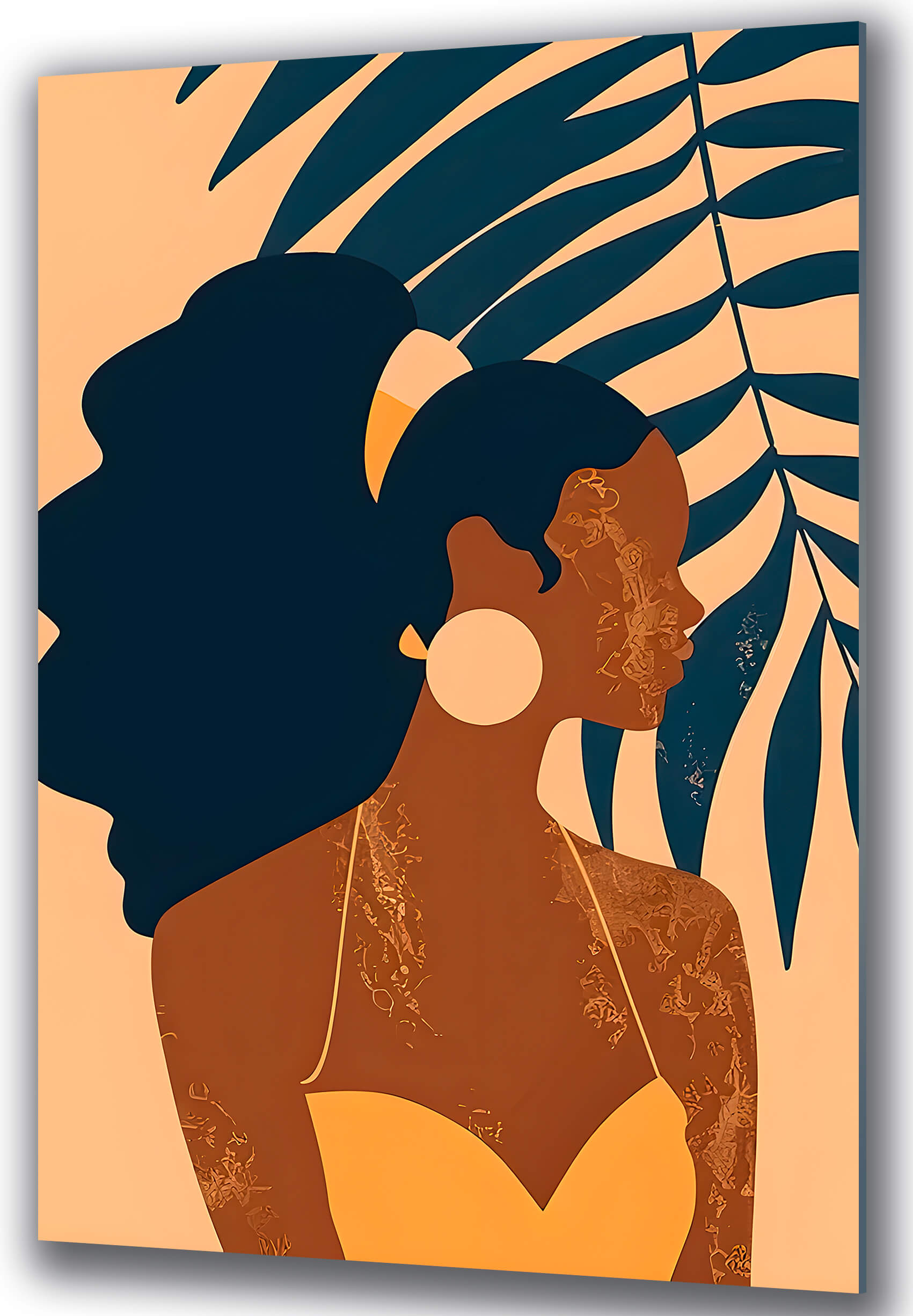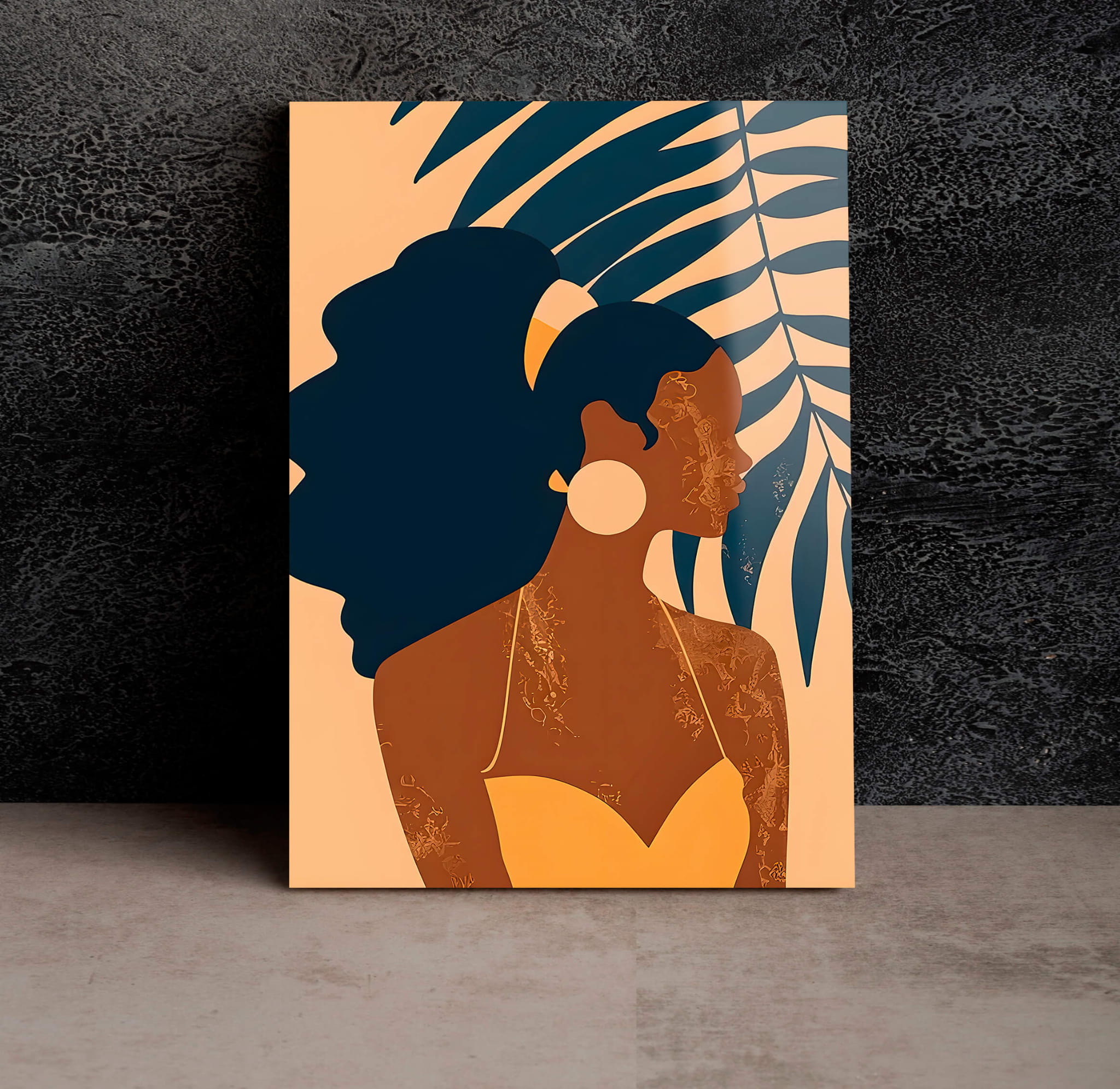 „Letni portret kobiety” przedstawia elegancki, abstrakcyjny profil kobiety na tle dużych zielonych liści. Stylizowany portret twarzy zawiera głębokie kolory, takie jak ciemny pomarańcz i czerń, nadając kompozycji elegancji i siły. Każde pociągnięcie i linia podkreślają indywidualność i kobiecość, a jasne kolory dodają ciepła i kontrastu.