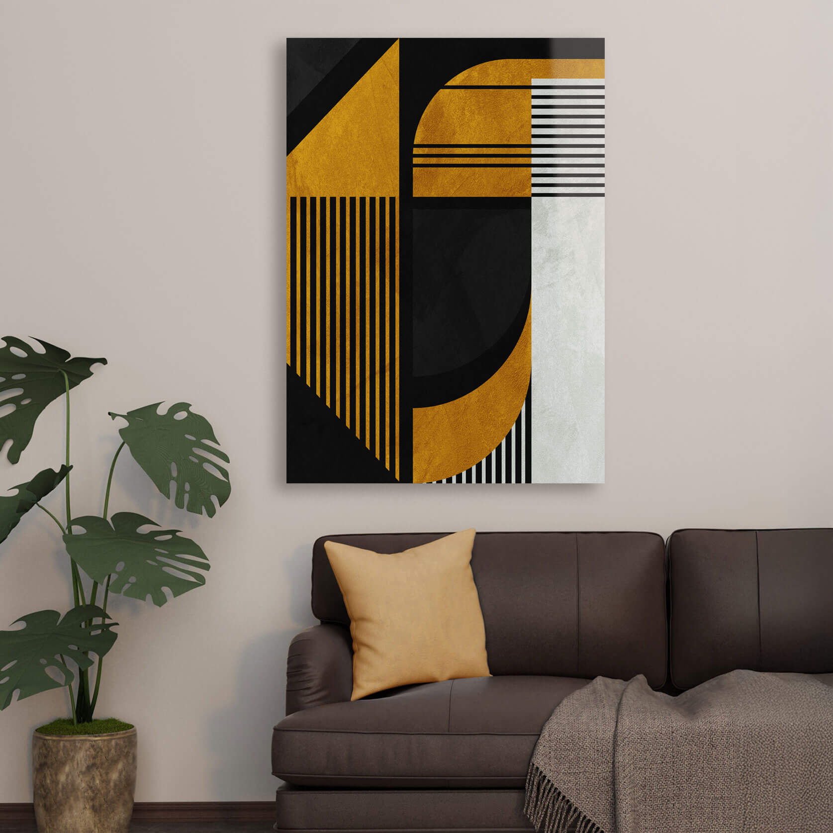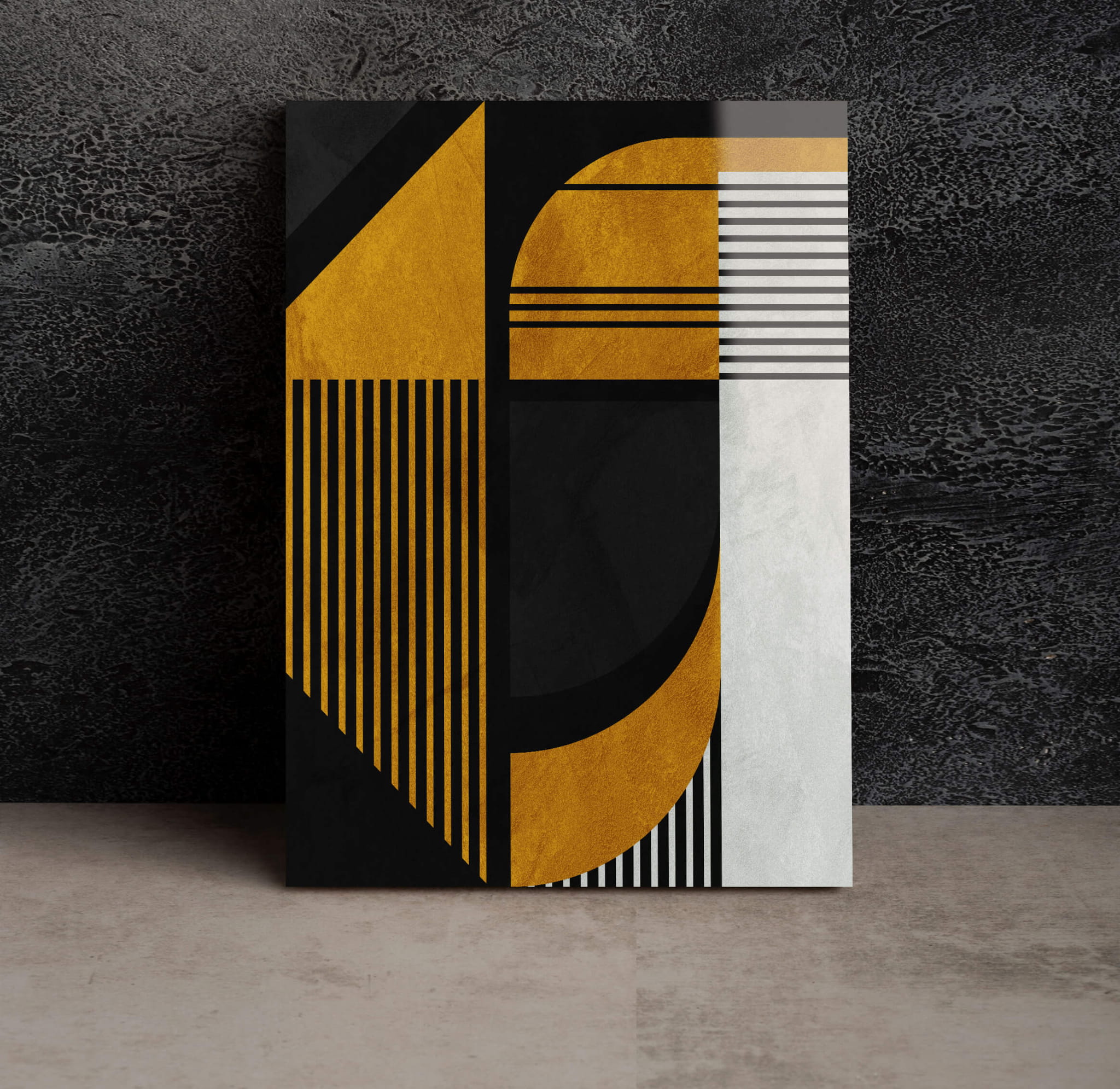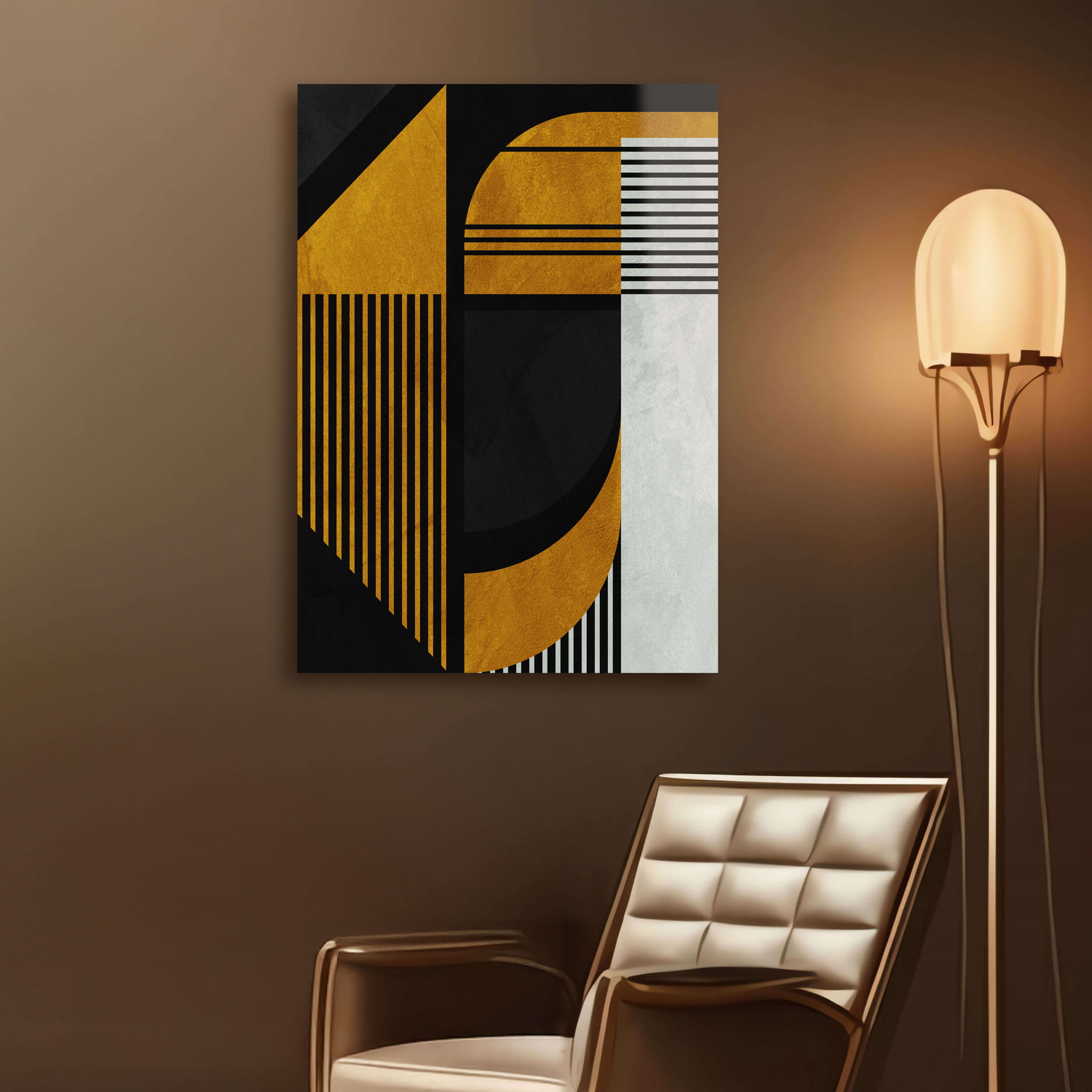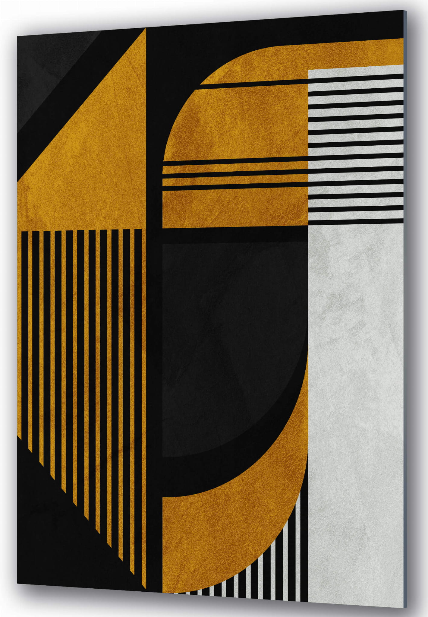 „Nowoczesna sztuka boho” łączy abstrakcyjne geometryczne kształty z kontrastującymi kolorami, tworząc stylową i dynamiczną kompozycję. Duże czarne i złote elementy harmonijnie przeplatają się z cienkimi białymi liniami, co nadaje obrazowi głębi i rytmu. Ostrość geometrycznych kształtów dodaje obrazowi rygoru, podczas gdy użycie złota wnosi wyrafinowanie i elegancję.