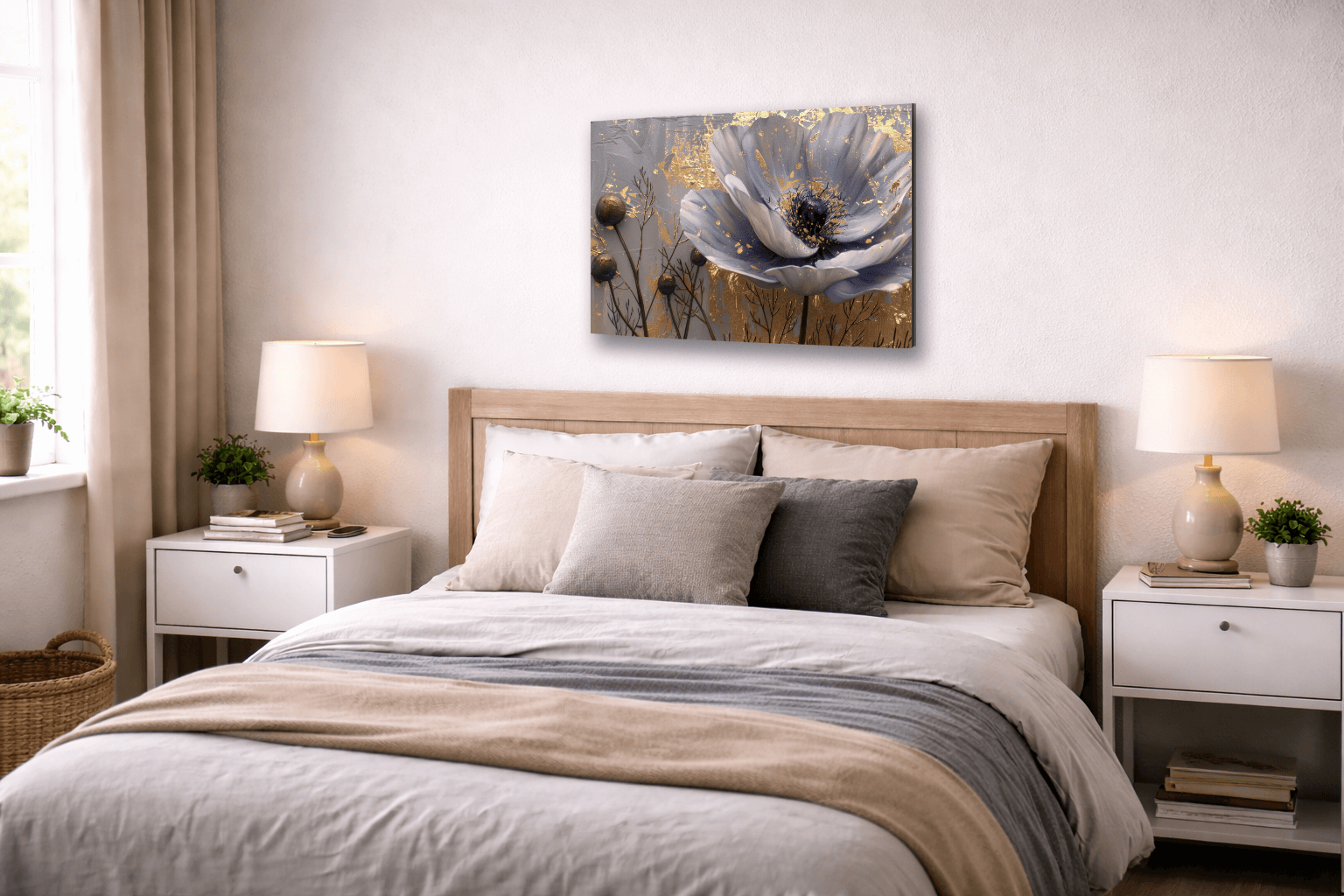 Ten obraz doskonale komponuje się z aranżacjami nowoczesnych i eleganckich wnętrz, takich jak salon, sypialnia czy jadalnia, ale równie dobrze sprawdzi się w kuchni lub przedpokoju, dodając przestrzeni klasy i subtelnego blasku. Złote elementy pięknie kontrastują z delikatnymi tonami kwiatu, nadając dekoracji głębi i wyjątkowego charakteru.