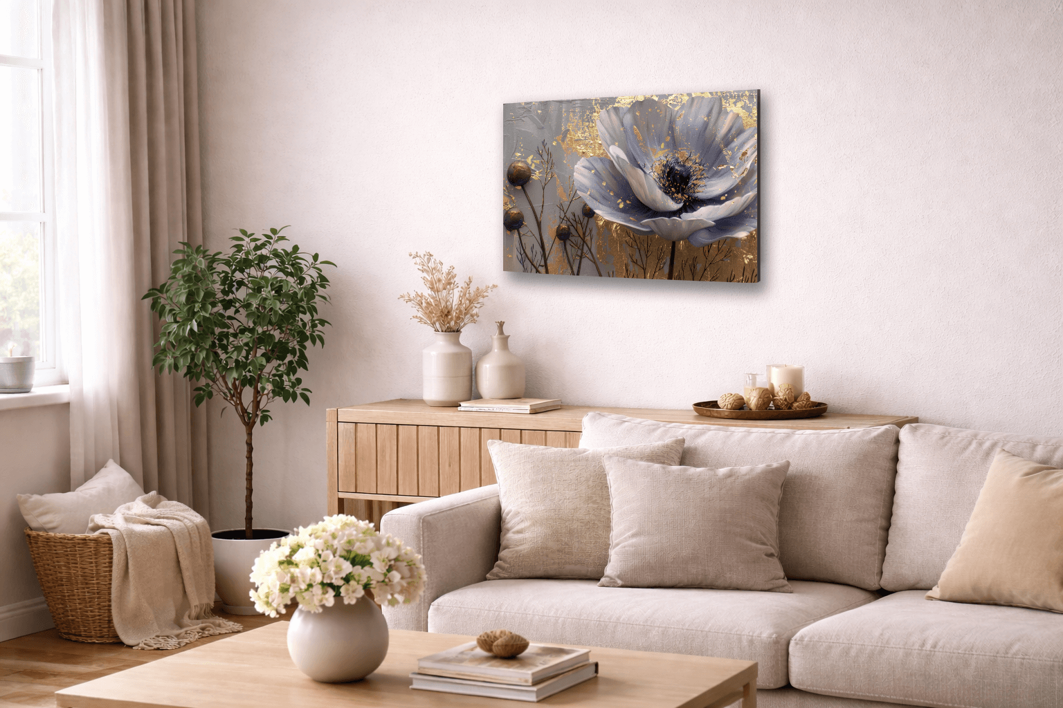 „Kwiat w złocie” to elegancki obraz na szkle, który zachwyca subtelnym połączeniem delikatnej florystyki z luksusowym złotym akcentem. Artystyczne przedstawienie kwiatu w otoczeniu złotych detali tworzy harmonijną i wyrafinowaną kompozycję, wprowadzając do wnętrza spokój, ciepło i ponadczasowy styl.