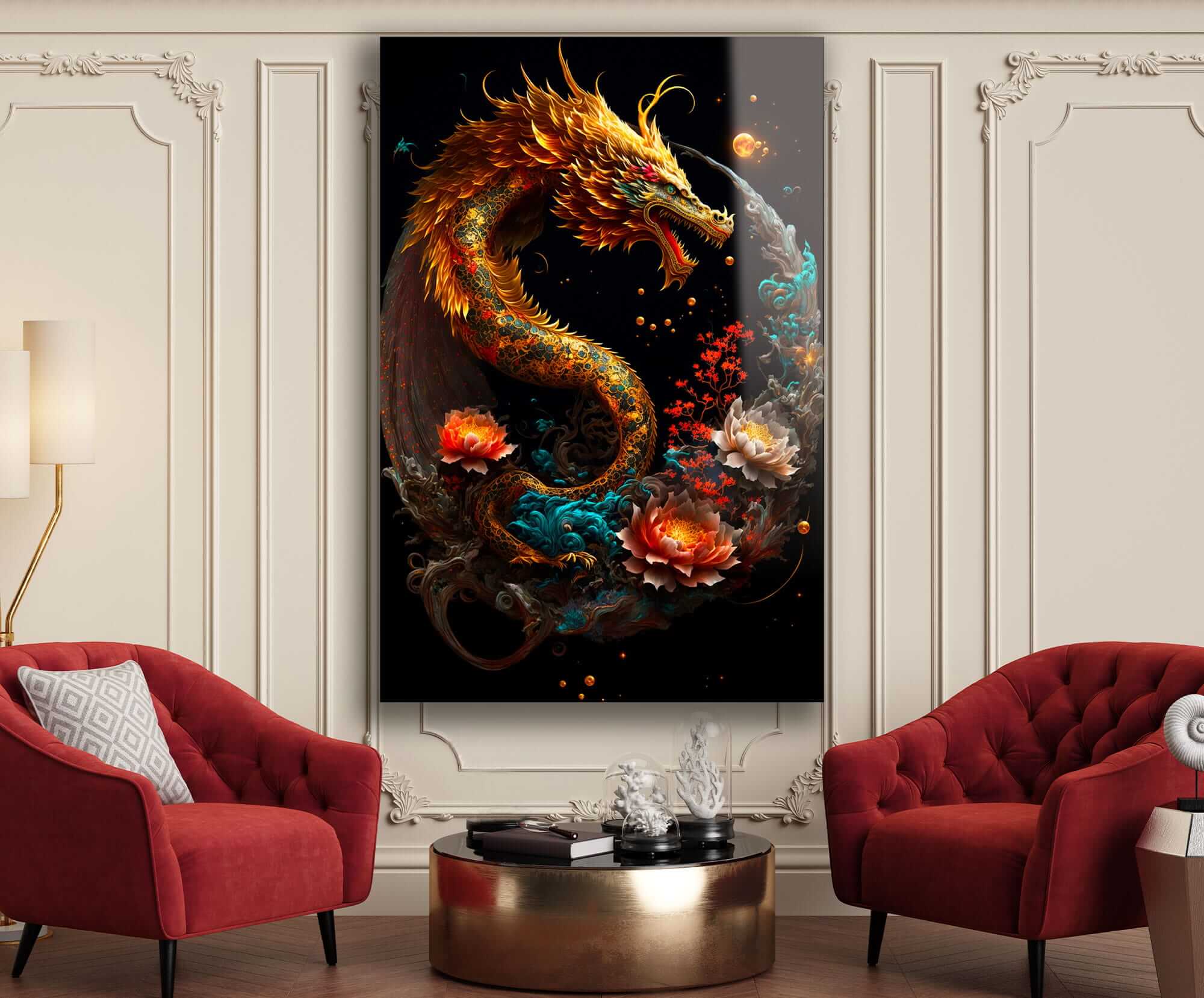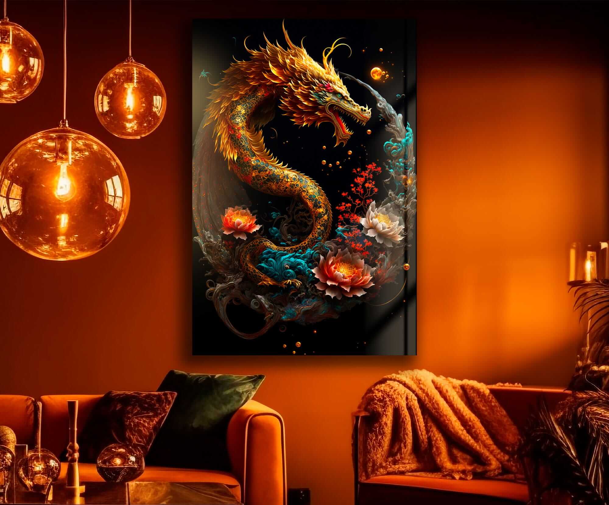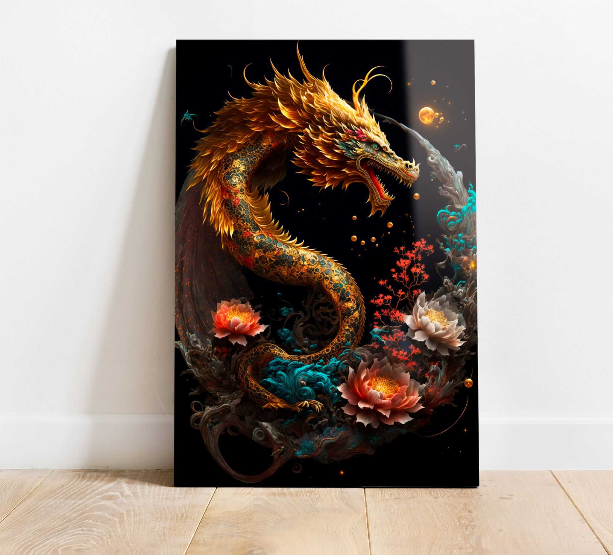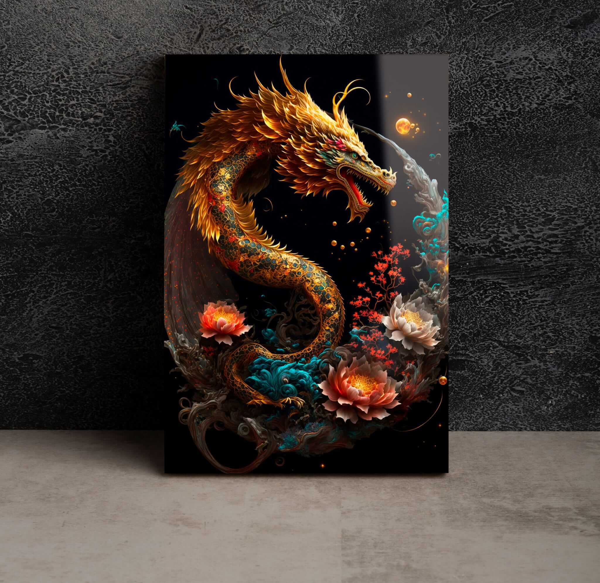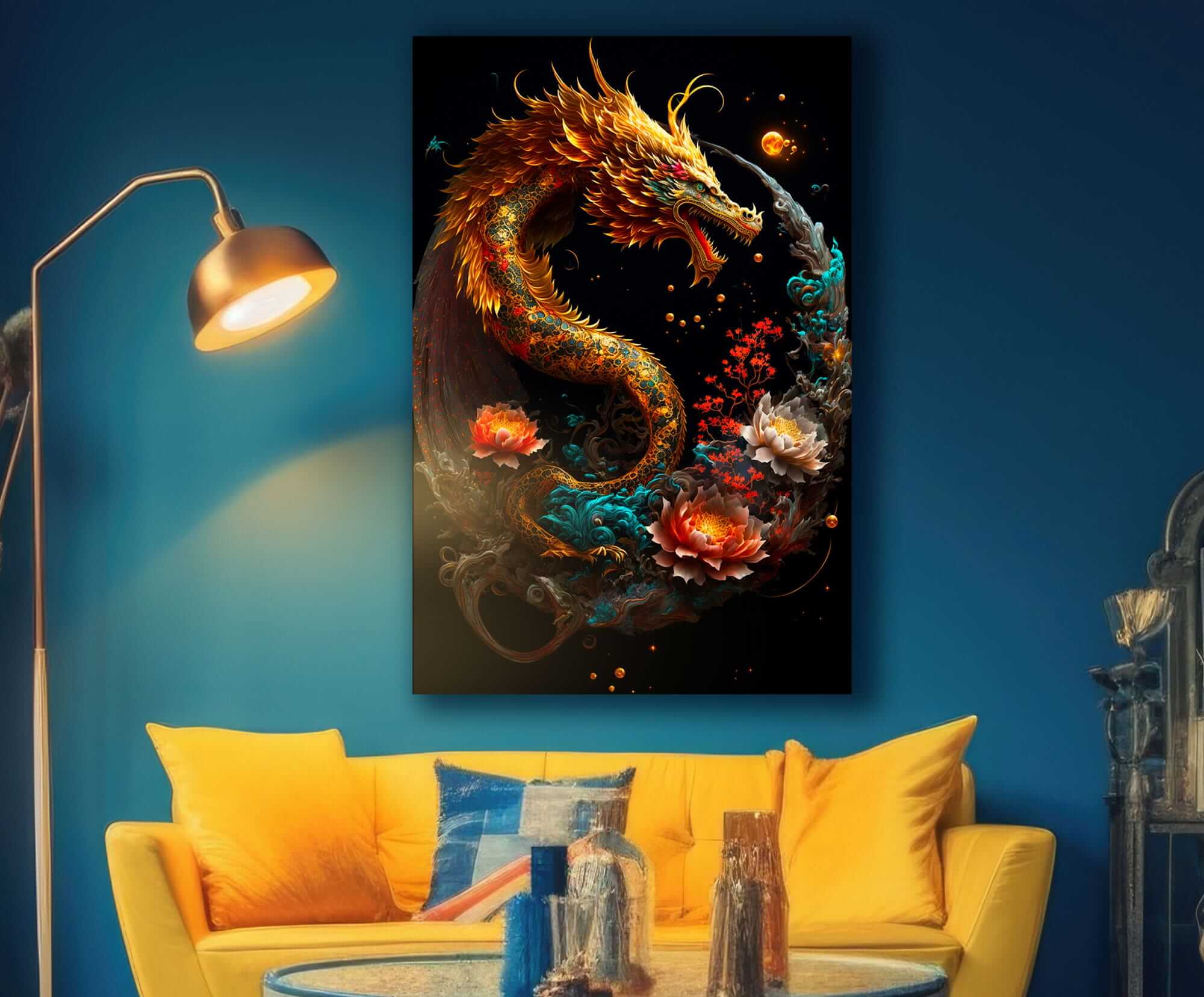 „Smok – Zwierzę Roku”. Ten żywy obraz na szkle przedstawia majestatycznego smoka – symbol mocy, mądrości i dobrobytu w chińskim horoskopie. Złoty smok z delikatnymi detalami wydaje się ożywać wśród kwitnących lotosów, które podkreślają harmonię i energię natury. Jego dynamiczna poza i lśniące łuski w połączeniu z bogatym czarnym tłem tworzą uderzający kontrast i przyciągają uwagę. Fantazyjne elementy, takie jak luksusowe kwiaty i motywy kosmiczne, dodają obrazowi tajemniczości i uroku. Ten szklany obraz stanie się wspaniałym akcentem w każdym wnętrzu, wprowadzając atmosferę dynamiki, harmonii i symboliki. Obraz jest idealny dla osób zafascynowanych symboliką chińskiego horoskopu lub poszukujących wyjątkowego elementu dekoracyjnego.
