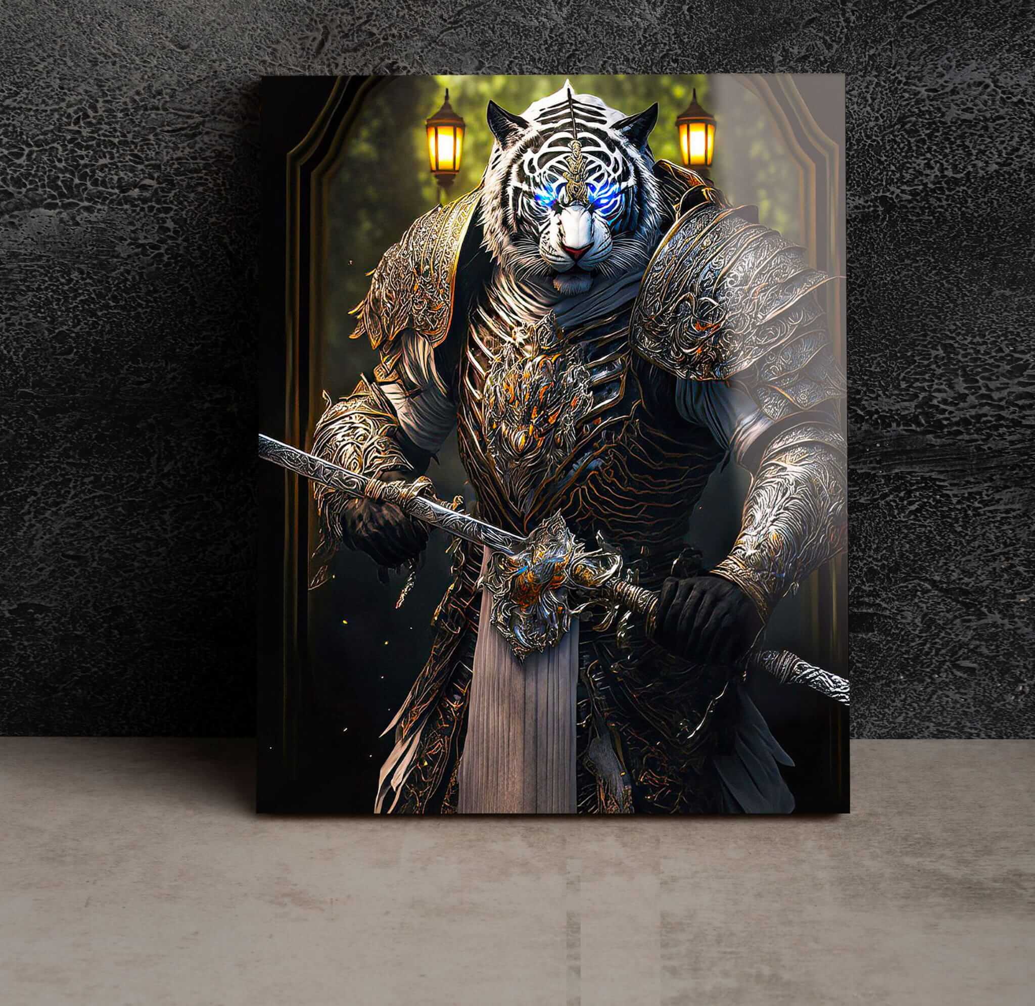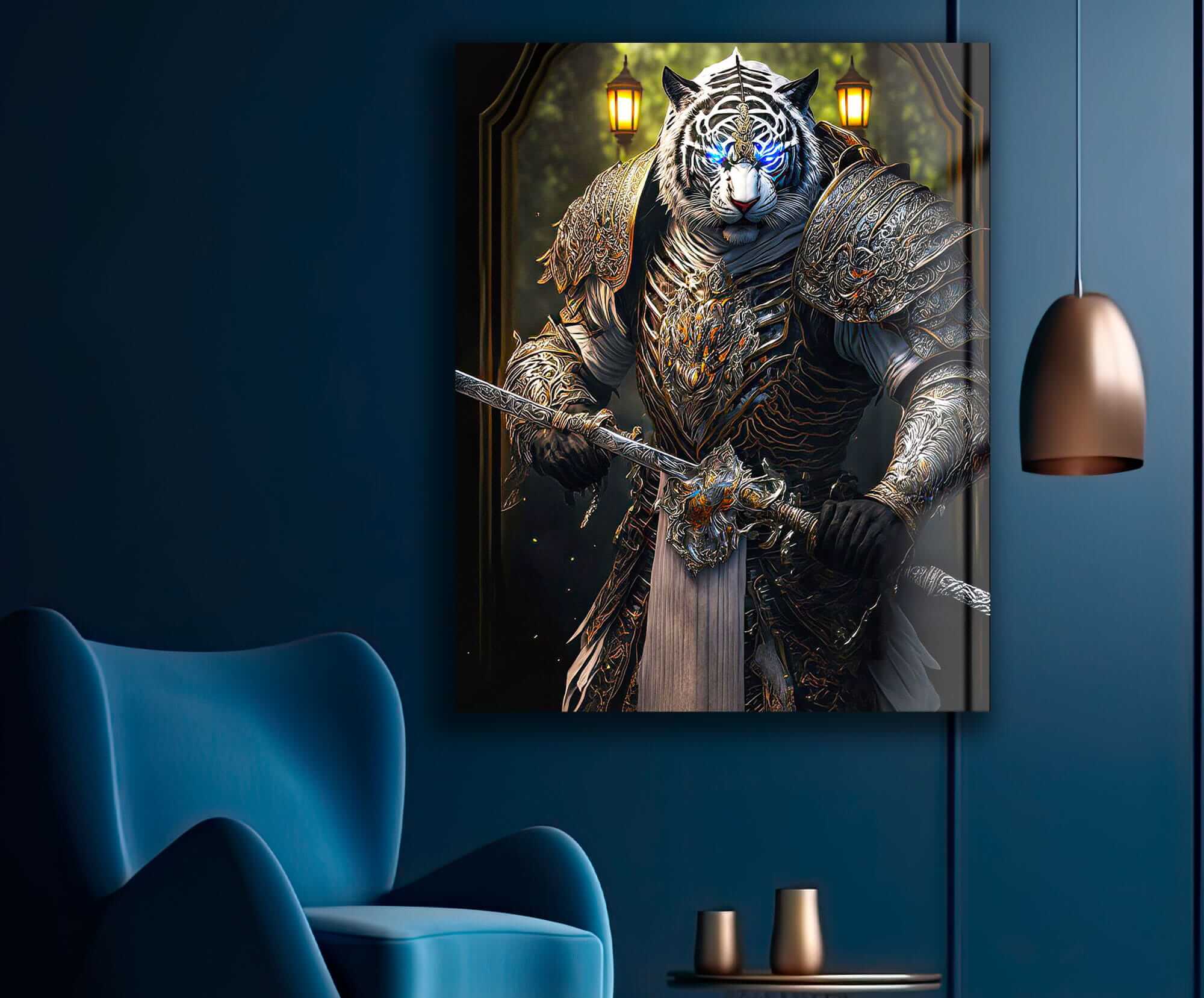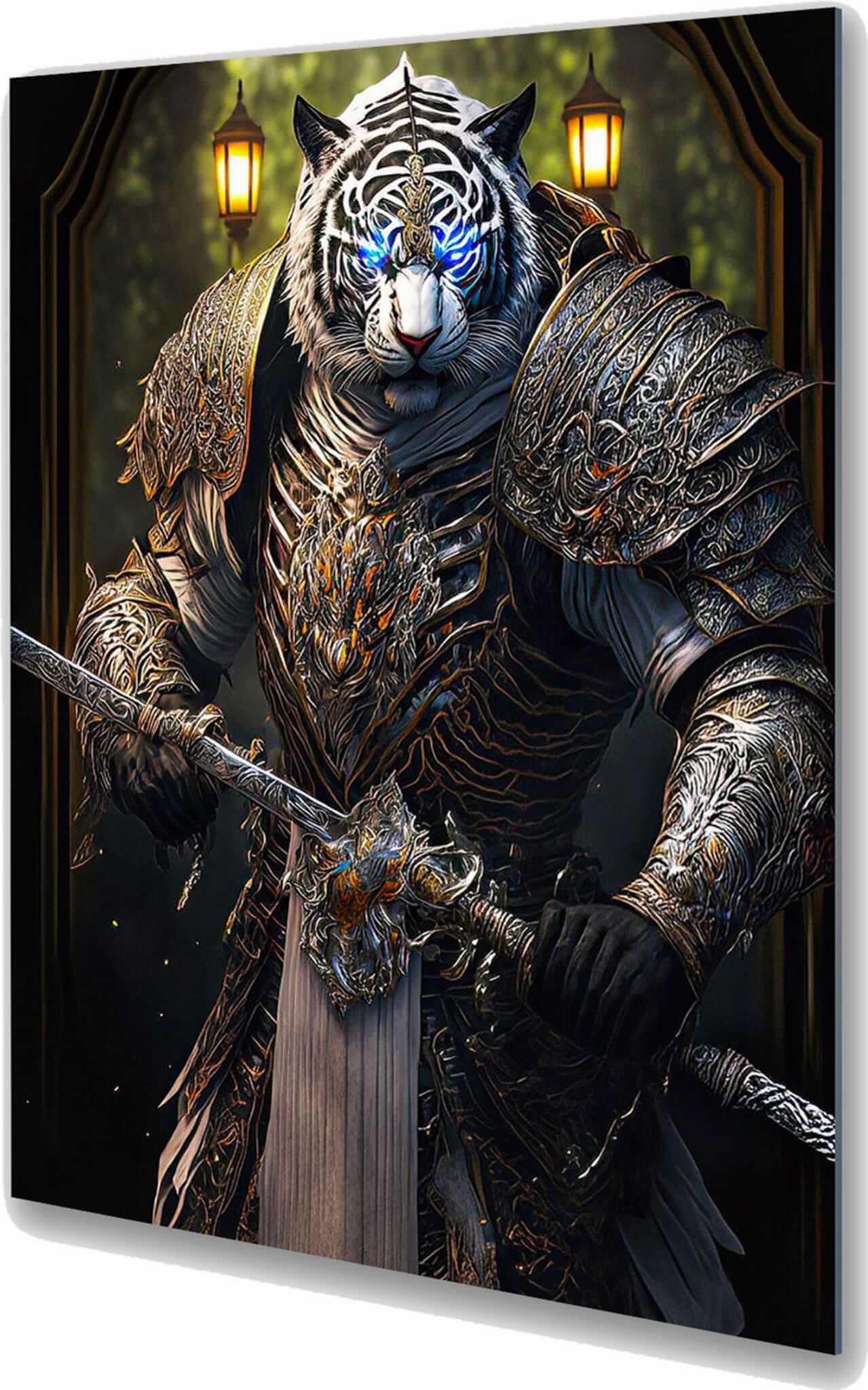 Ten obraz na szkle zatytułowany „Tygrys Królem Roku Rok Tygrysa” łączy w sobie elementy chińskiej astrologii i sztuki fantasy. Obraz przedstawia potężnego tygrysa ubranego w luksusową zbroję i trzymającego miecz, symbolizujący siłę i odwagę. Jego jasne niebieskie oczy dodają mistycyzmu i magii, a sama kompozycja łączy elementy realistycznej techniki z abstrakcją, tworząc fascynujący, fantastyczny obraz. To niezwykły obraz szklany tygrys, który stanie się jasnym akcentem każdego wnętrza, symbolizując energię i moc Roku Tygrysa. Taki obraz tygrys na szkle doskonale wpisuje się w nowoczesny design, a jednocześnie nawiązuje do symboliki horoskopu i tradycji Dalekiego Wschodu.