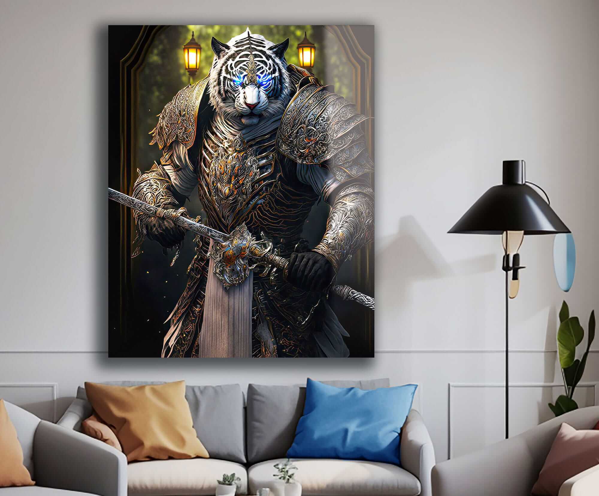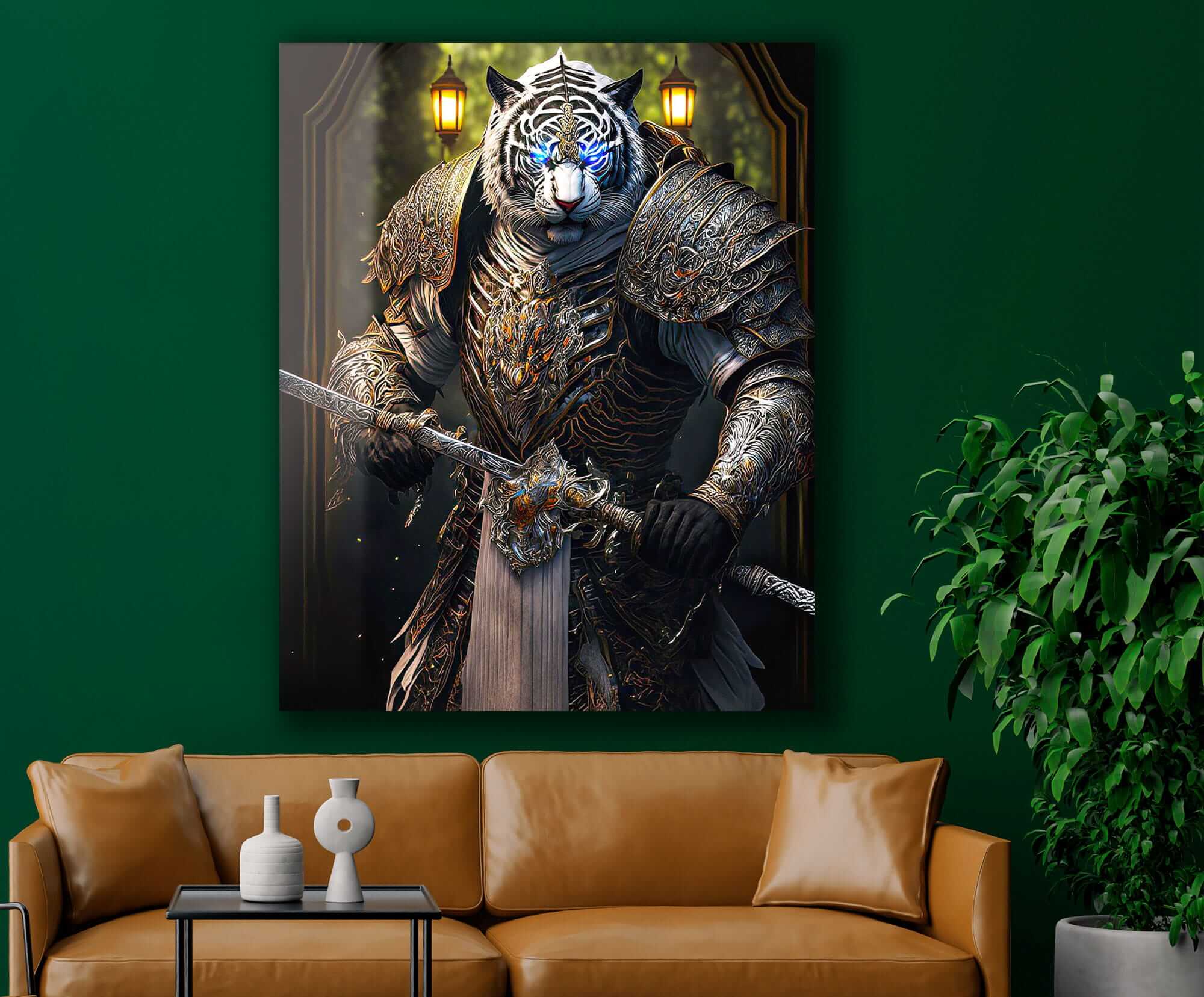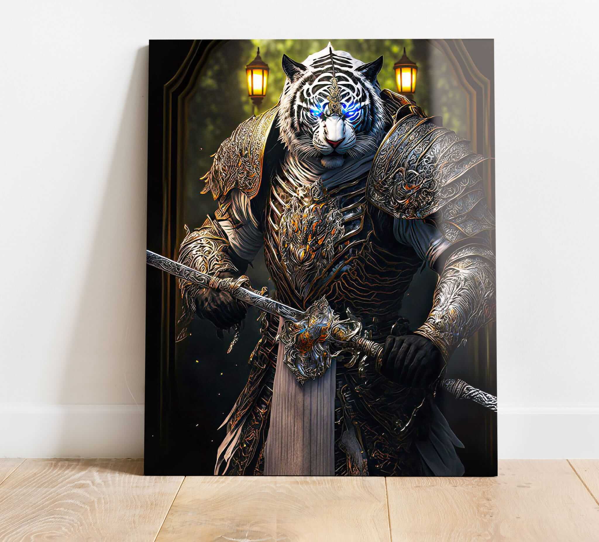 Ten obraz na szkle zatytułowany „Tygrys Królem Roku Rok Tygrysa” łączy w sobie elementy chińskiej astrologii i sztuki fantasy. Obraz przedstawia potężnego tygrysa ubranego w luksusową zbroję i trzymającego miecz, symbolizujący siłę i odwagę. Jego jasne niebieskie oczy dodają mistycyzmu i magii, a sama kompozycja łączy elementy realistycznej techniki z abstrakcją, tworząc fascynujący, fantastyczny obraz. To niezwykły obraz szklany tygrys, który stanie się jasnym akcentem każdego wnętrza, symbolizując energię i moc Roku Tygrysa. Taki obraz tygrys na szkle doskonale wpisuje się w nowoczesny design, a jednocześnie nawiązuje do symboliki horoskopu i tradycji Dalekiego Wschodu.