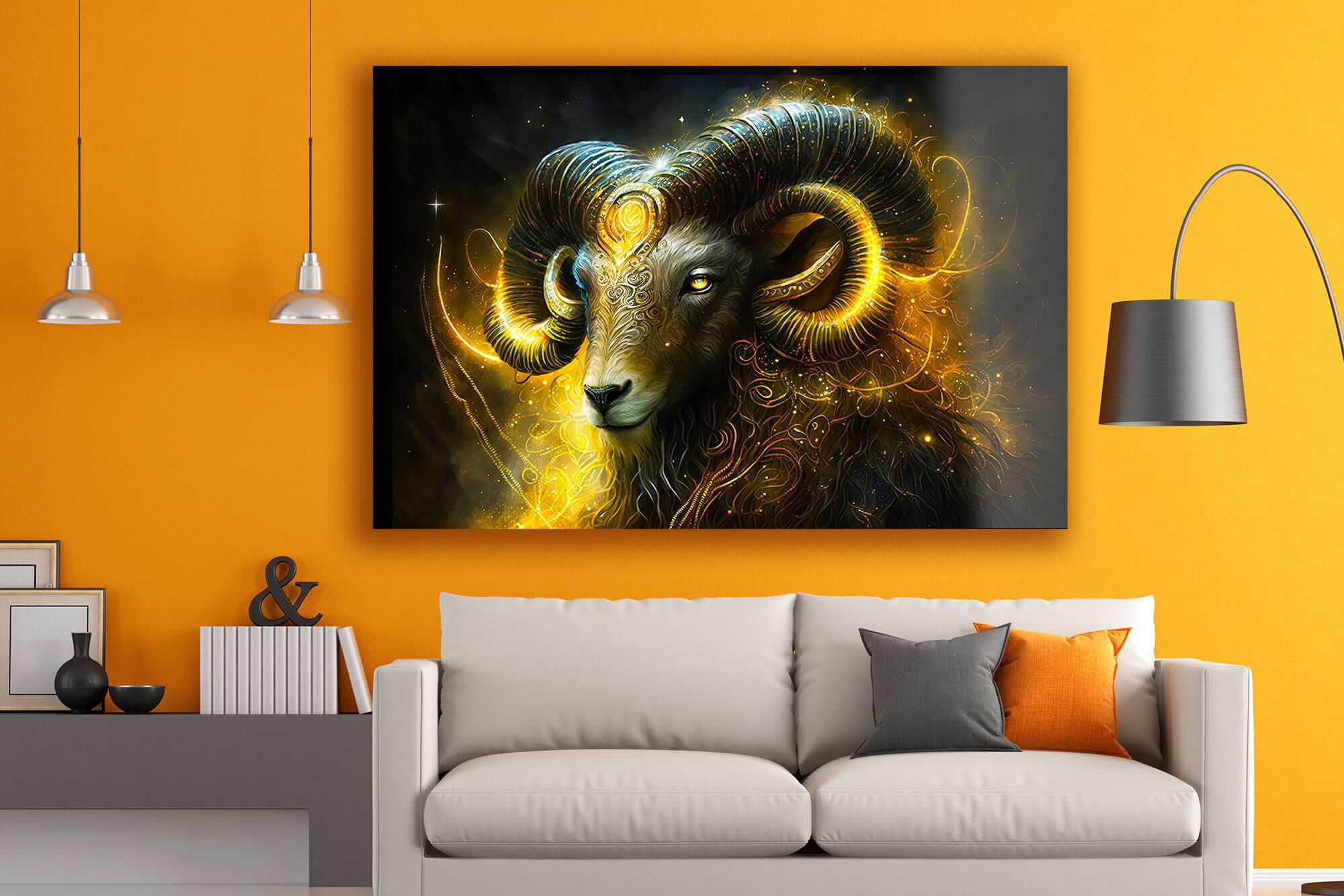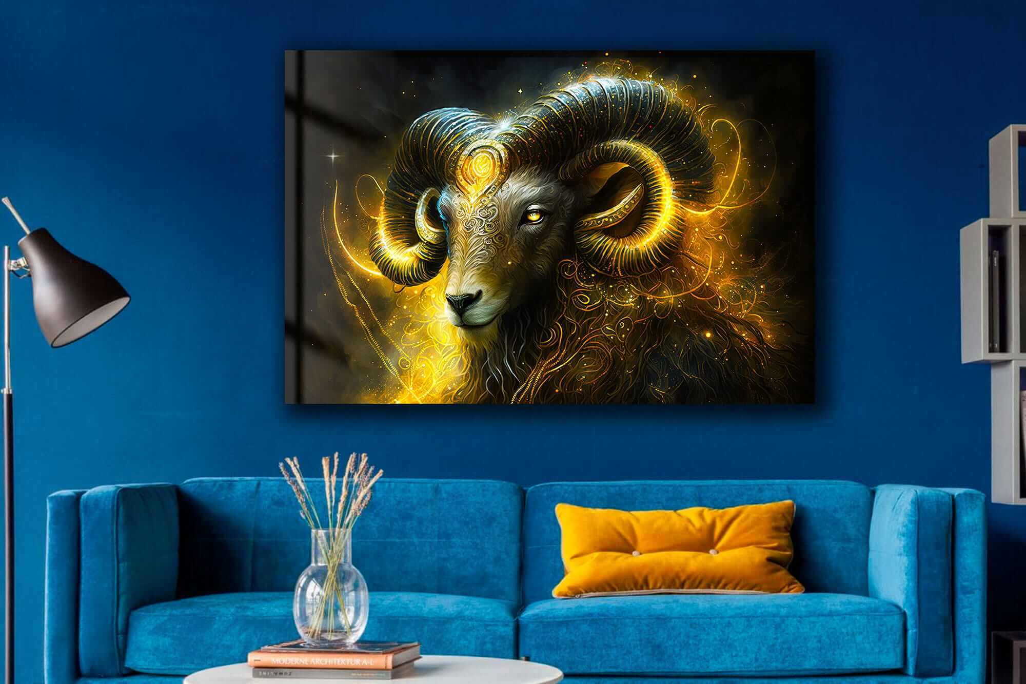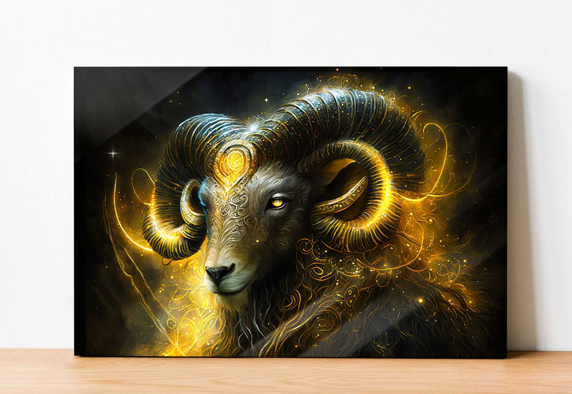 „Znak Zodiaku Baran Ognisty Aries”. Ten wyjątkowy obraz na szkle przedstawia symbol znaku zodiaku Baran. W centrum kompozycji znajduje się potężny baran z zakręconymi rogami, który symbolizuje siłę, determinację i przywództwo. Jego wizerunek emanuje energią i pewnością siebie, a złote akcenty podkreślają majestat oraz związek z kosmosem i astrologią.