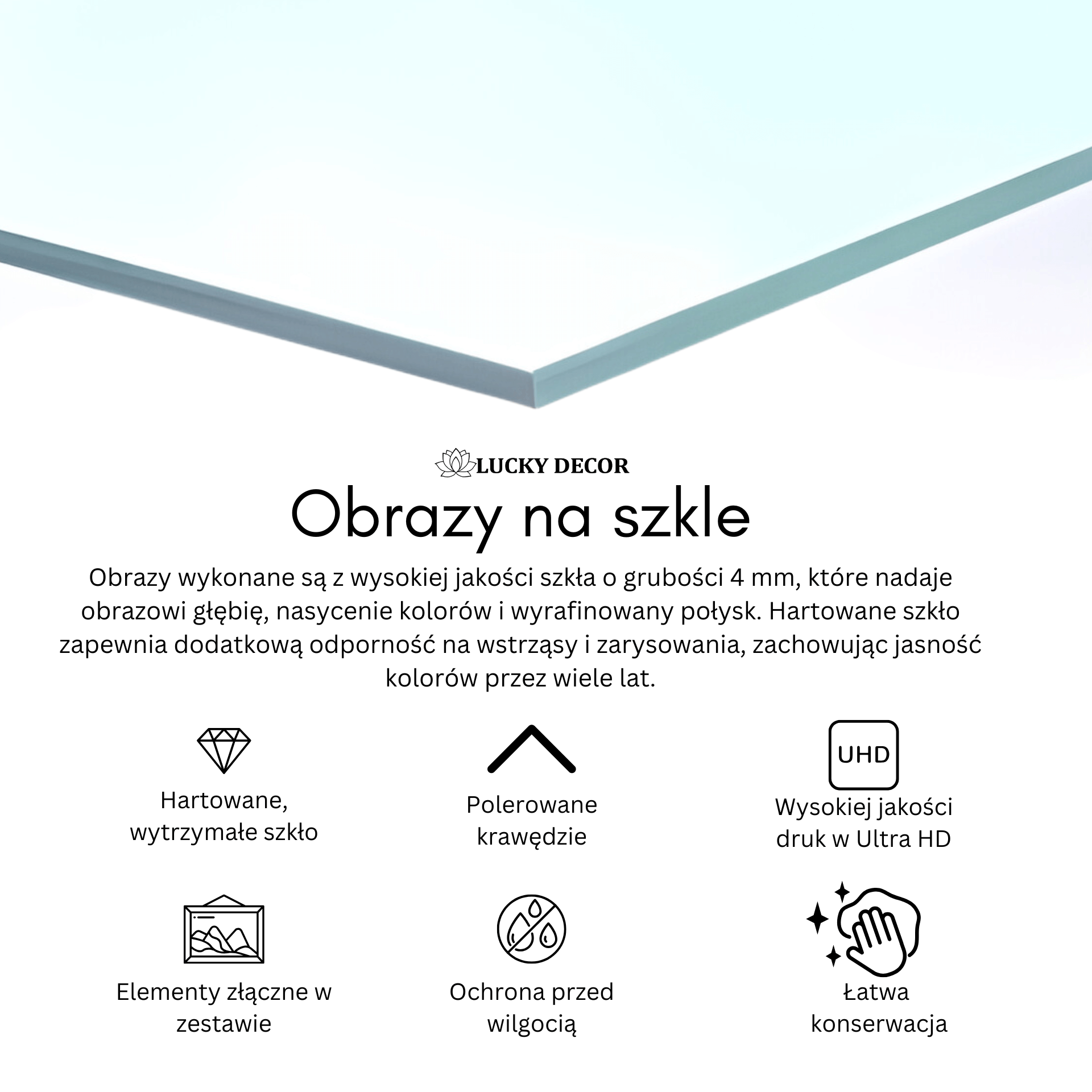 Obrazy na szkle powstają z hartowanego szkła o wysokiej trwałości, na które nanoszony jest nadruk w jakości HD. Dzięki temu mają nowoczesny wygląd i są odporne na uszkodzenia.