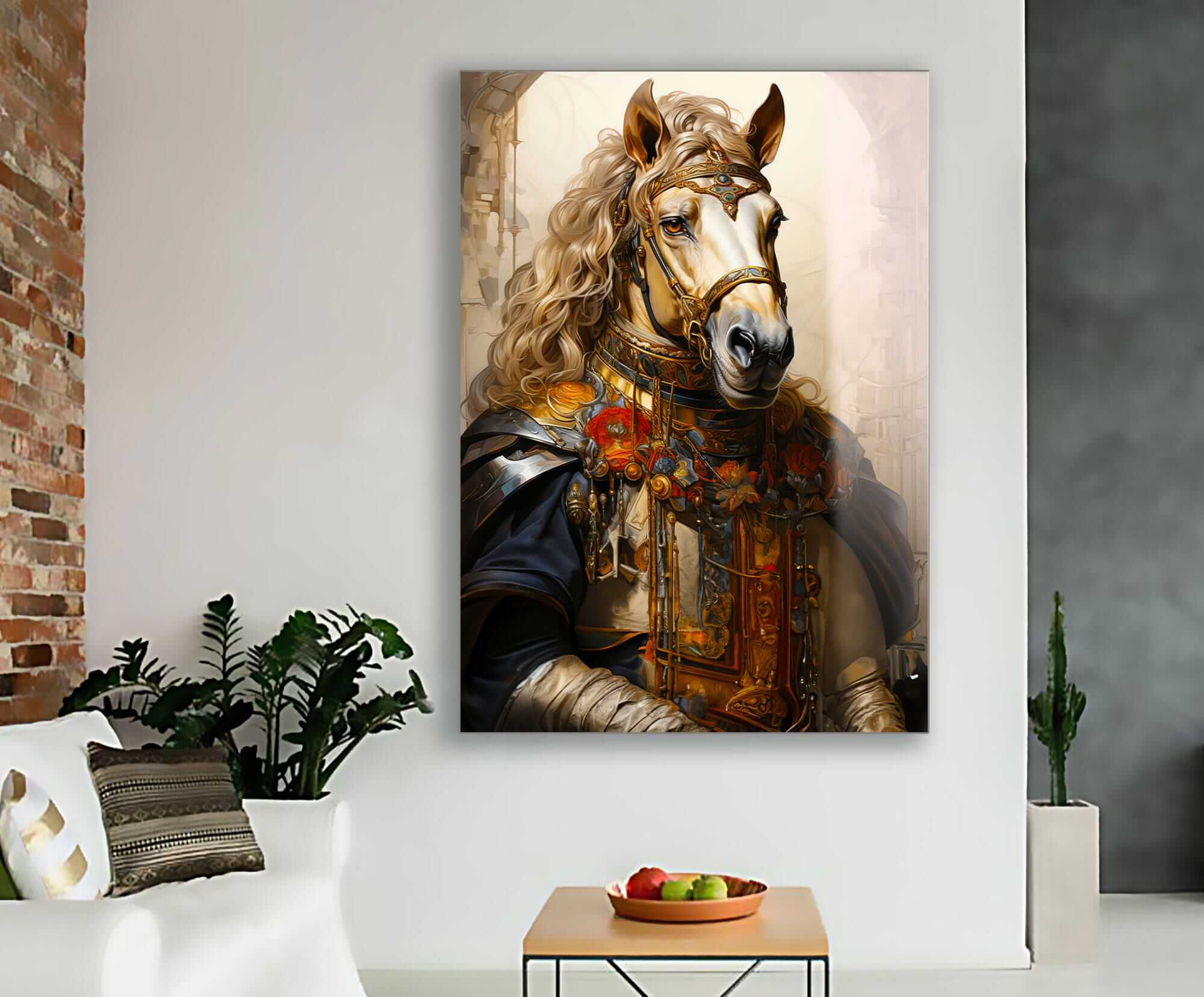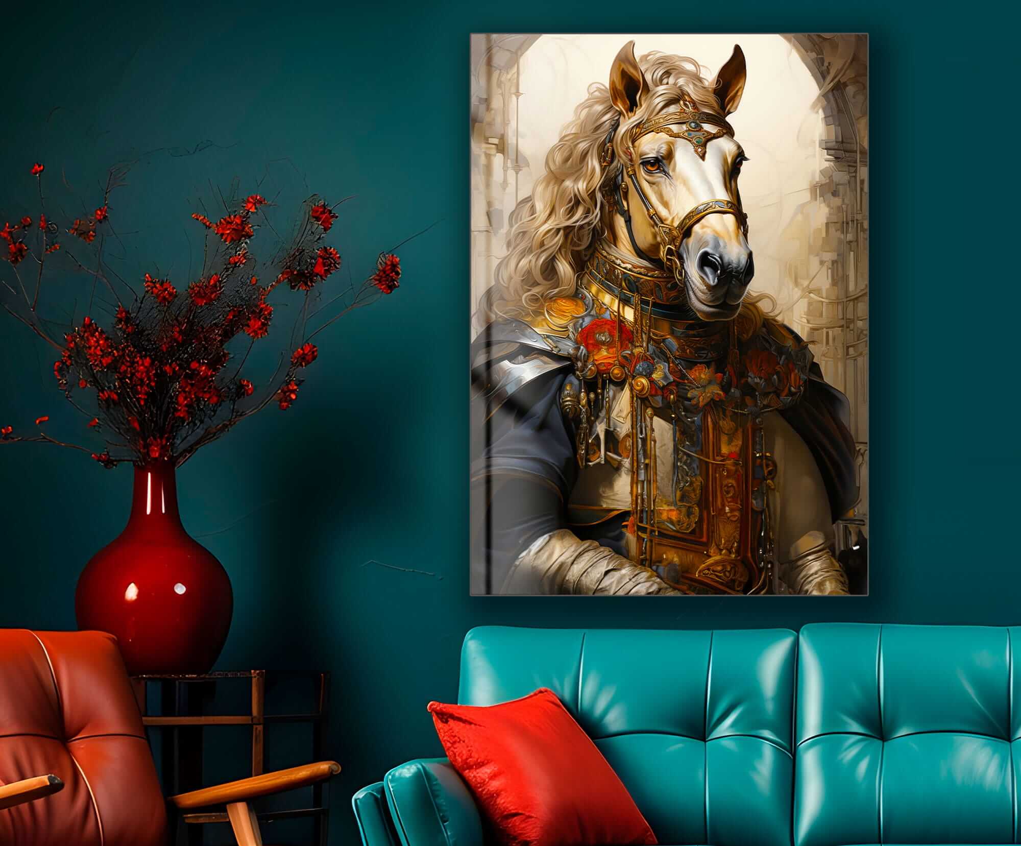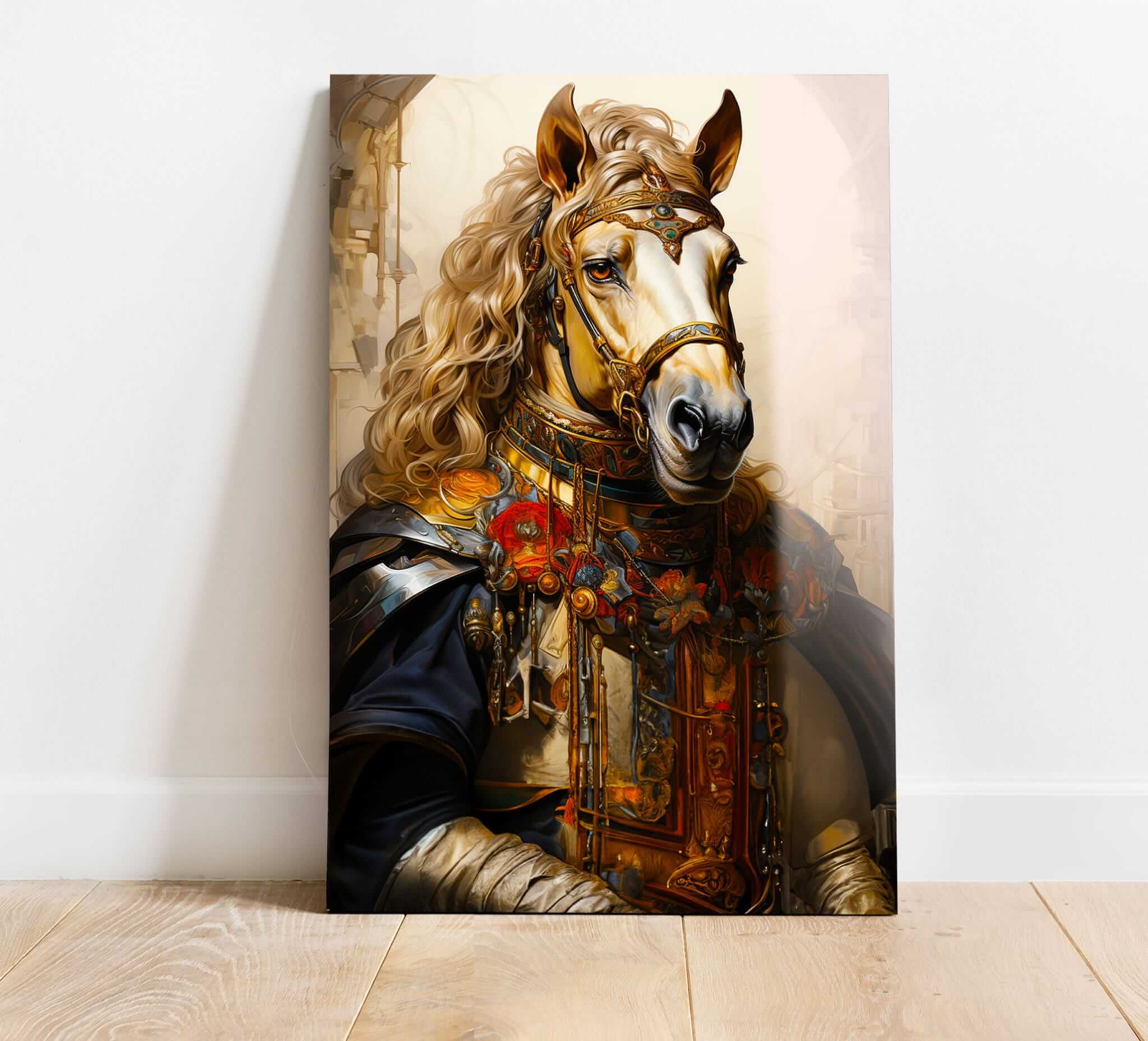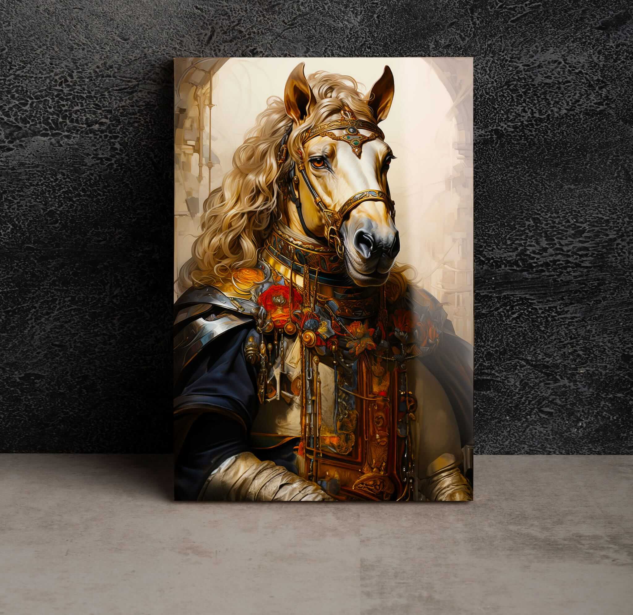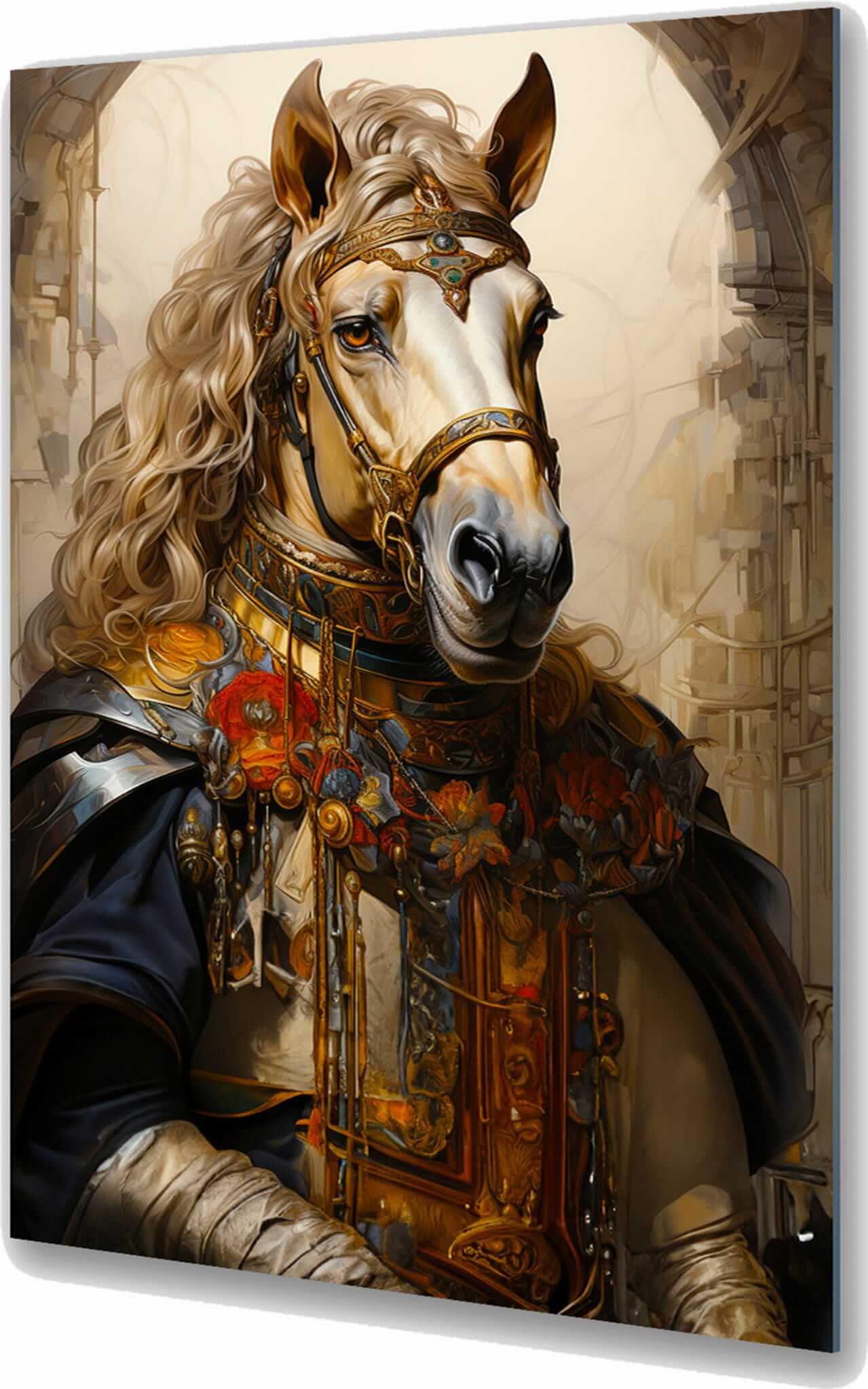 „Zwierzę Roku – Królewski Koń”. Ten wykwintny obraz na szkle przedstawia majestatycznego konia – symbol Roku Konia według chińskiego horoskopu, reprezentującego siłę, wolność i energię. Koń jest przedstawiony w królewski sposób: luksusowe dekoracje, złote detale i wykwintna zbroja podkreślają jego szlachetność i majestat.