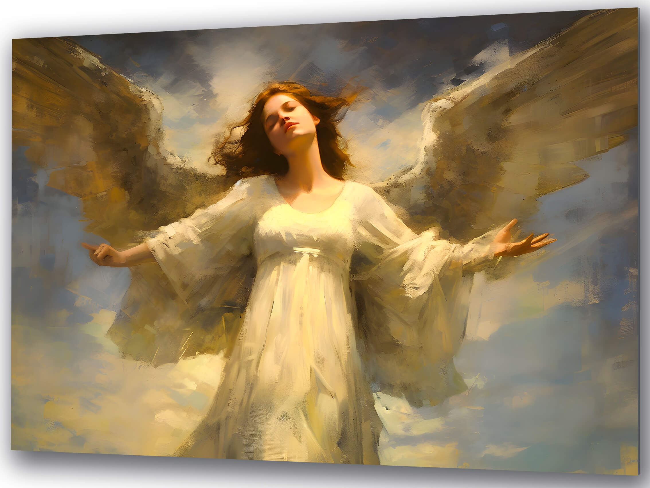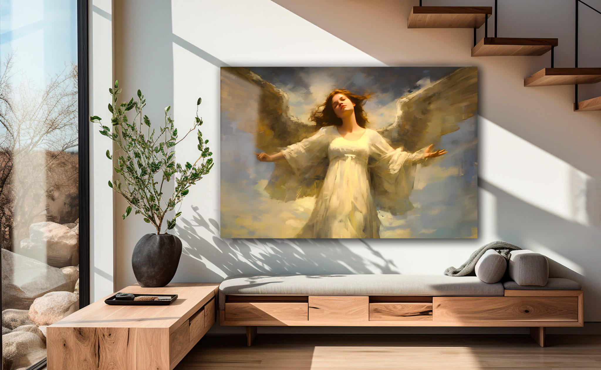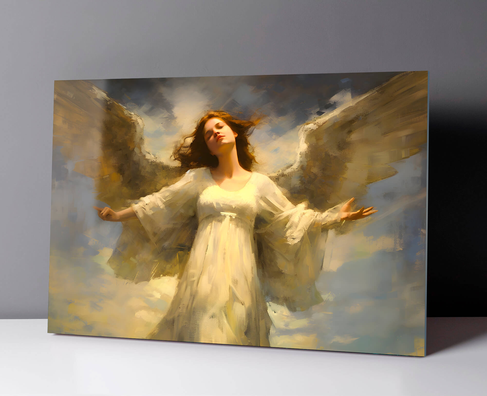 „Anielski blask” przedstawia anioła w śnieżnobiałej sukni rozpościerającego skrzydła na niebie, otoczonego światłem i chmurami. Jej twarz wyraża spokój i szlachetność, a lekkość jej ruchów sprawia wrażenie, jakby unosiła się w górę, wypełniając otaczającą ją przestrzeń atmosferą spokoju i harmonii. Anioł w tej kompozycji symbolizuje duchową siłę i inspirację. Obraz na szkle jest doskonałym wyborem dla tych, którzy szukają atmosfery spokoju, duchowej mocy oraz elegancji w swoim domu.