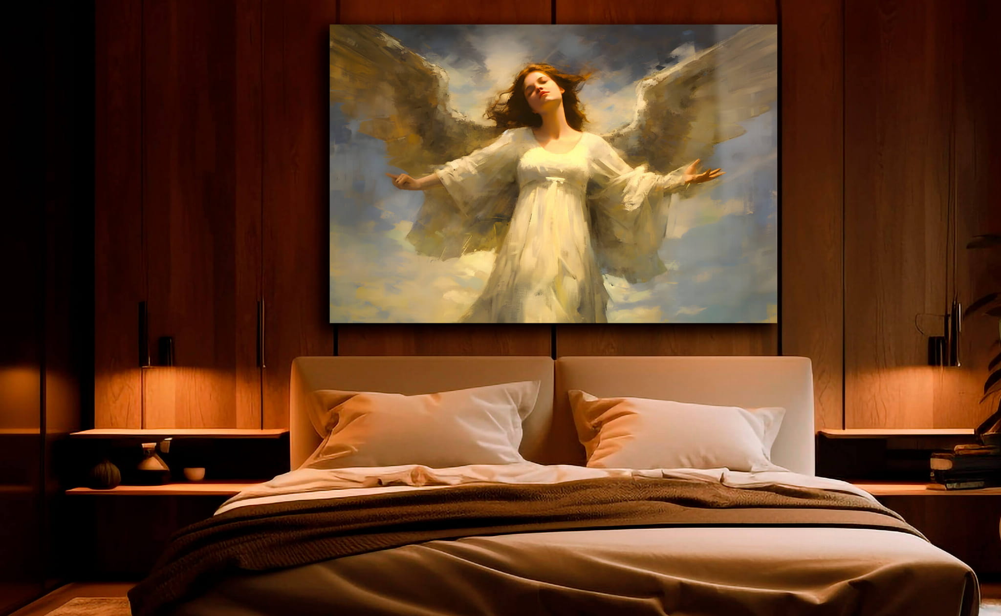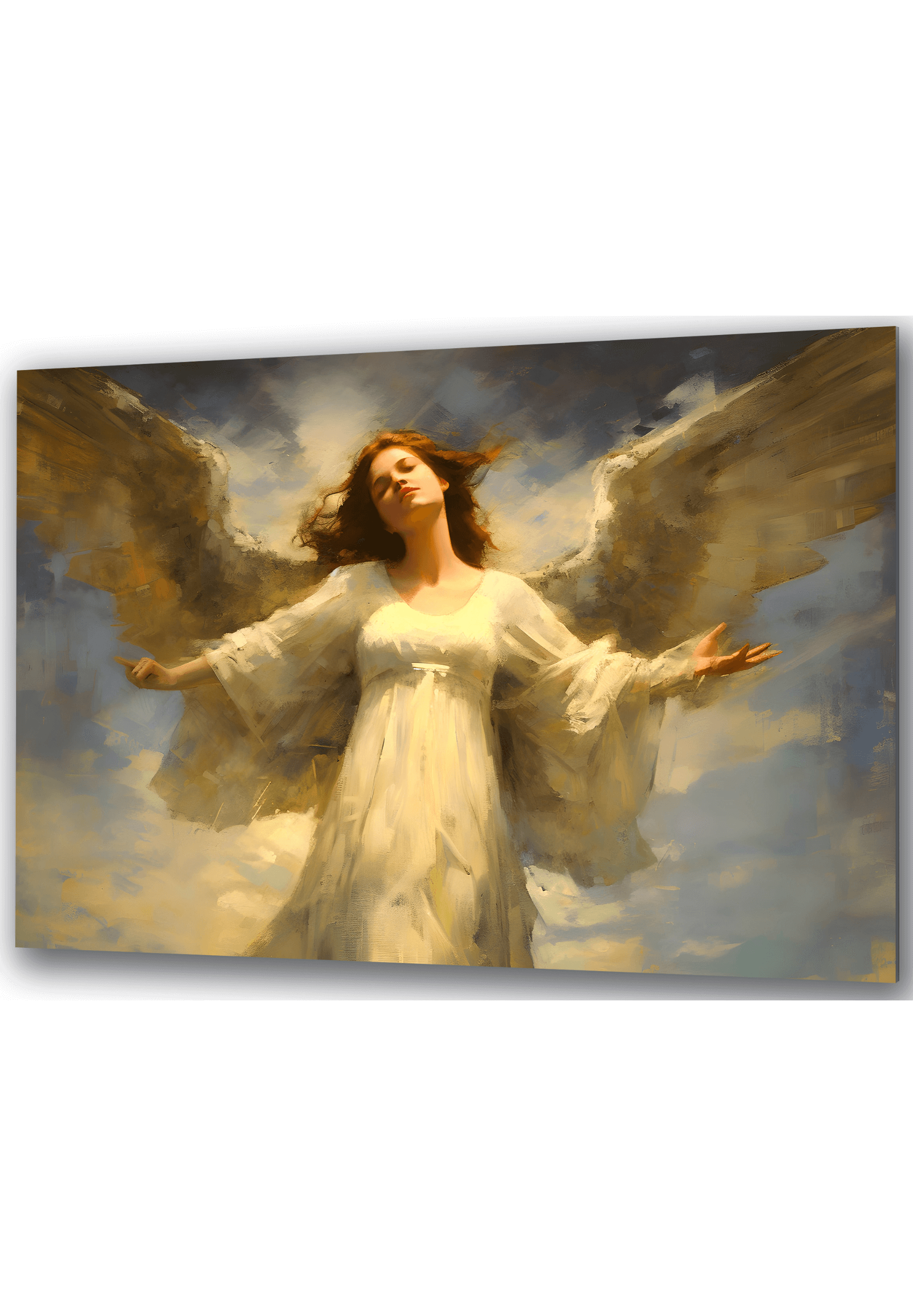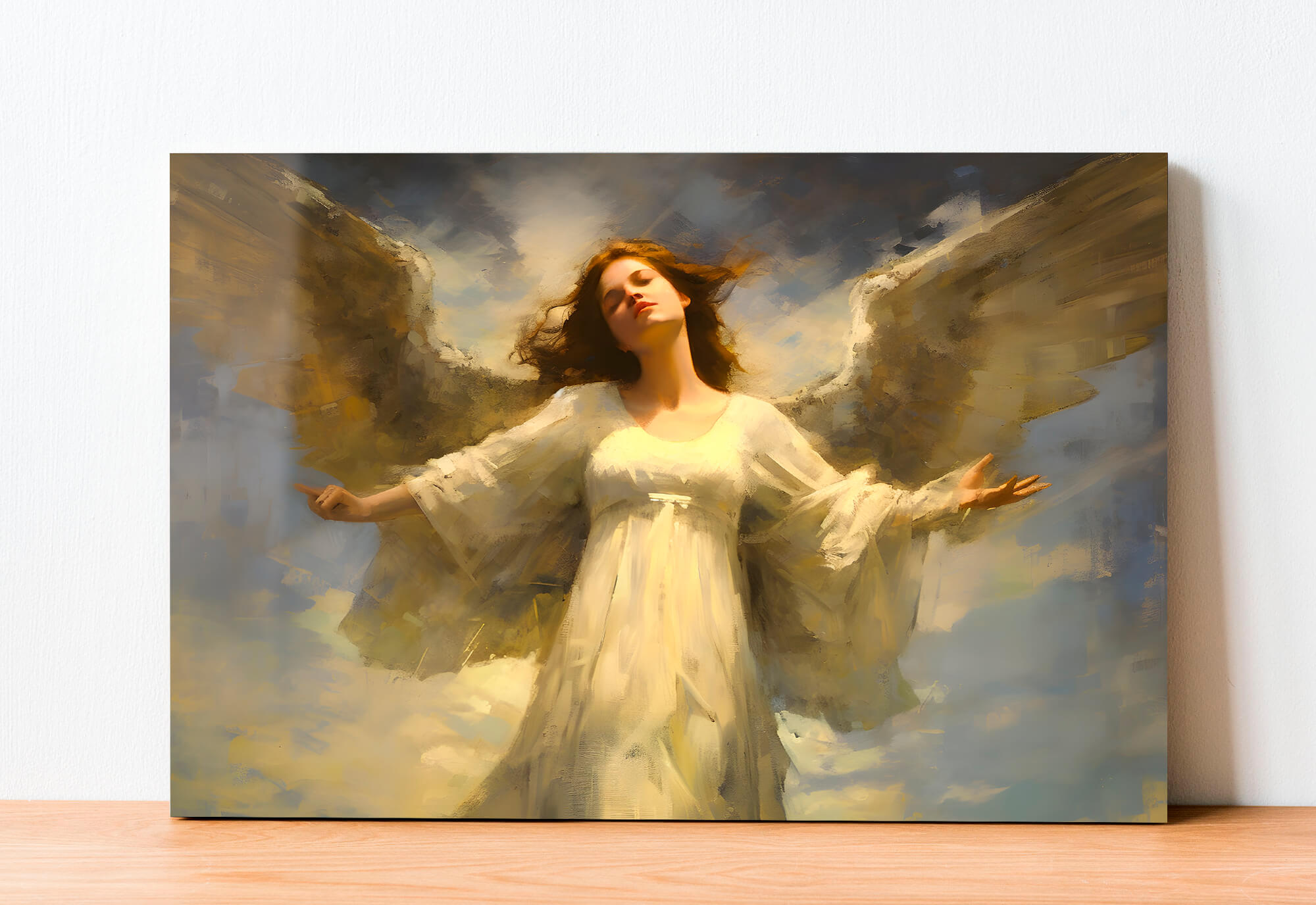 „Anielski blask” przedstawia anioła w śnieżnobiałej sukni rozpościerającego skrzydła na niebie, otoczonego światłem i chmurami. Jej twarz wyraża spokój i szlachetność, a lekkość jej ruchów sprawia wrażenie, jakby unosiła się w górę, wypełniając otaczającą ją przestrzeń atmosferą spokoju i harmonii. Anioł w tej kompozycji symbolizuje duchową siłę i inspirację. Obraz na szkle jest doskonałym wyborem dla tych, którzy szukają atmosfery spokoju, duchowej mocy oraz elegancji w swoim domu.