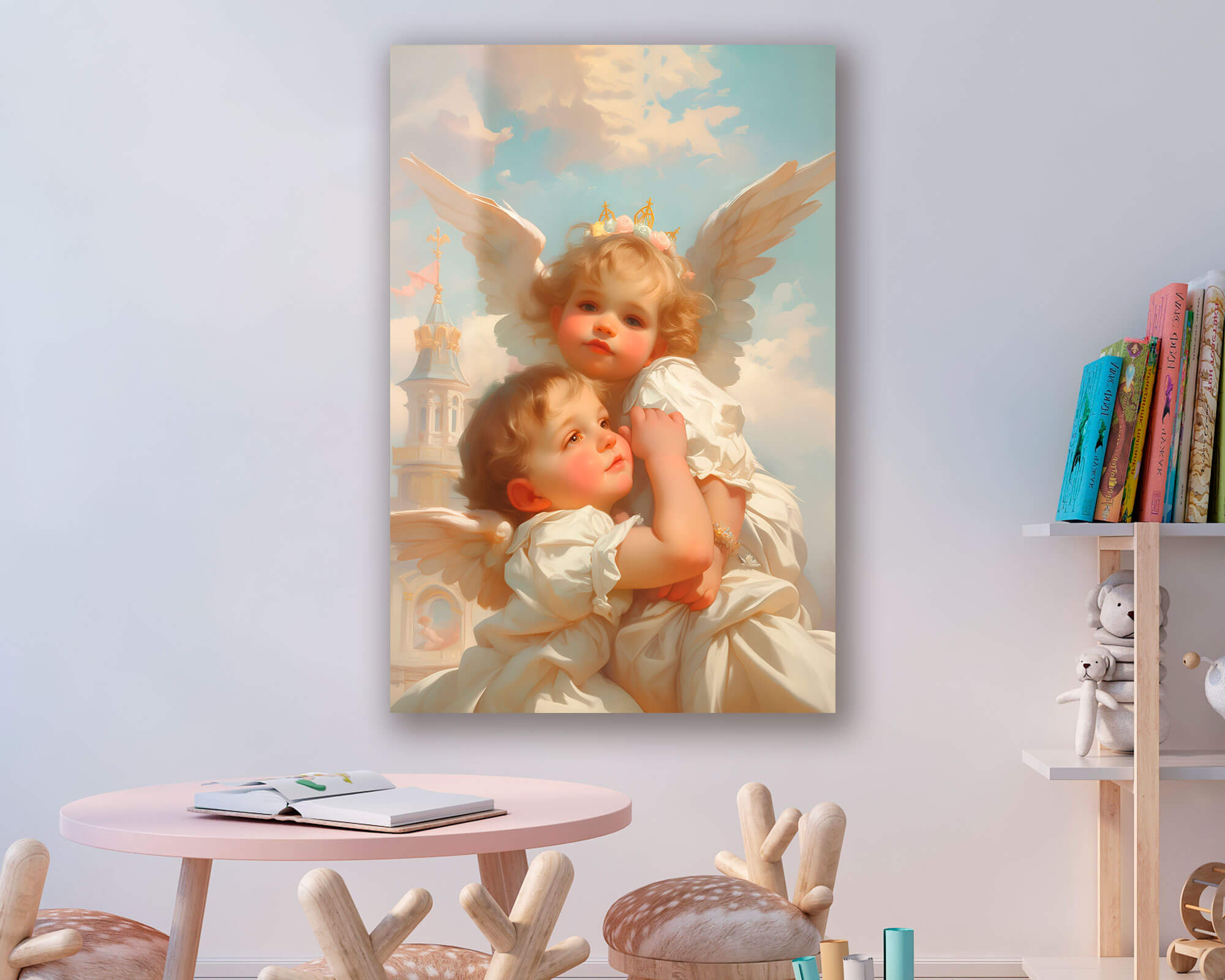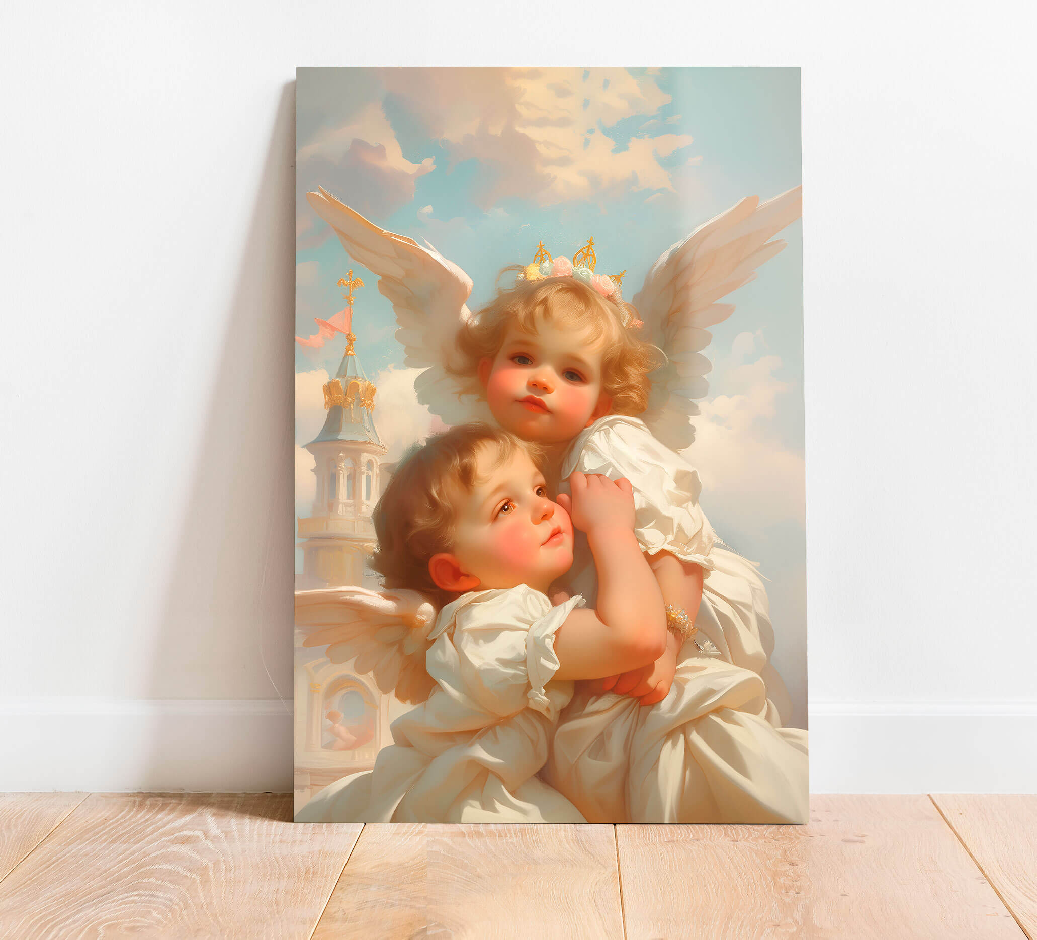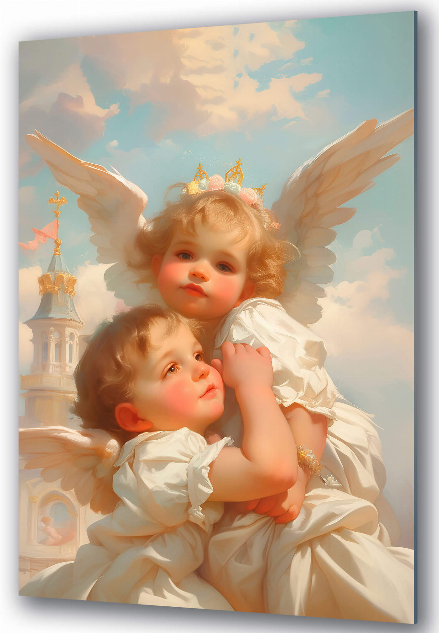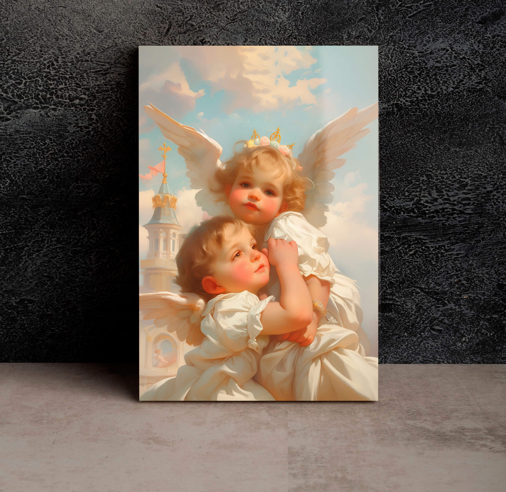 „Anioły w chmurach” to wzruszające dzieło sztuki, które wniesie delikatność i ciepło do Twojego wnętrza. Wizerunek dwóch aniołków obejmujących się nawzajem symbolizuje miłość, ochronę i harmonię. Delikatne pastelowe kolory i szczegółowe elementy tworzą niepowtarzalną atmosferę spokoju i elegancji.