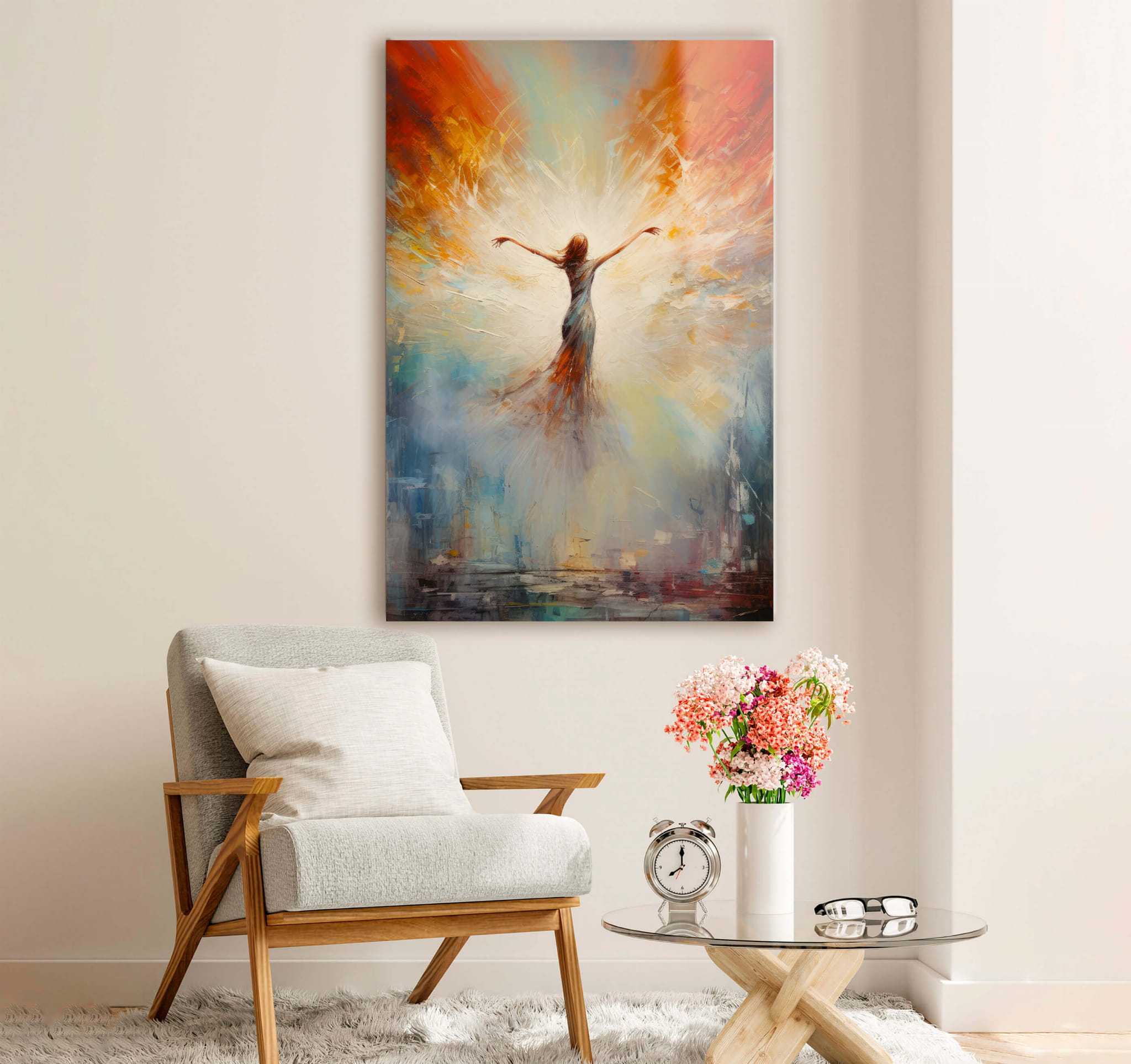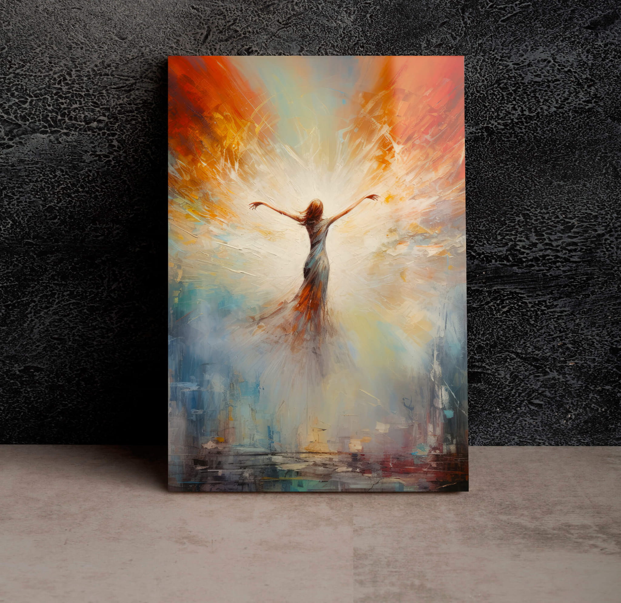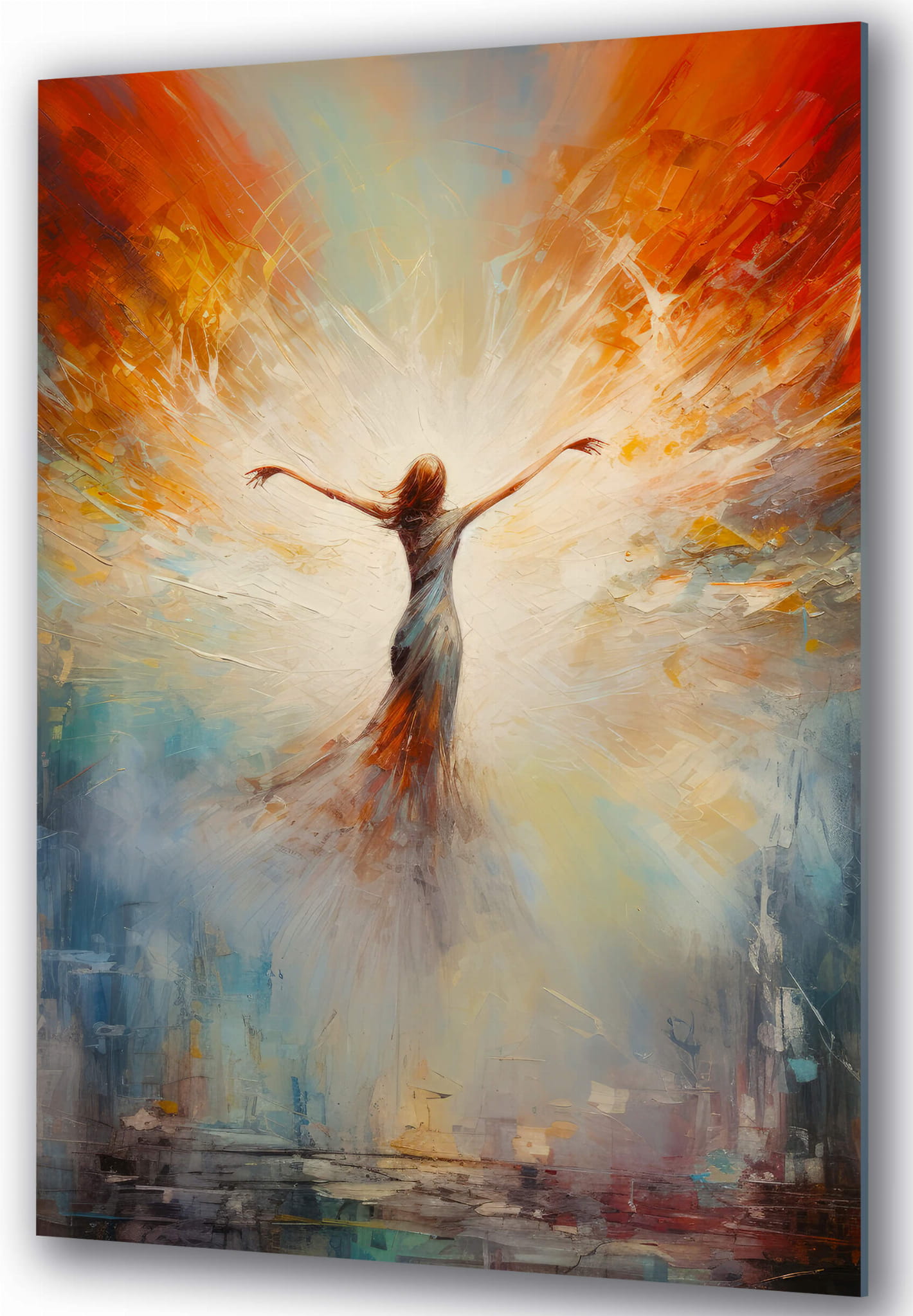 „Boskie Objawienie” przedstawia anioła z wyciągniętymi ramionami na tle nieba, tworząc atmosferę majestatu, światła i bezgranicznej wolności. Paleta kolorów obejmuje ciepłe odcienie pomarańczowego, żółtego i niebieskiego, przypominające zachód słońca, potęgując uczucie spokoju i inspiracji. To piękne przedstawienie anioła w ruchu symbolizuje nadzieję, siłę i duchowe podniesienie.