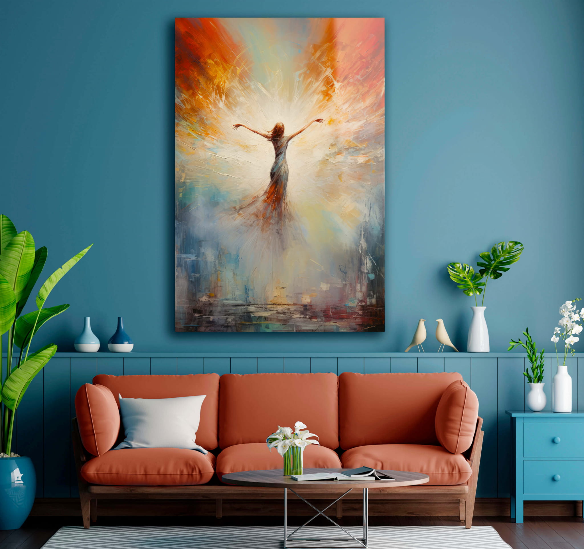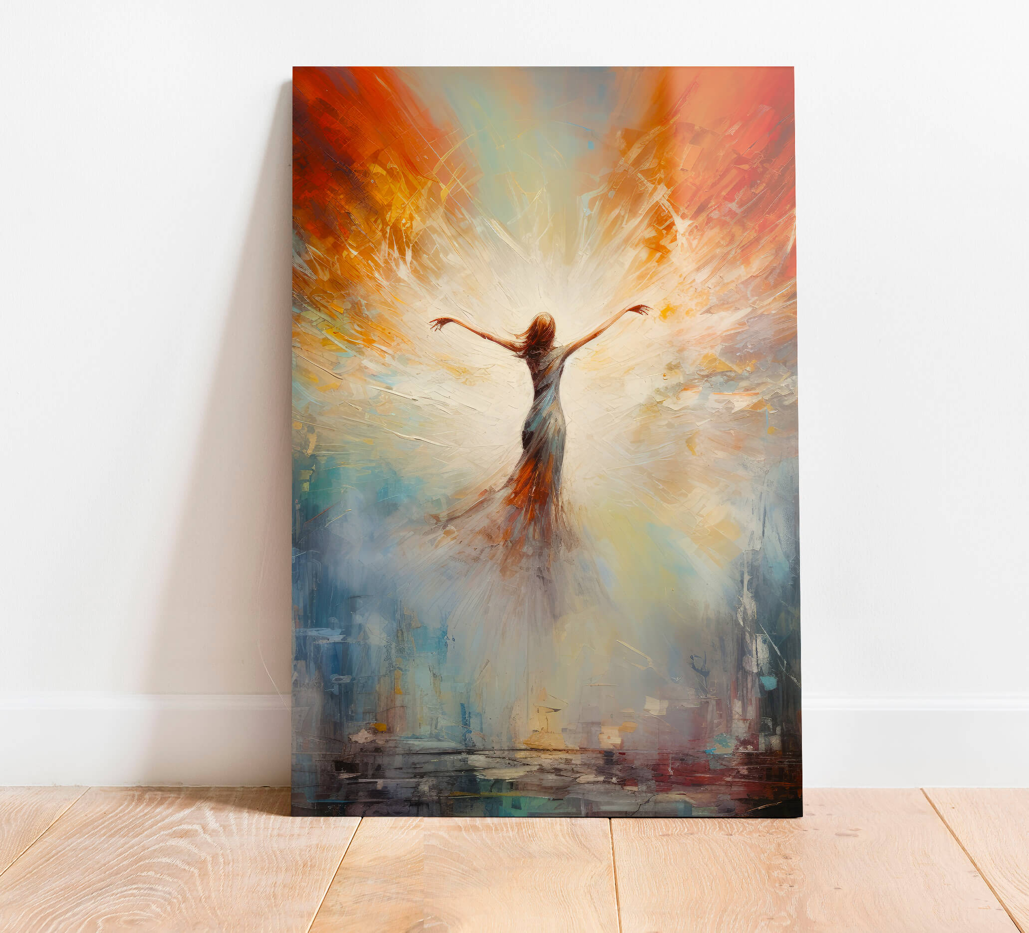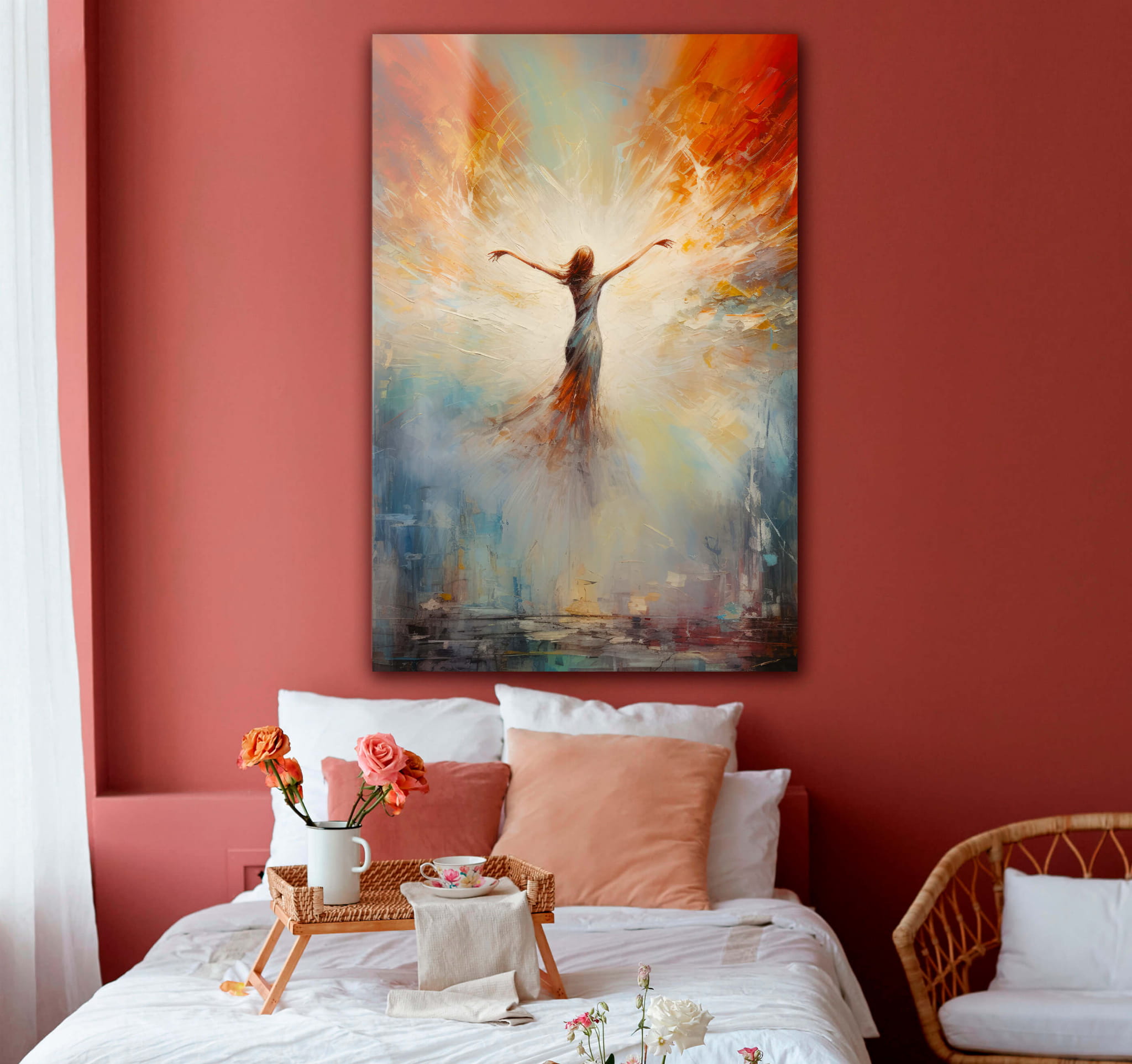 „Boskie Objawienie” przedstawia anioła z wyciągniętymi ramionami na tle nieba, tworząc atmosferę majestatu, światła i bezgranicznej wolności. Paleta kolorów obejmuje ciepłe odcienie pomarańczowego, żółtego i niebieskiego, przypominające zachód słońca, potęgując uczucie spokoju i inspiracji. To piękne przedstawienie anioła w ruchu symbolizuje nadzieję, siłę i duchowe podniesienie.