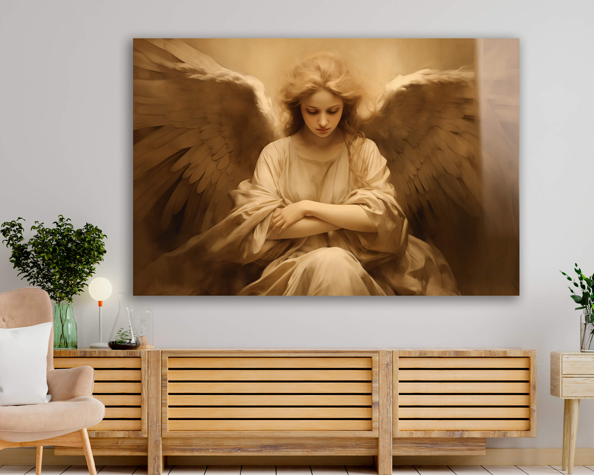 „Cisza Anioła” to wyrafinowane połączenie duchowości i sztuki, które wprowadza do przestrzeni atmosferę harmonii, spokoju i refleksji. Wizerunek anioła pogrążonego w myślach symbolizuje czystość, ochronę i inspirację. Jego łagodny wygląd i skierowane w dół spojrzenie wywołują poczucie spokoju i szacunku.