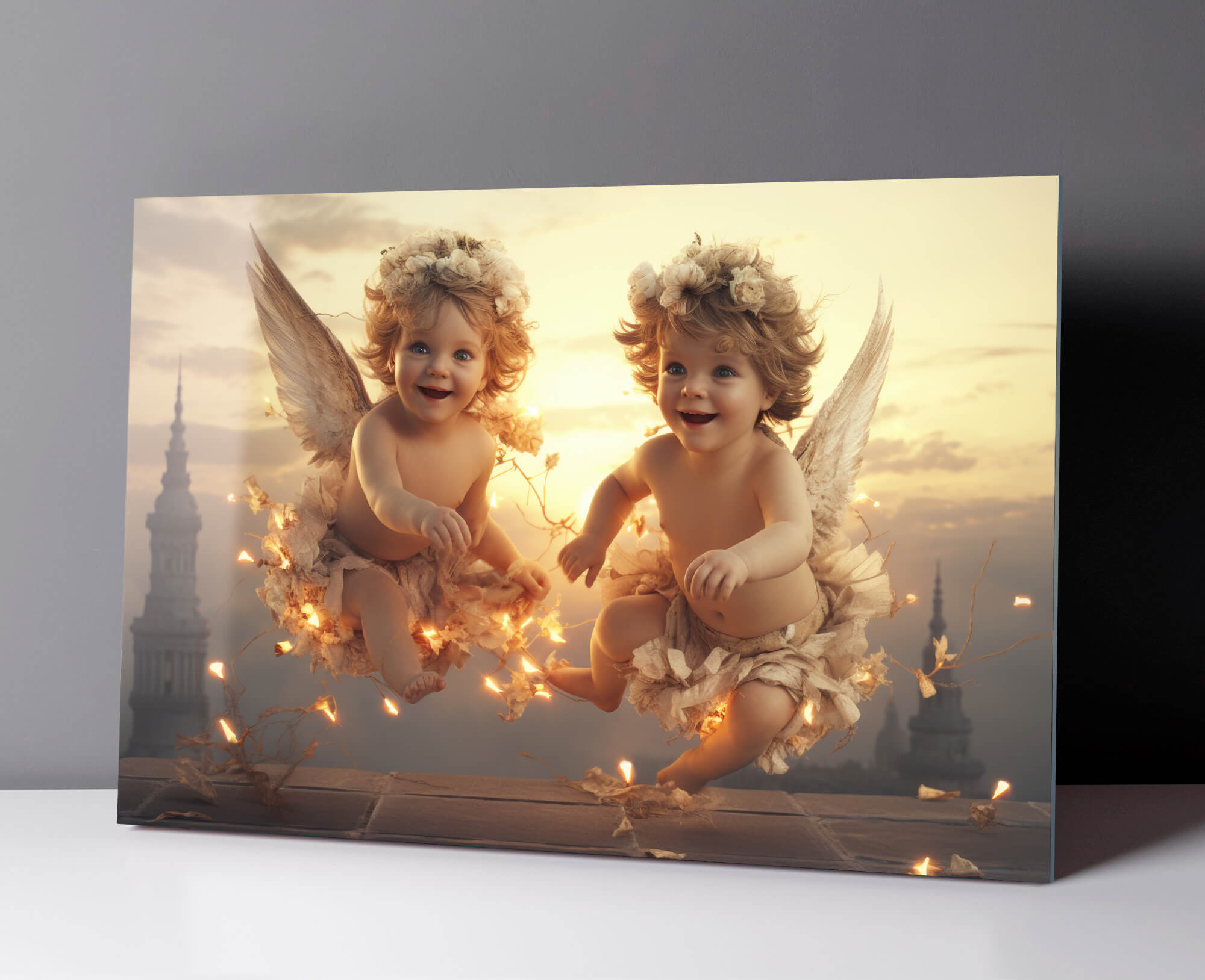 Ciepłe kolory w połączeniu z magicznym blaskiem i ciepłymi odcieniami nadają obrazowi wyjątkowej lekkości i ciepła. Dzięki zastosowaniu nowoczesnej technologii druku na szkle, obraz wyróżnia się wyrazistością detali i trwałością kolorów. Jego błyszcząca powierzchnia dodaje elegancji i sprawia, że obraz będzie piękną ozdobą każdego wnętrza. „Radosne aniołki” będzie idealnym dodatkiem do Twojego domu, wprowadzając do niego atmosferę spokoju, miłości i radości. Będzie również wspaniałym prezentem dla najbliższych, przepełnionym pozytywną energią i nadzieją.