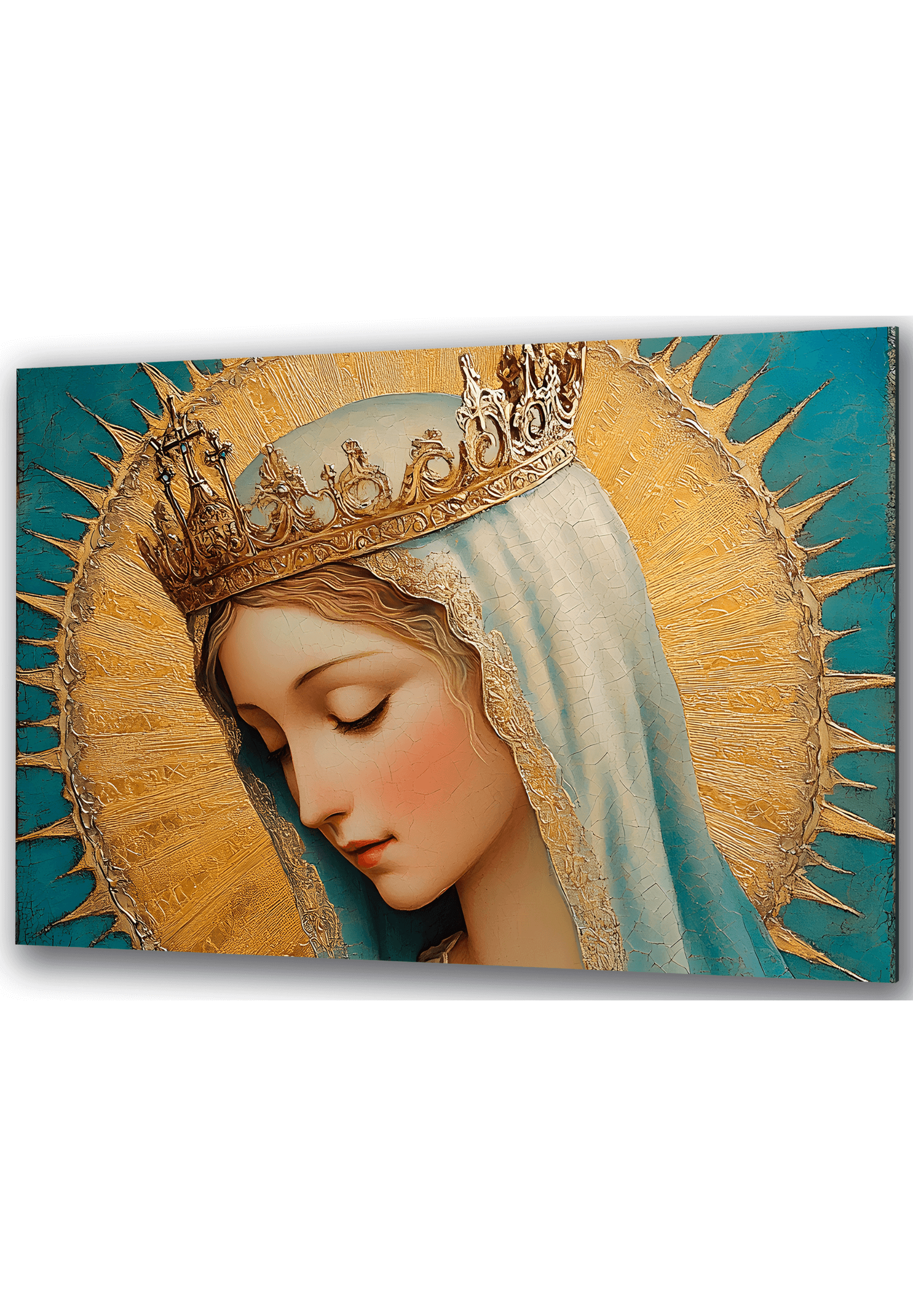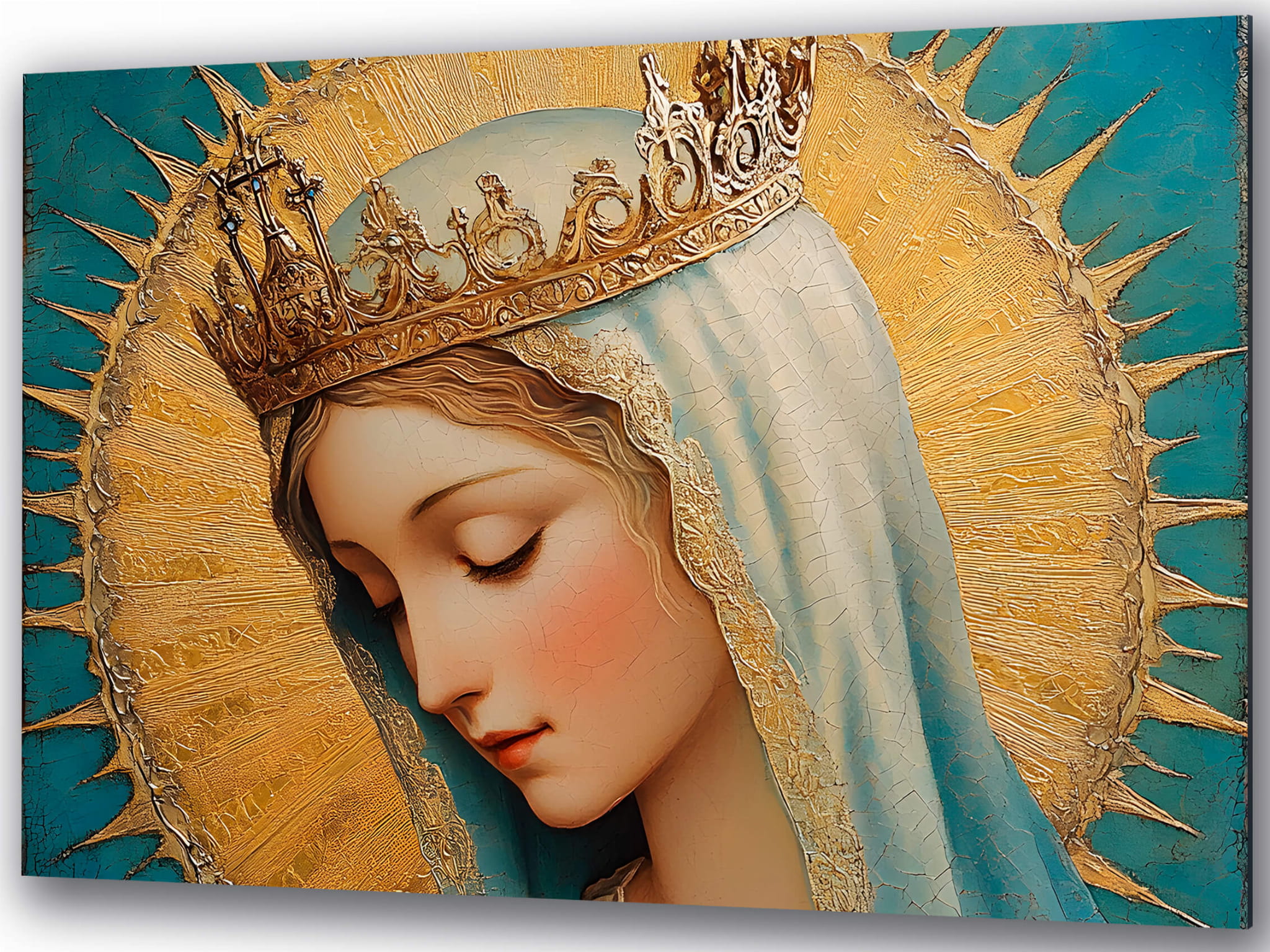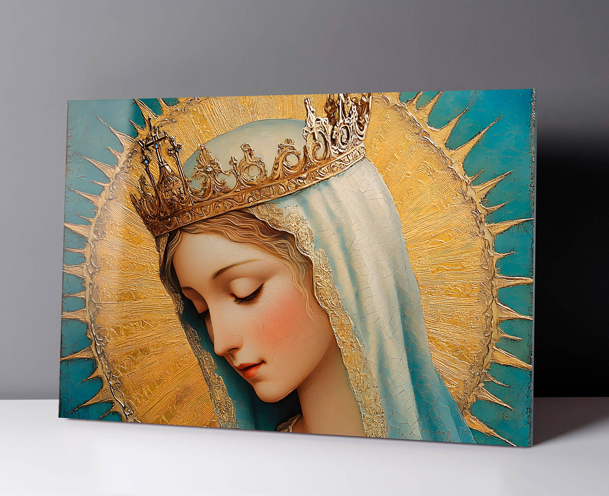 „Matka Boska Królowa Niebios”. Ten elegancki obraz na szkle jest symbolem ochrony, duchowej łaski i miłości. Wizerunek Matki Boskiej, Królowej Rodziny, w złotej koronie emanuje spokojem i majestatem. Jej spuszczony wzrok i łagodny wyraz twarzy symbolizują pokorę, mądrość i matczyną miłość.