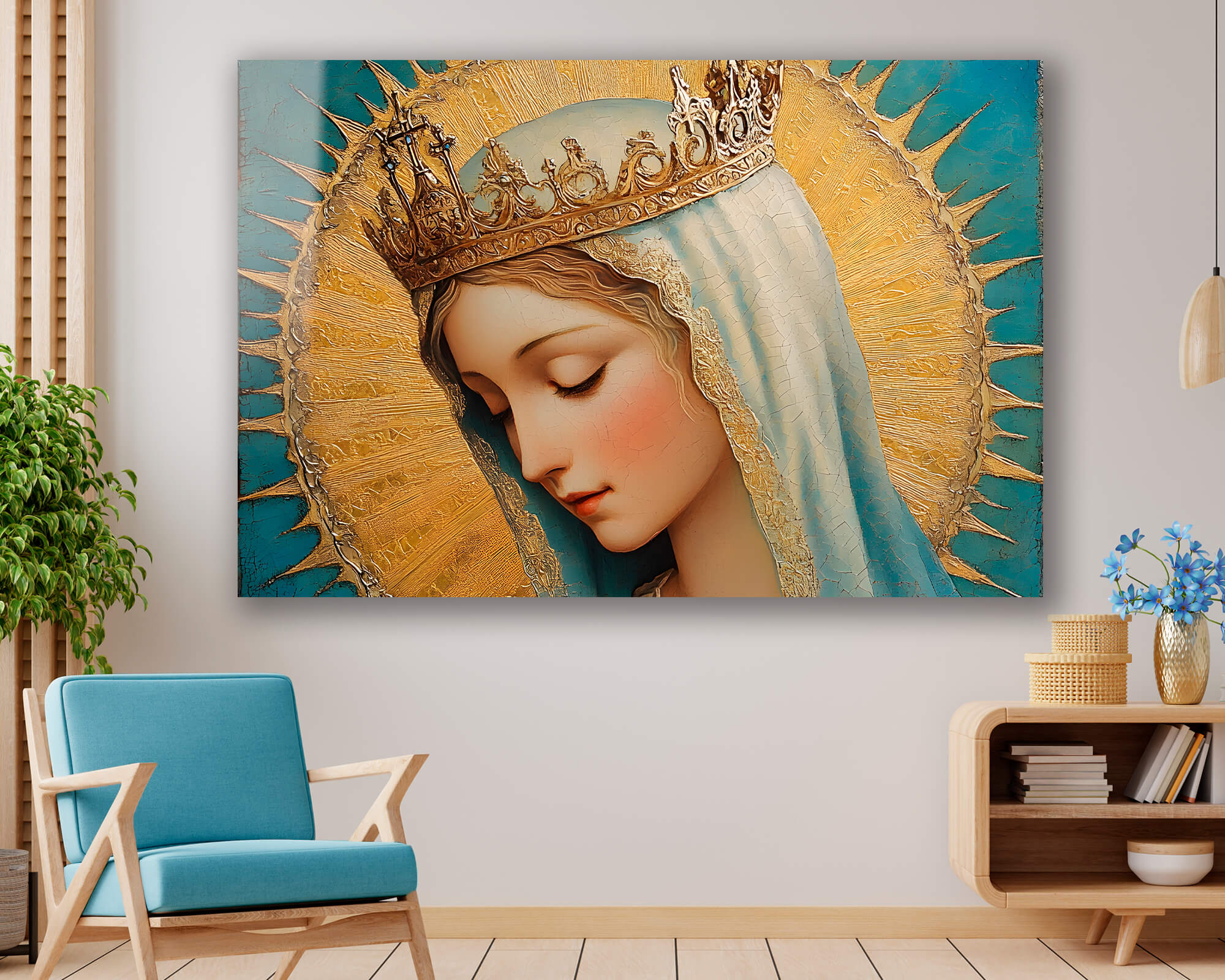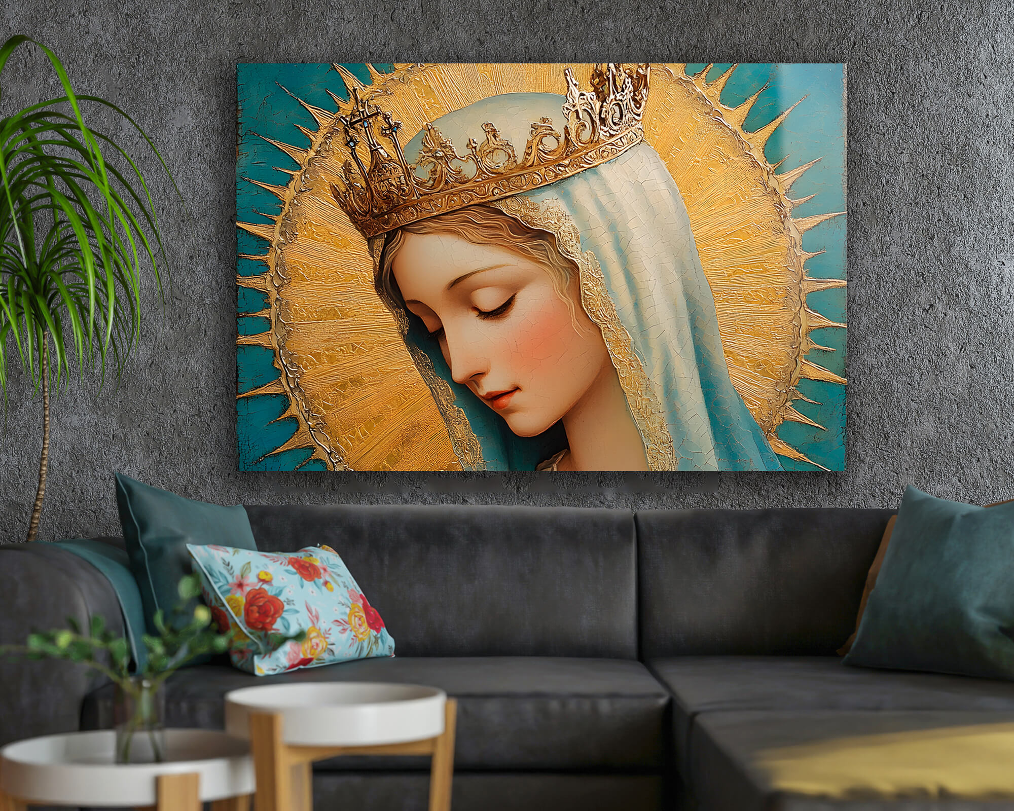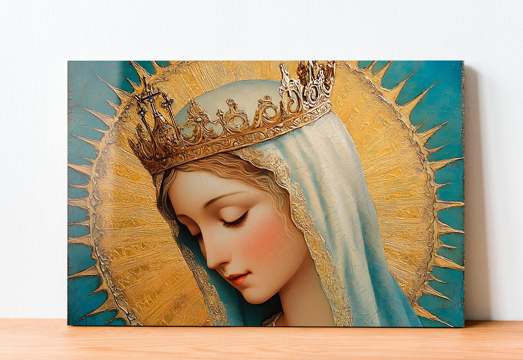 „Matka Boska Królowa Niebios”. Ten elegancki obraz na szkle jest symbolem ochrony, duchowej łaski i miłości. Wizerunek Matki Boskiej, Królowej Rodziny, w złotej koronie emanuje spokojem i majestatem. Jej spuszczony wzrok i łagodny wyraz twarzy symbolizują pokorę, mądrość i matczyną miłość.