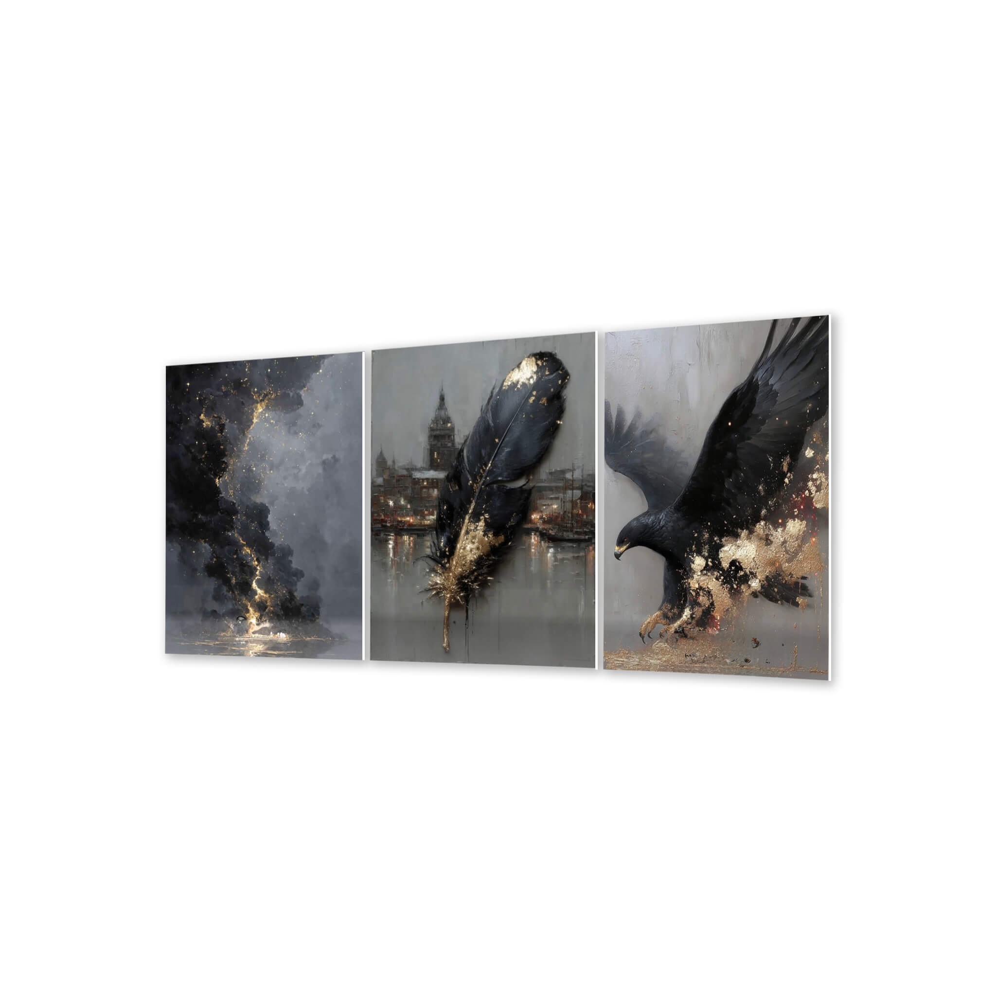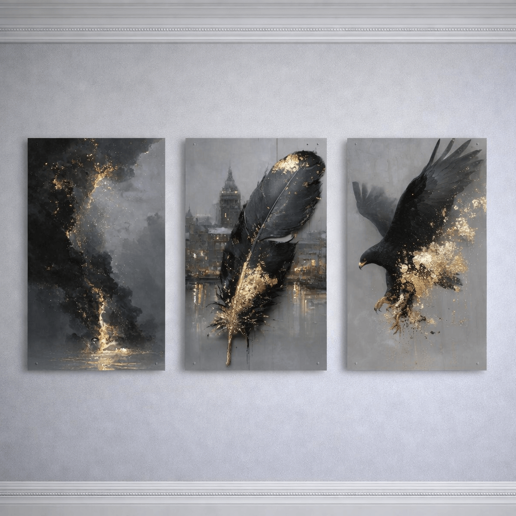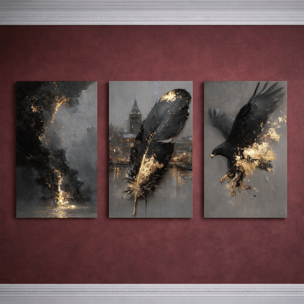 „Tryptyk Czarny orzeł, pióro i abstrakcja” to wyrazista i nowoczesna kompozycja, która łączy symbolikę siły, wolności i elegancji z abstrakcyjną formą. Dynamiczny wizerunek czarnego orła, zestawiony z motywem pióra i artystycznym tłem, tworzy spójną całość o wyjątkowym, luksusowym charakterze. Obraz na szkle zachwyca głębią kolorów oraz efektownymi detalami, które przyciągają wzrok i nadają wnętrzu indywidualnego stylu.