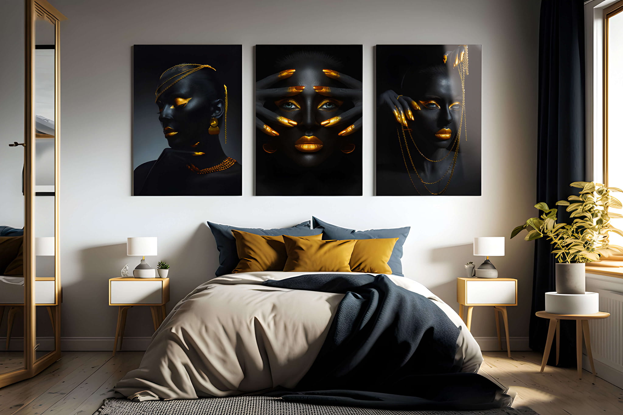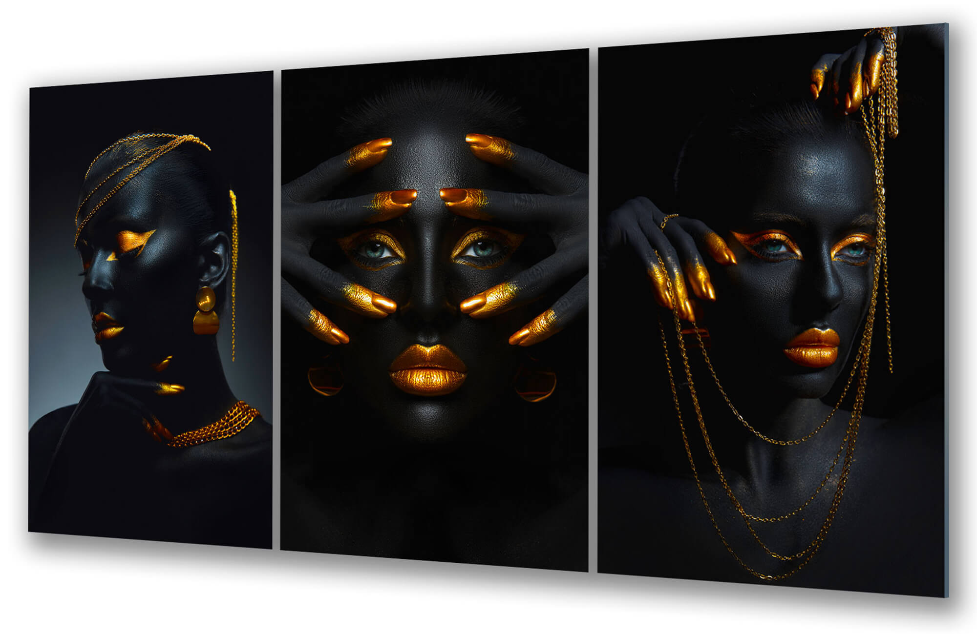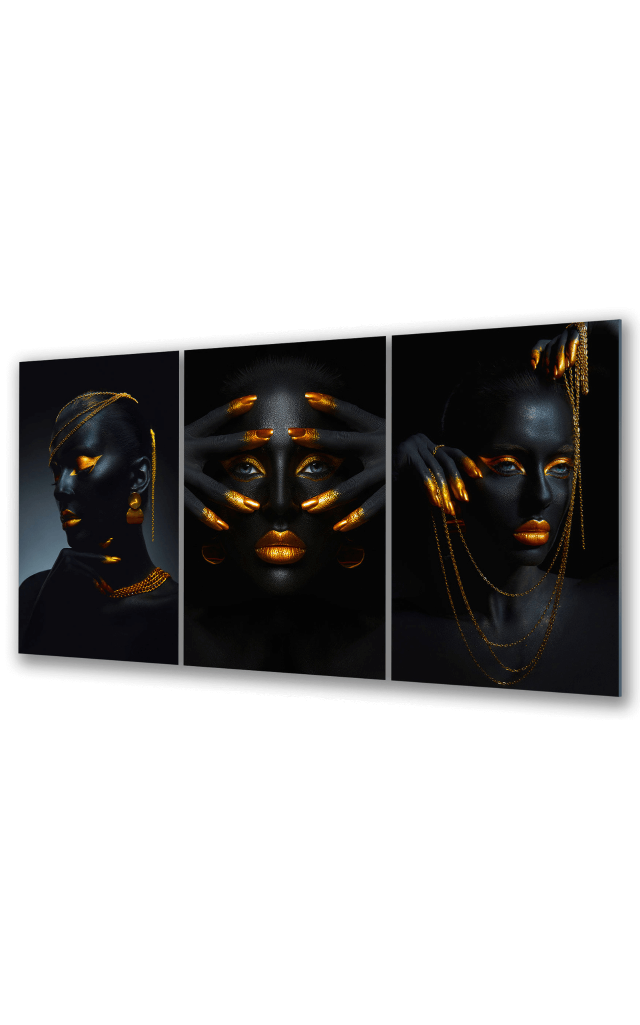 Dom • Katalog • OBRAZY NA SZKLE • TRYPTYKI 3W1 • Obraz na szkle Tryptyk Złota Bogini – Siła i Piękno
