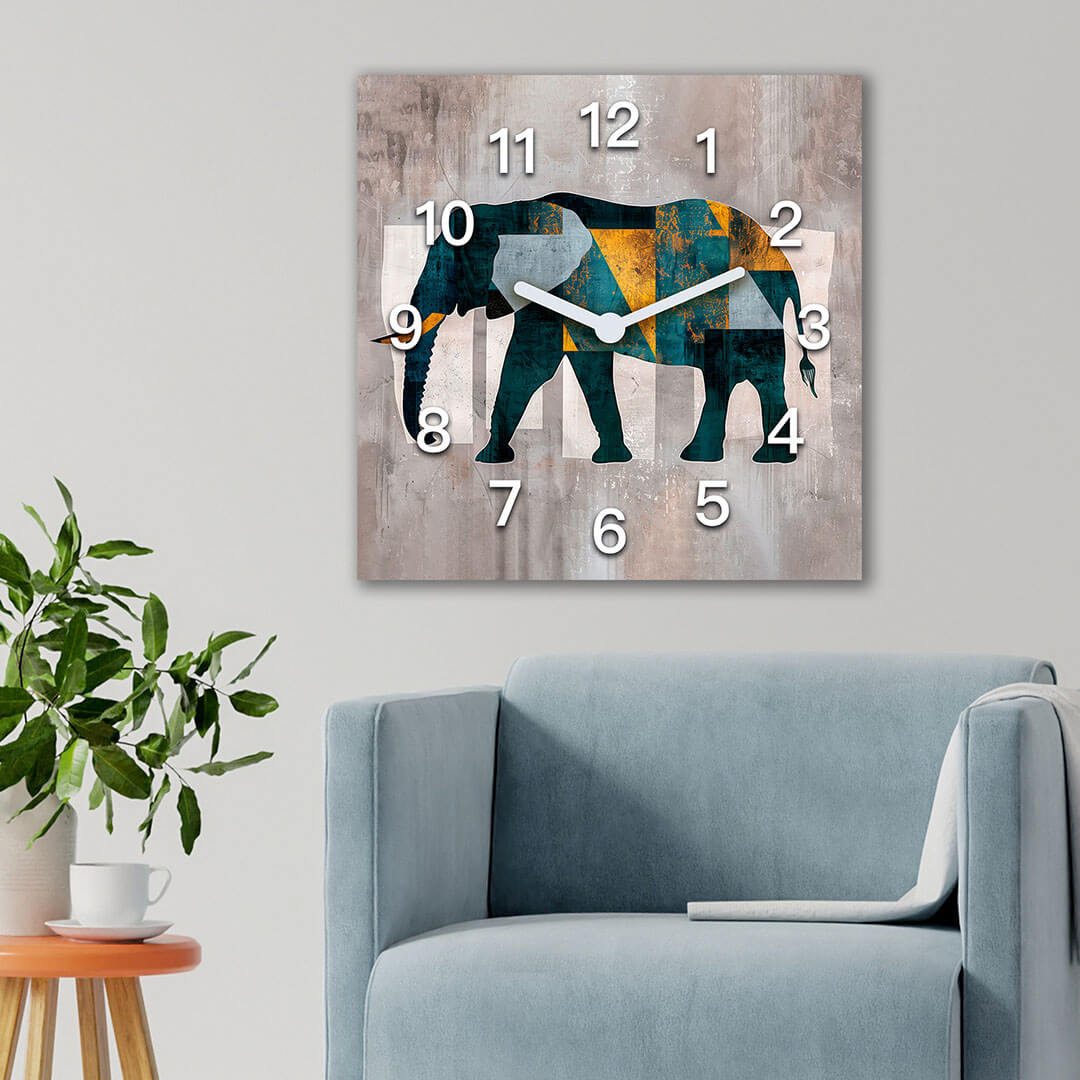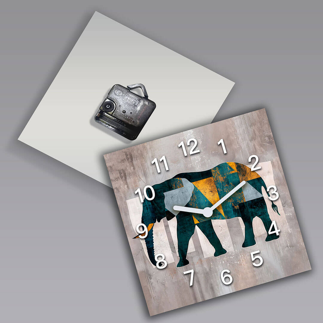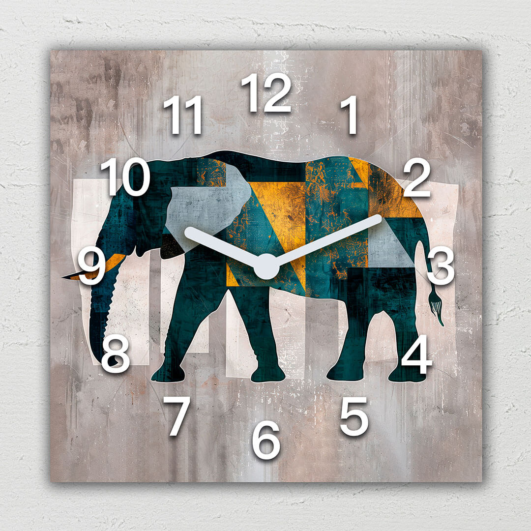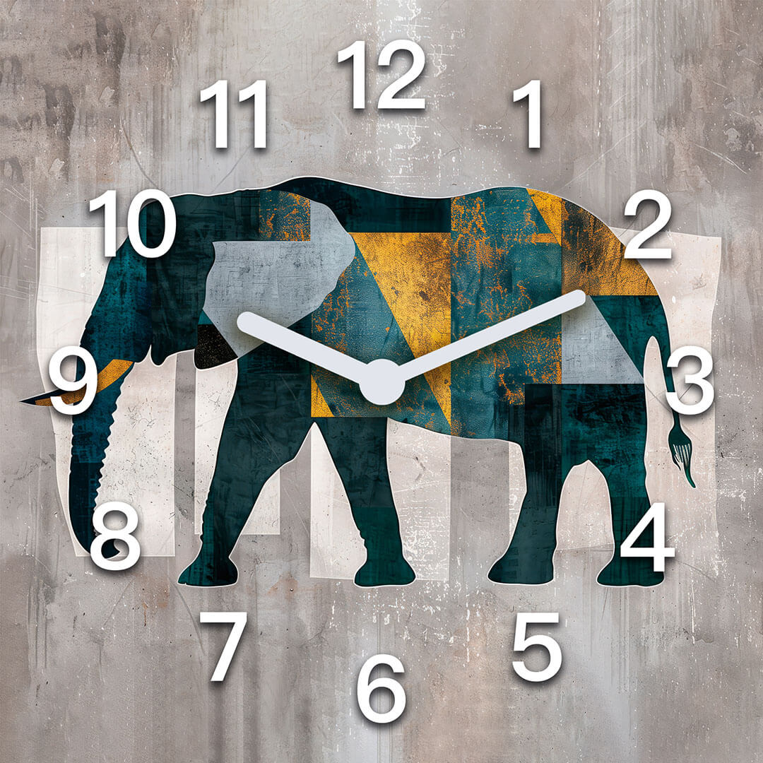 „Abstrakcyjny słoń”. Ten zegar ścienny łączy w sobie nowoczesny design z elementami natury, przedstawiając sylwetkę słonia w geometrycznych kształtach i intensywnych kolorach. Zastosowanie odcieni zieleni, żółci i niebieskiego, na tle surowej tekstury, tworzy wyjątkowy efekt wizualny, podkreślając siłę i majestat tego zwierzęcia. Białe cyfry na tle geometrycznym wyraźnie wyróżniają się, nadając zegarowi nowoczesny wygląd. Zegar doskonale pasuje do wnętrz, w których liczy się kreatywność i indywidualny styl, takich jak salony, biura czy przestrzenie artystyczne, wnosząc do nich unikalny akcent inspirowany naturą.