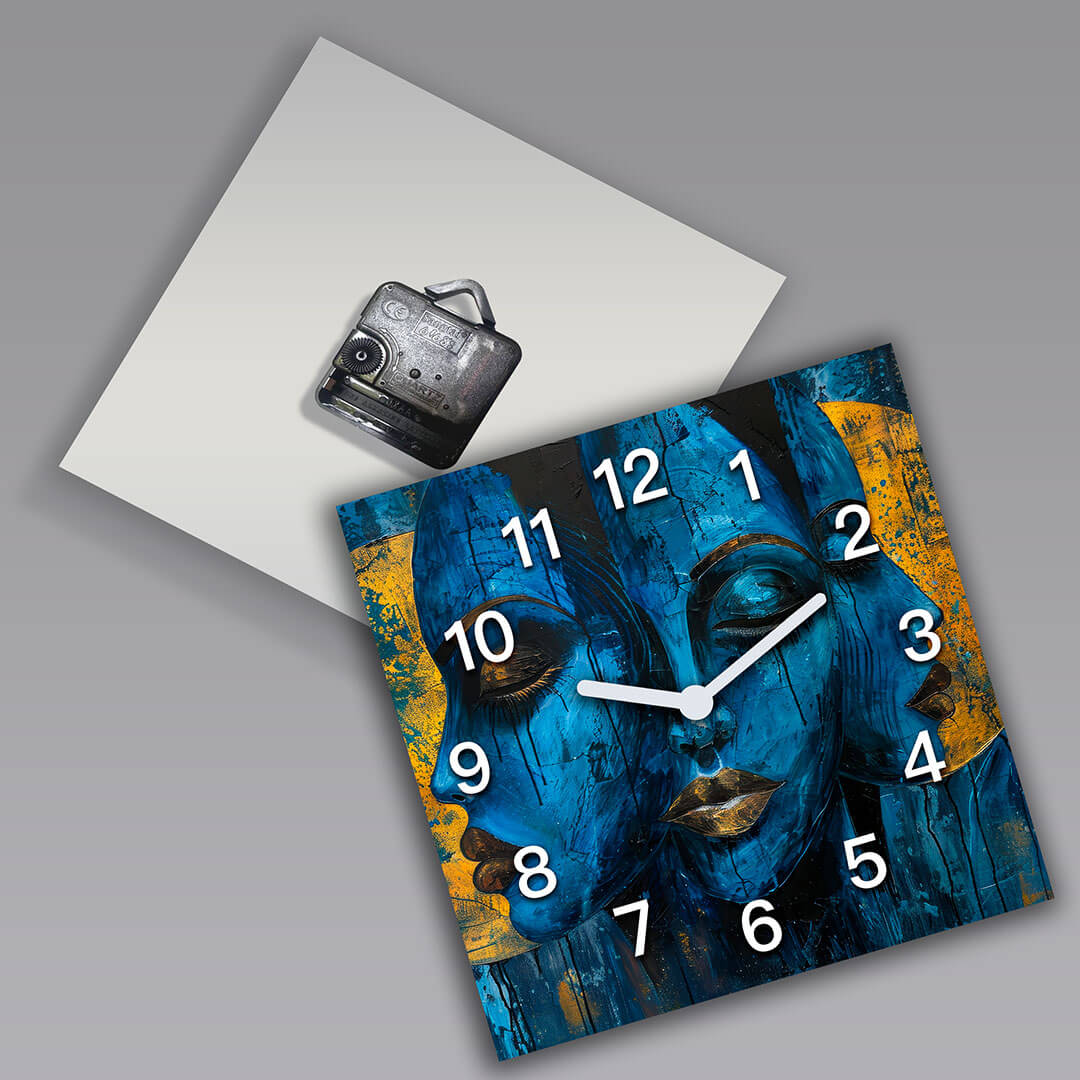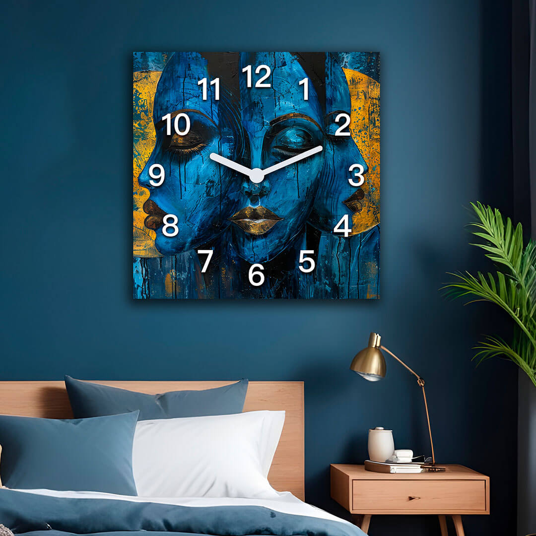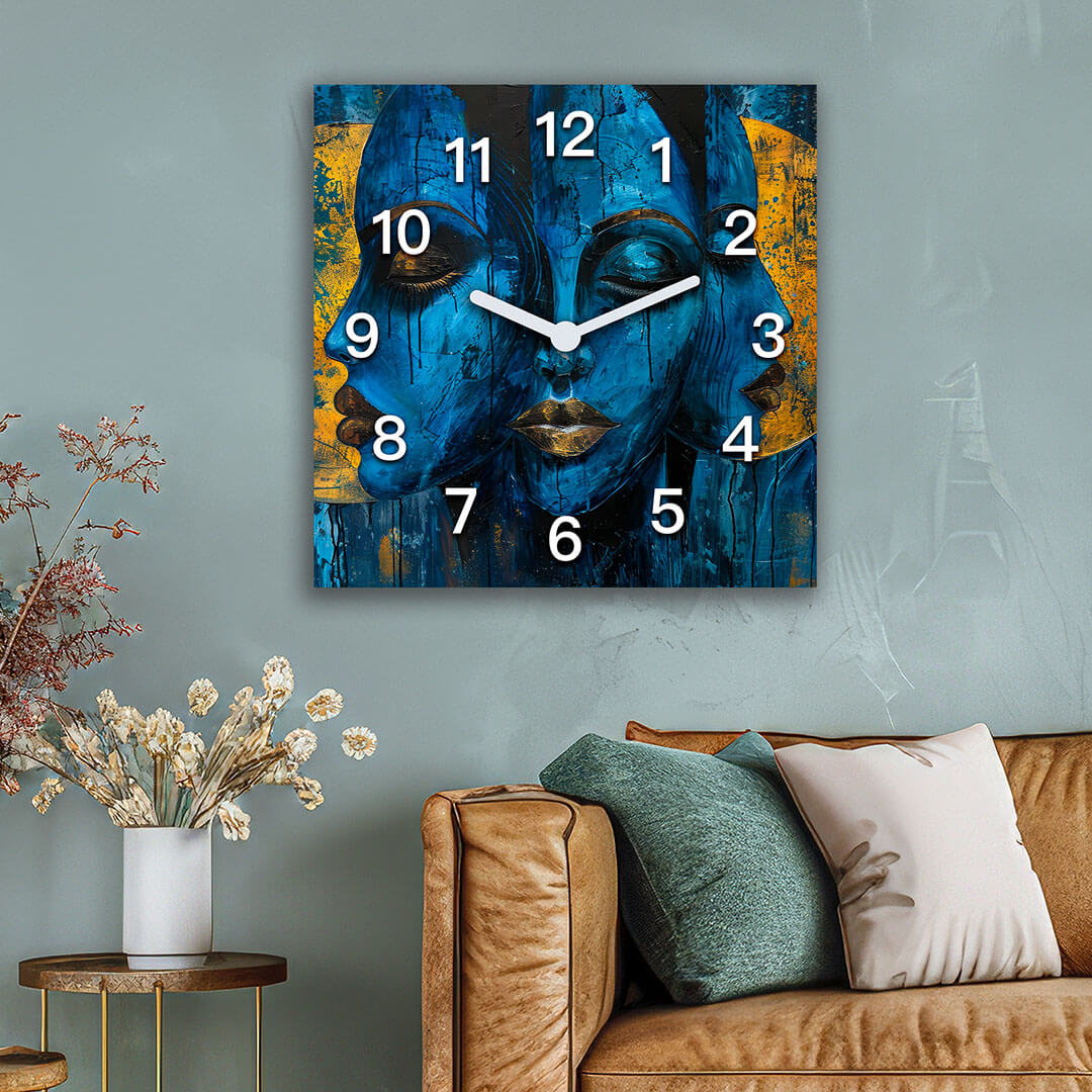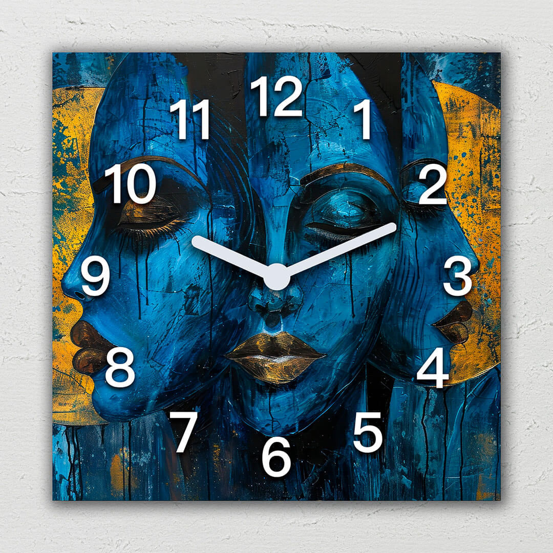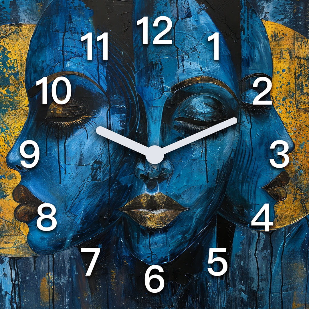„Afrykańska sztuka”. Ten zegar ścienny przedstawia artystyczny obraz trzech twarzy w intensywnych niebieskich odcieniach, symbolizujących różne perspektywy rzeczywistości. Złote akcenty na twarzach oraz tło w odcieniach żółci i czerni tworzą kontrast i podkreślają głębię obrazu. Charakterystyczne białe cyfry wyróżniają się na tle, podkreślając nowoczesny charakter zegara. Zegar doskonale komponuje się z współczesnymi wnętrzami, takimi jak salony, biura czy przestrzenie artystyczne, wnosząc niepowtarzalną artystyczną atmosferę i odzwierciedlając różne punkty widzenia.